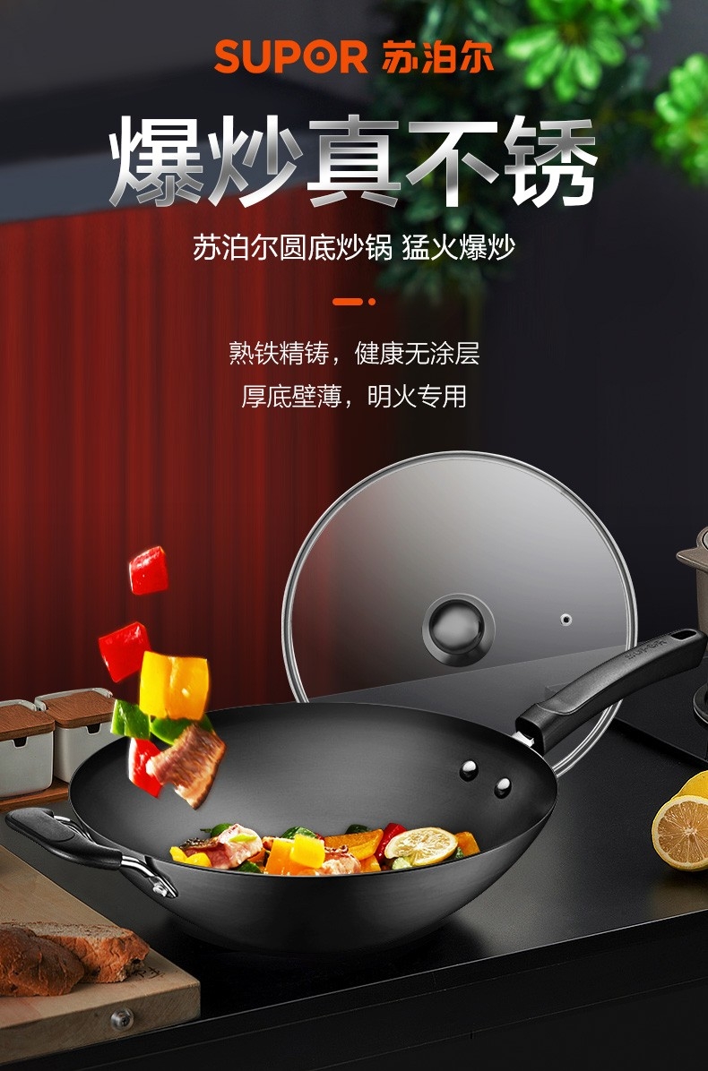 苏泊尔 34cm真不锈爆炒铁锅FC34T24