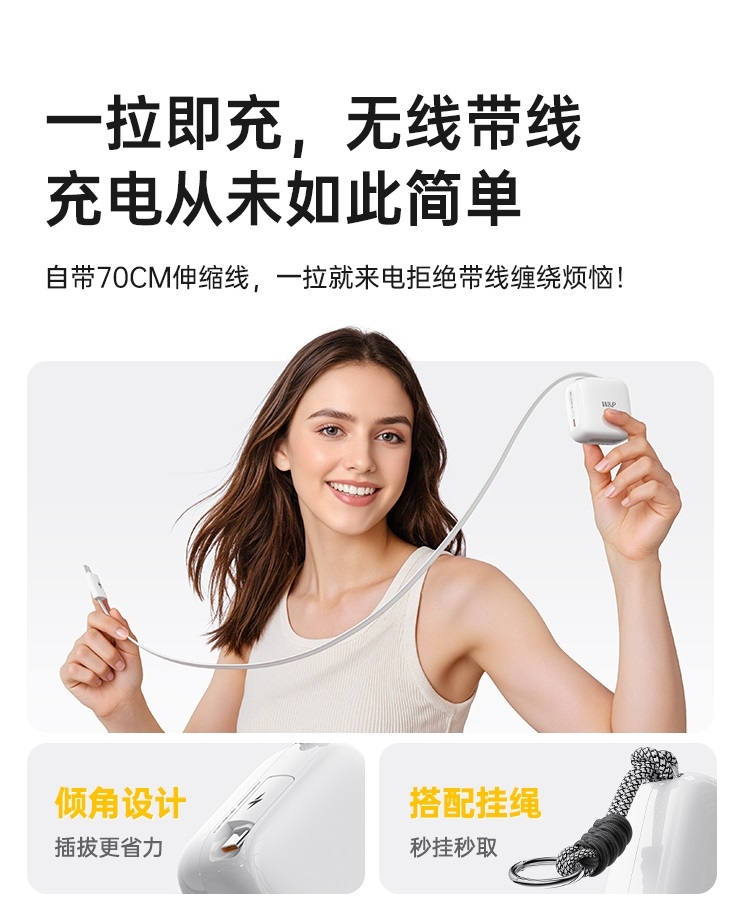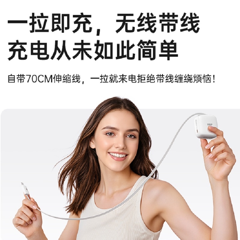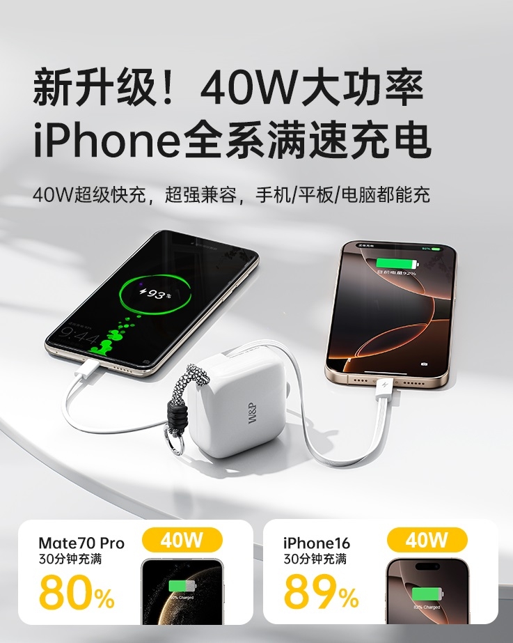 40W超大功率,体积小巧轻便;带70cm自由伸缩C口快充线,一拉即充;国家3C认证,放心上机