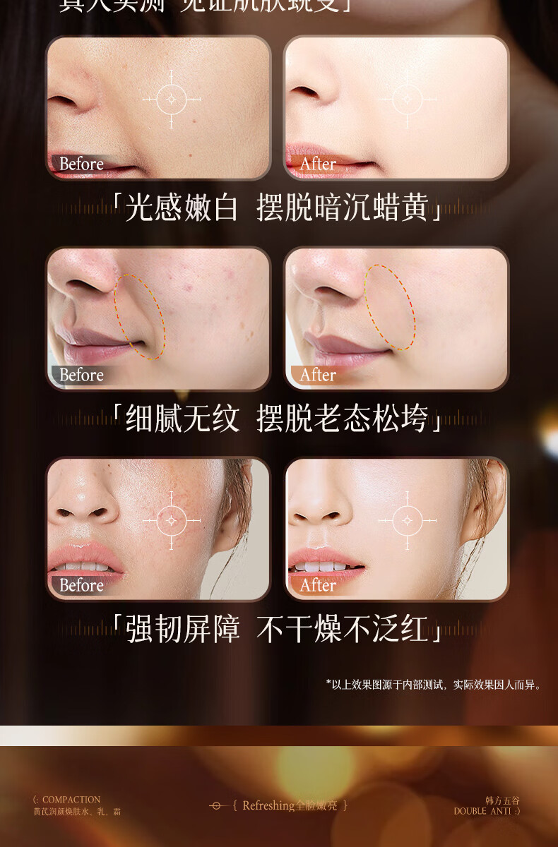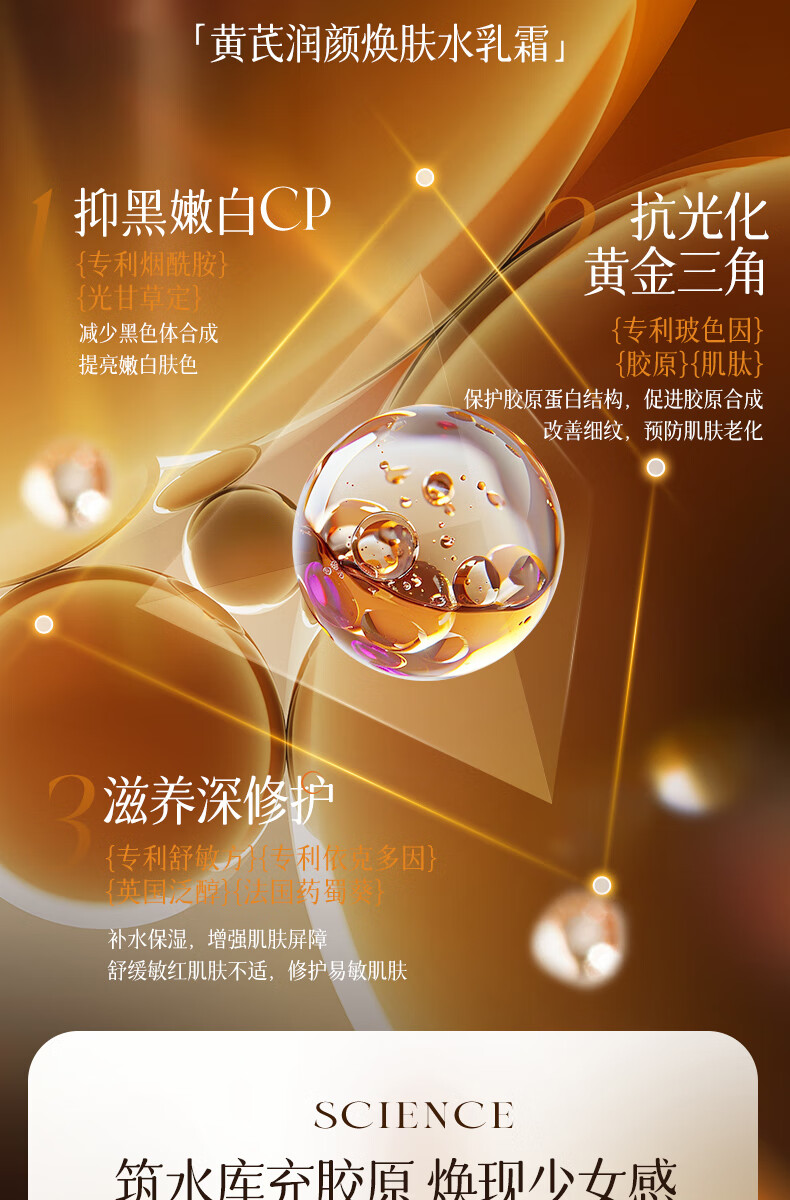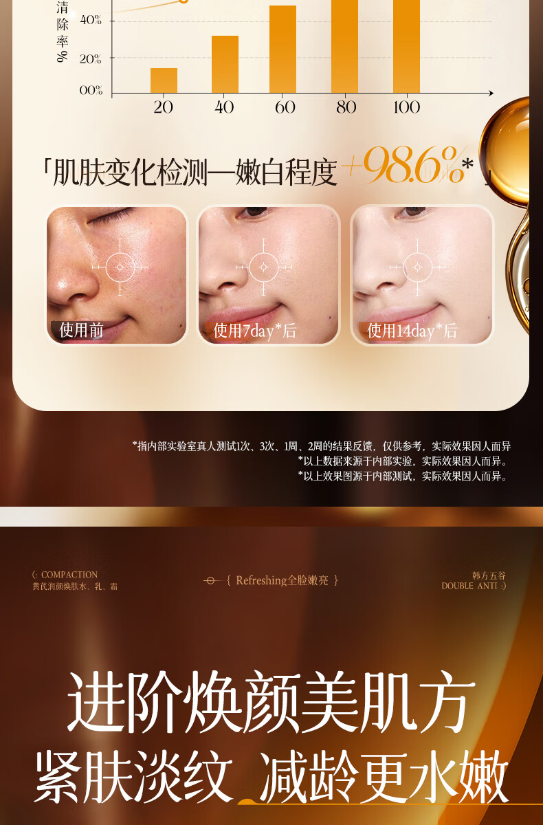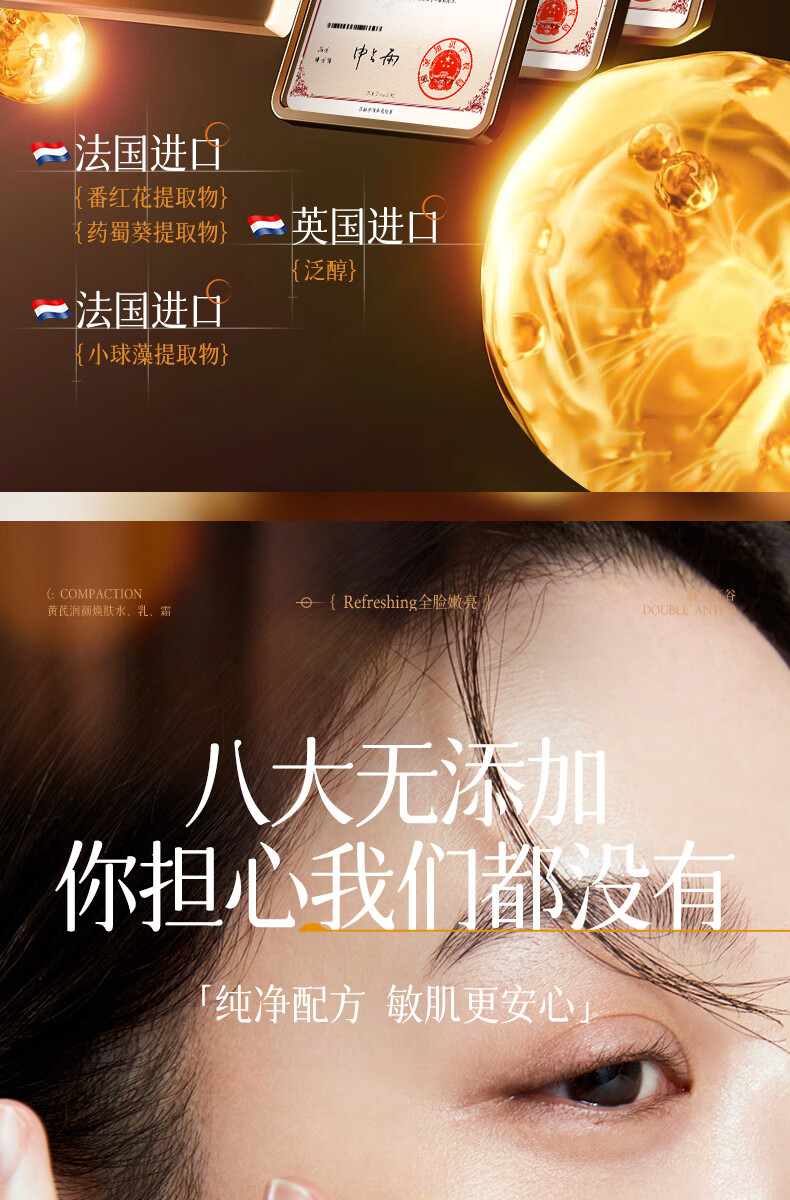 补水亮保湿;淡黄提亮抗皱紧致;男女护肤品