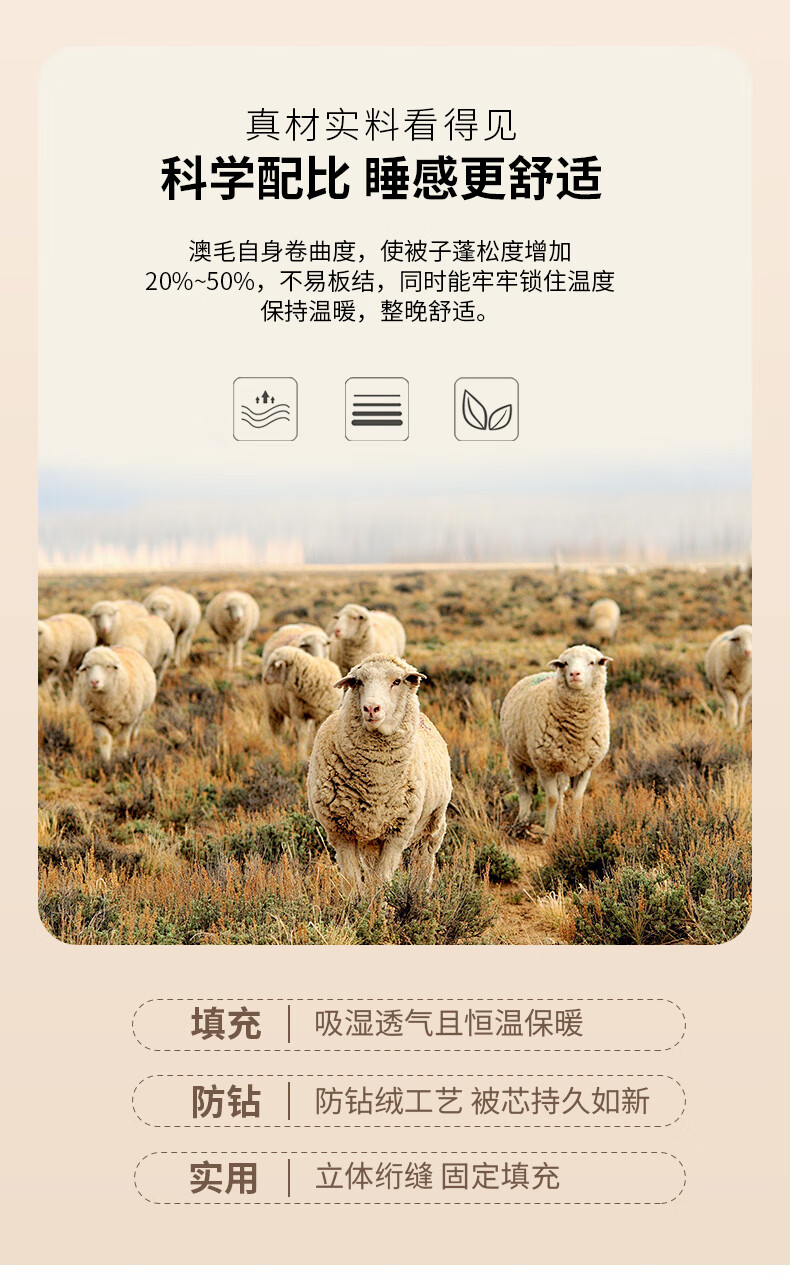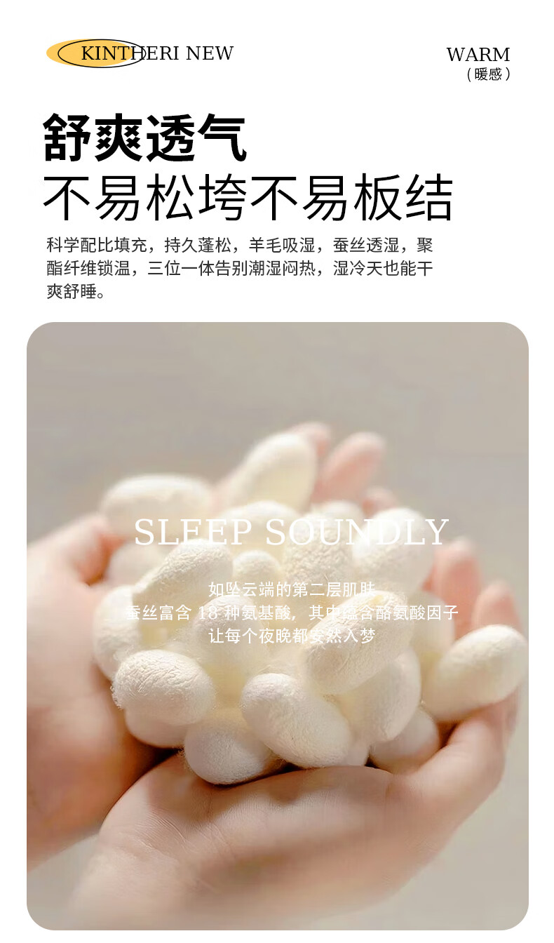 填充:25%蚕丝(中长丝)+30%澳洲羊毛+ 45%聚酯纤维