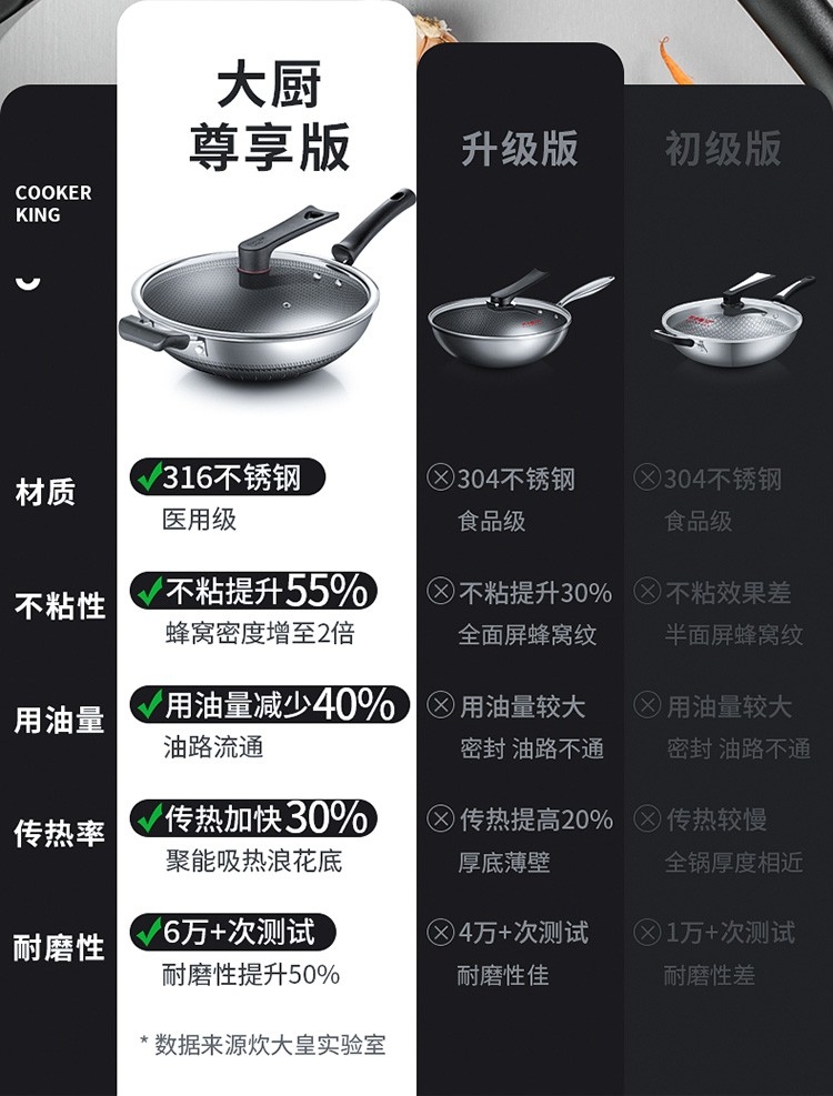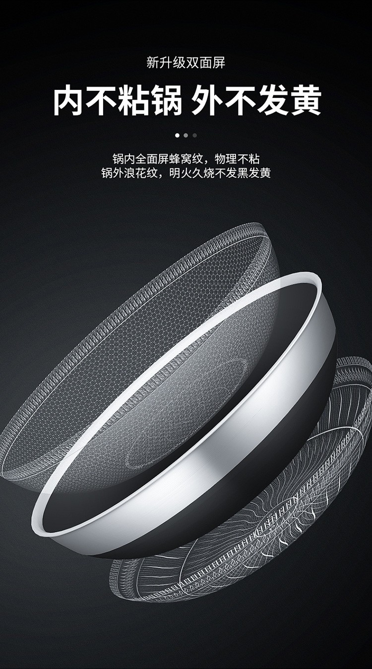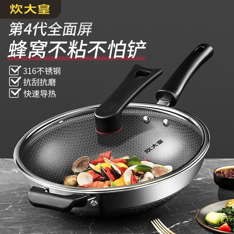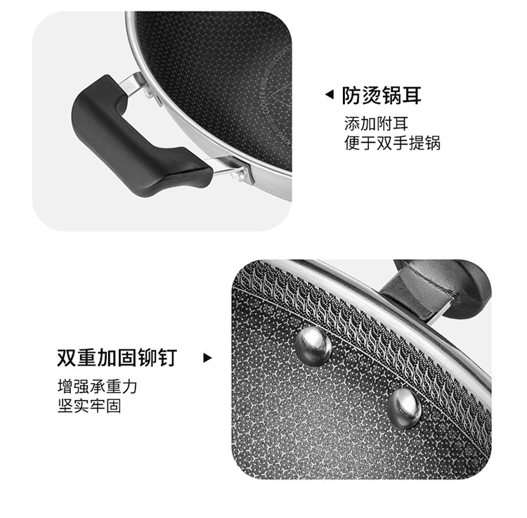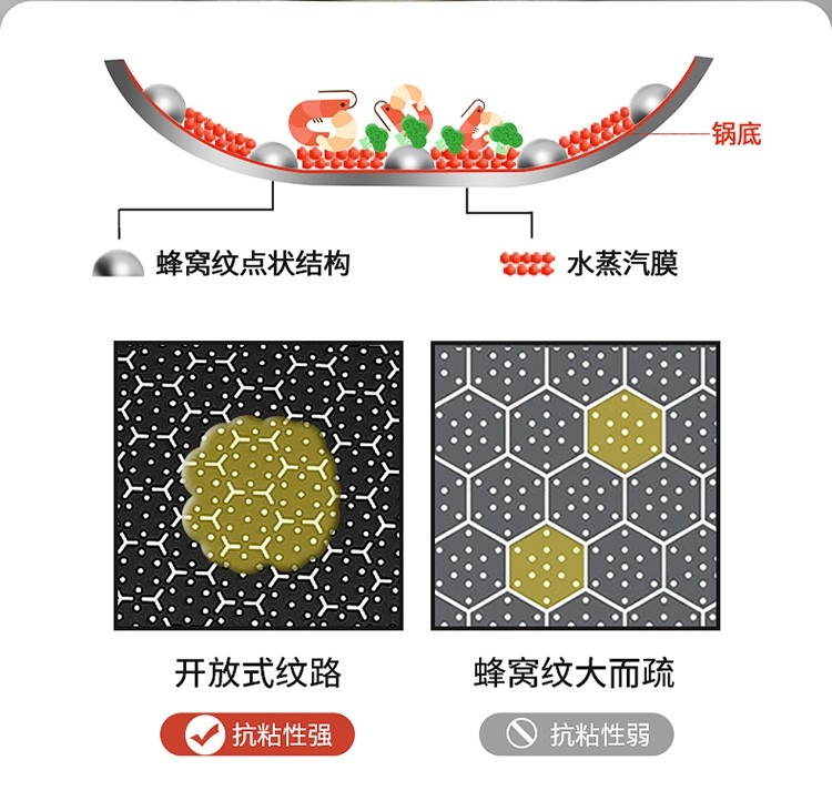 双面蜂窝纹不粘;厚底薄壁控温佳;可视可立锅盖