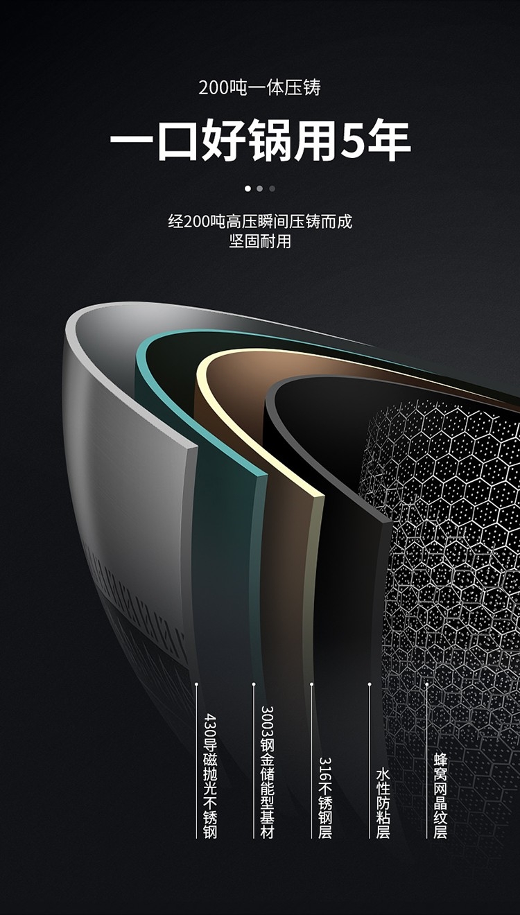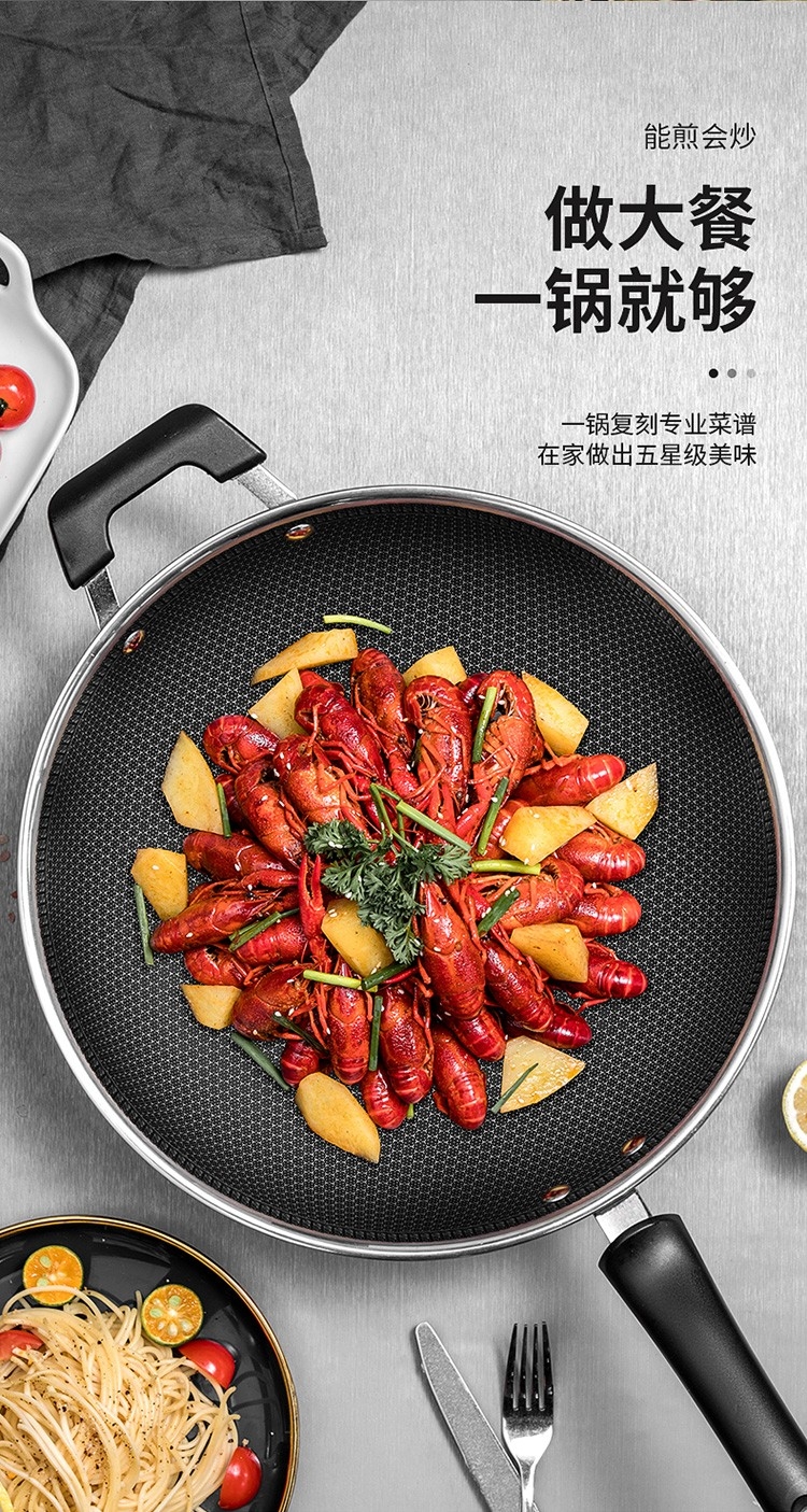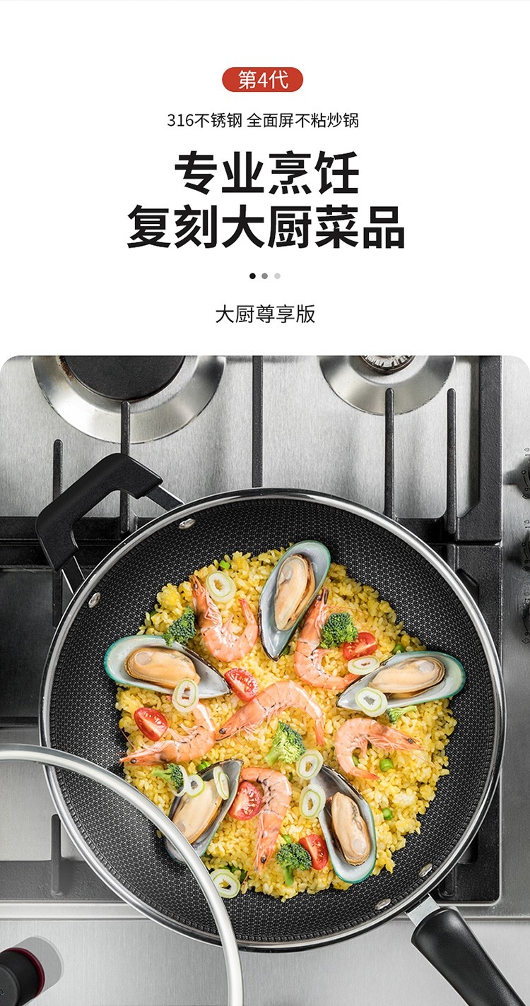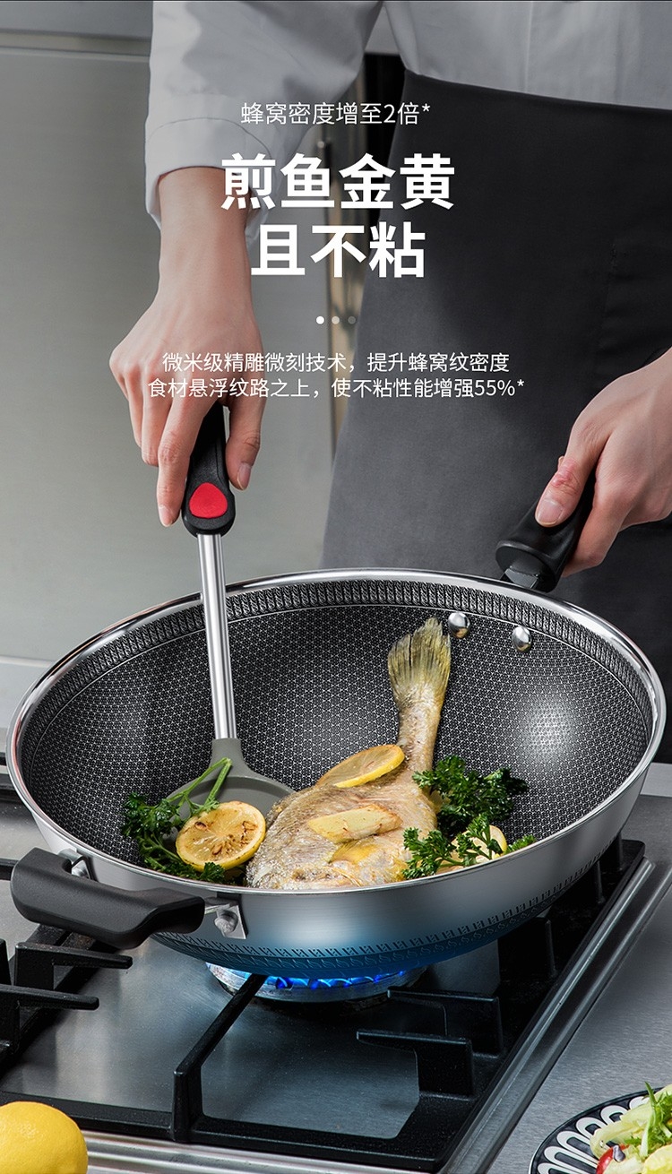 双面蜂窝纹不粘;厚底薄壁控温佳;可视可立锅盖