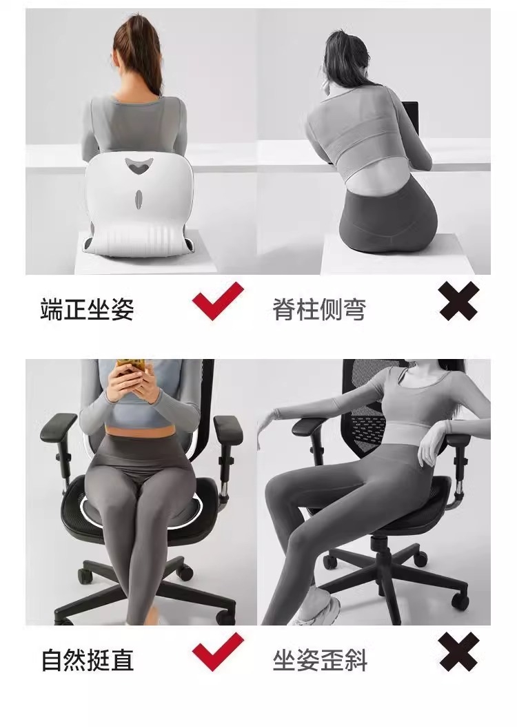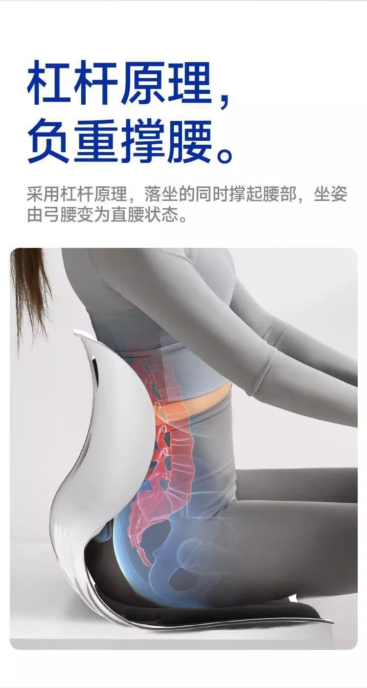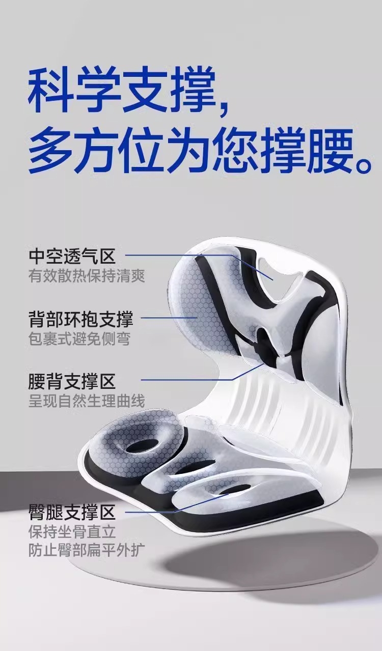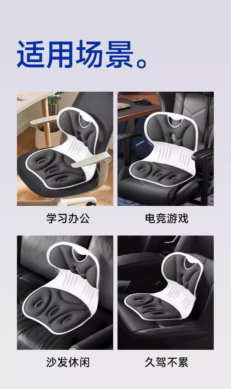 护腰减压:采用人体工学设计,贴合腰椎曲线,通过S型;矫正坐姿;多功能设计,兼顾坐垫和腰靠,一物多用,满足不同场景