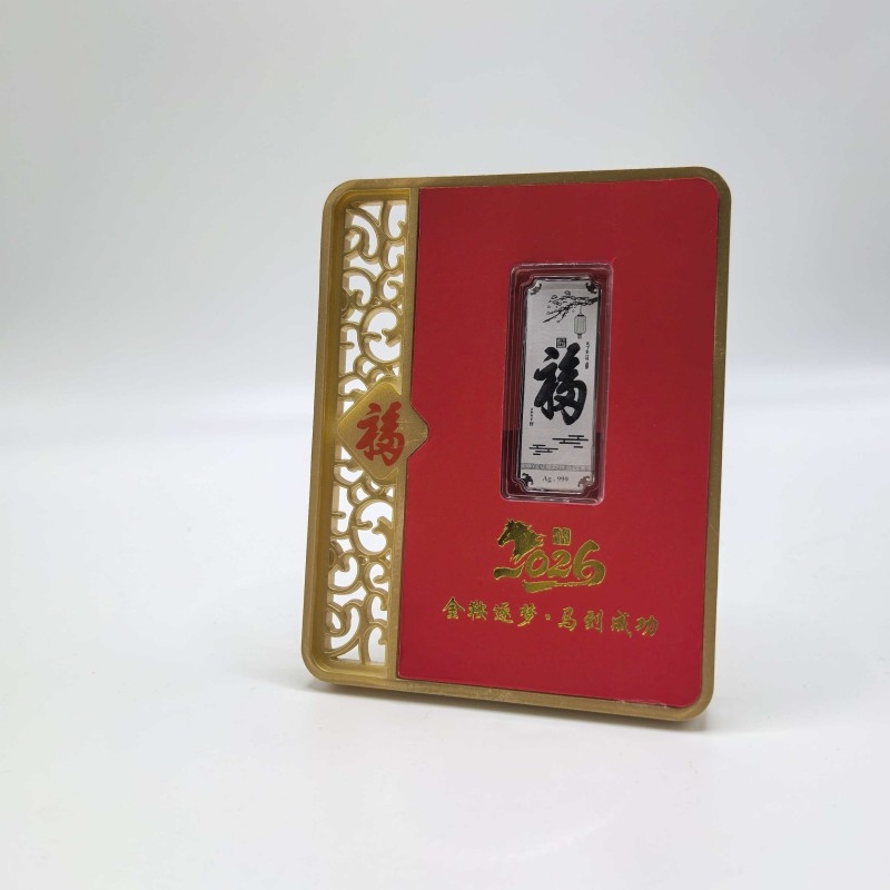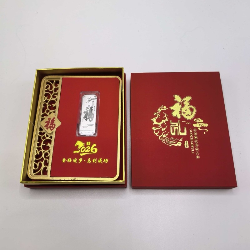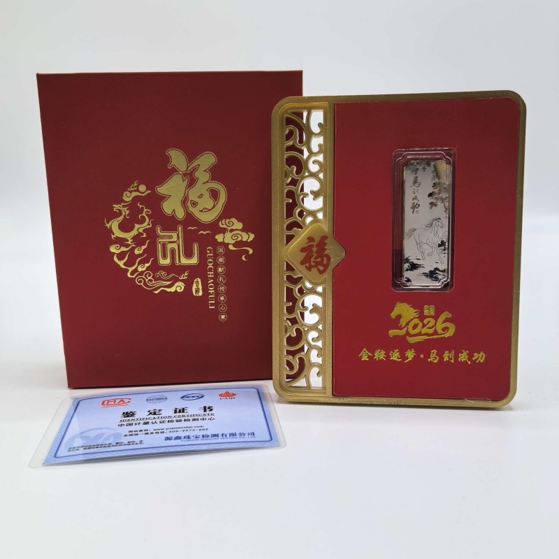 以999纯银精铸,银章上骏马腾跃山水间;象征「金鞍逐梦」的奋进精神;「福」字礼盒配权威鉴定证书,双证保障品质;2026马年专属印记,赠予挚友、长辈或商界伙伴;寓意马到成功、福泽万家,是新春、佳节、庆典的尊贵