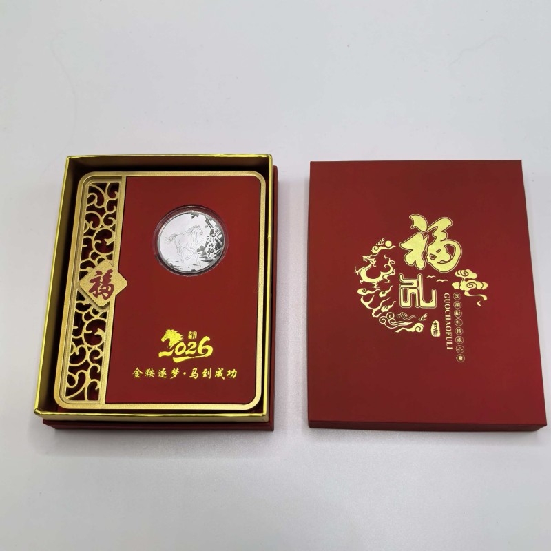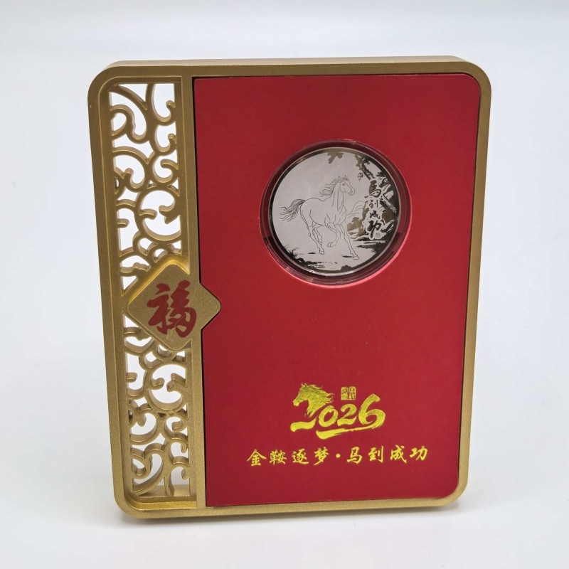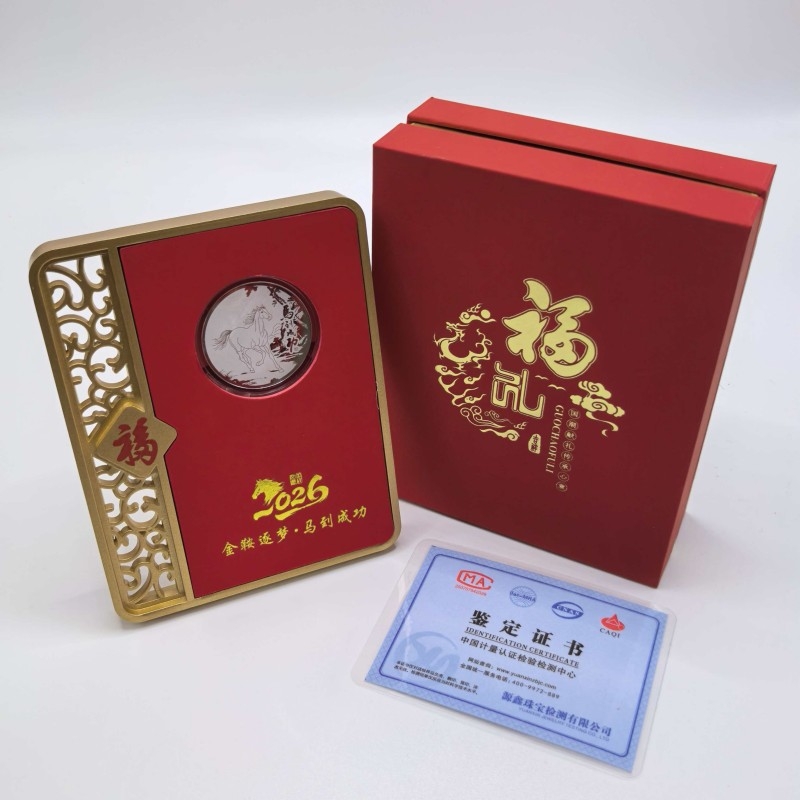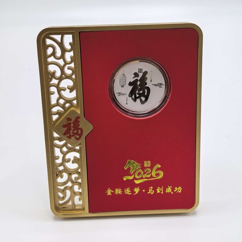以999纯银精铸,银章上骏马腾跃山水间;象征「金鞍逐梦」的奋进精神;镶嵌于赤红底台,边框环绕,镂空福纹点缀,搭配倒福牌;2026马年专属印记,赠予挚友、长辈或商界伙伴;寓意马到成功、福泽万家,是新春、佳节、庆典的尊贵