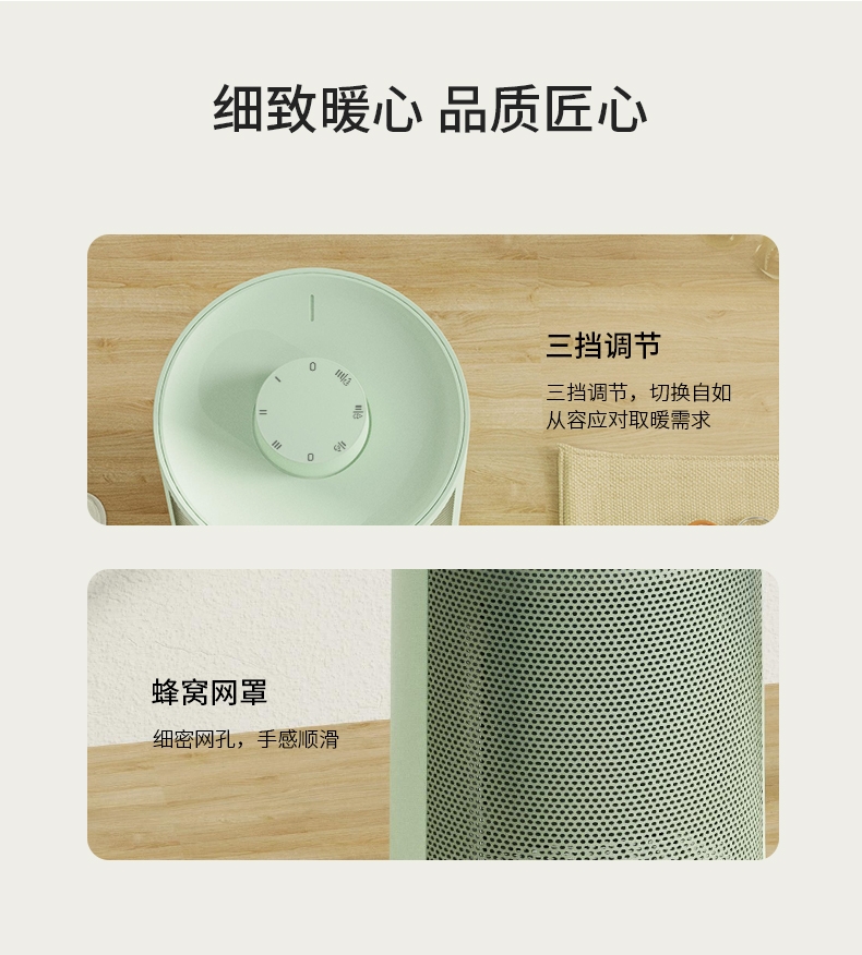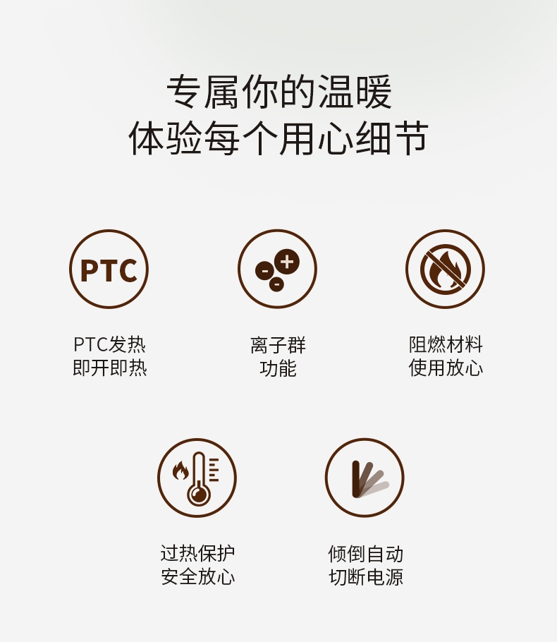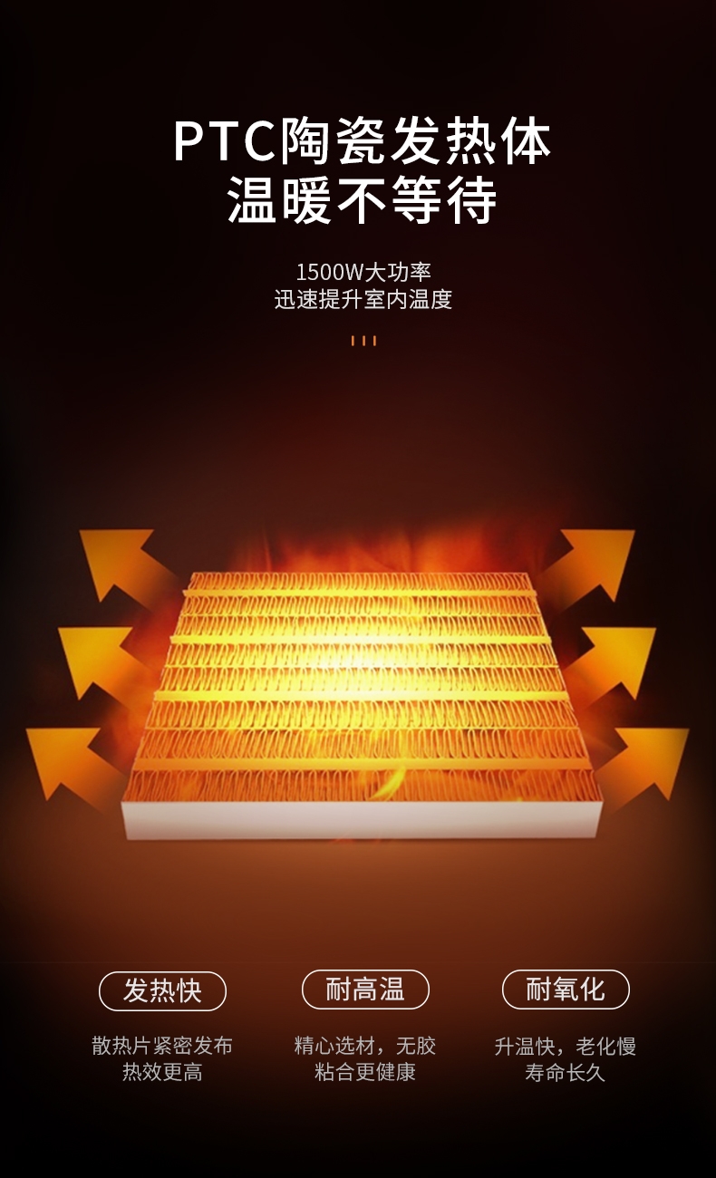PTC发热:即开即热。;档位调节:三档调节。;负离子模块:净化空气。