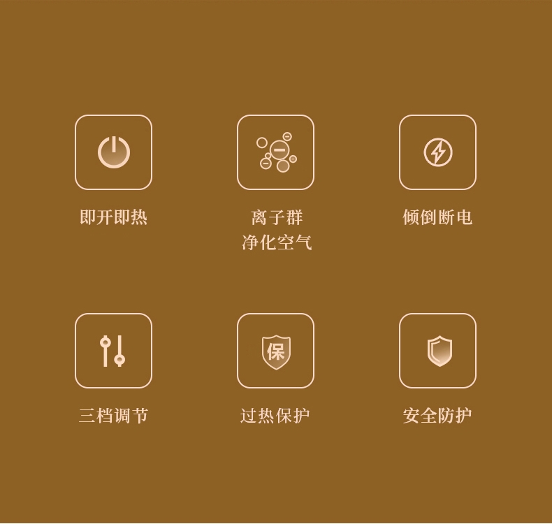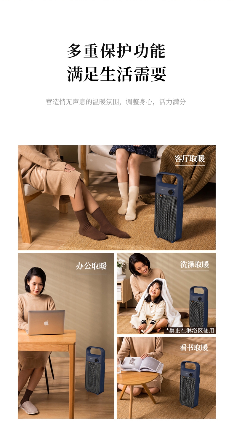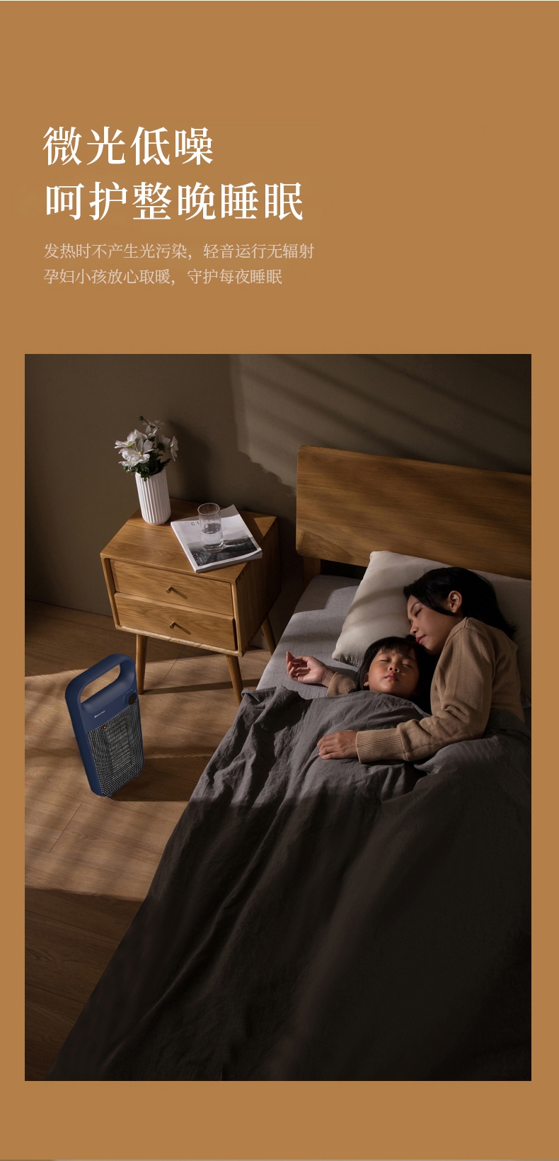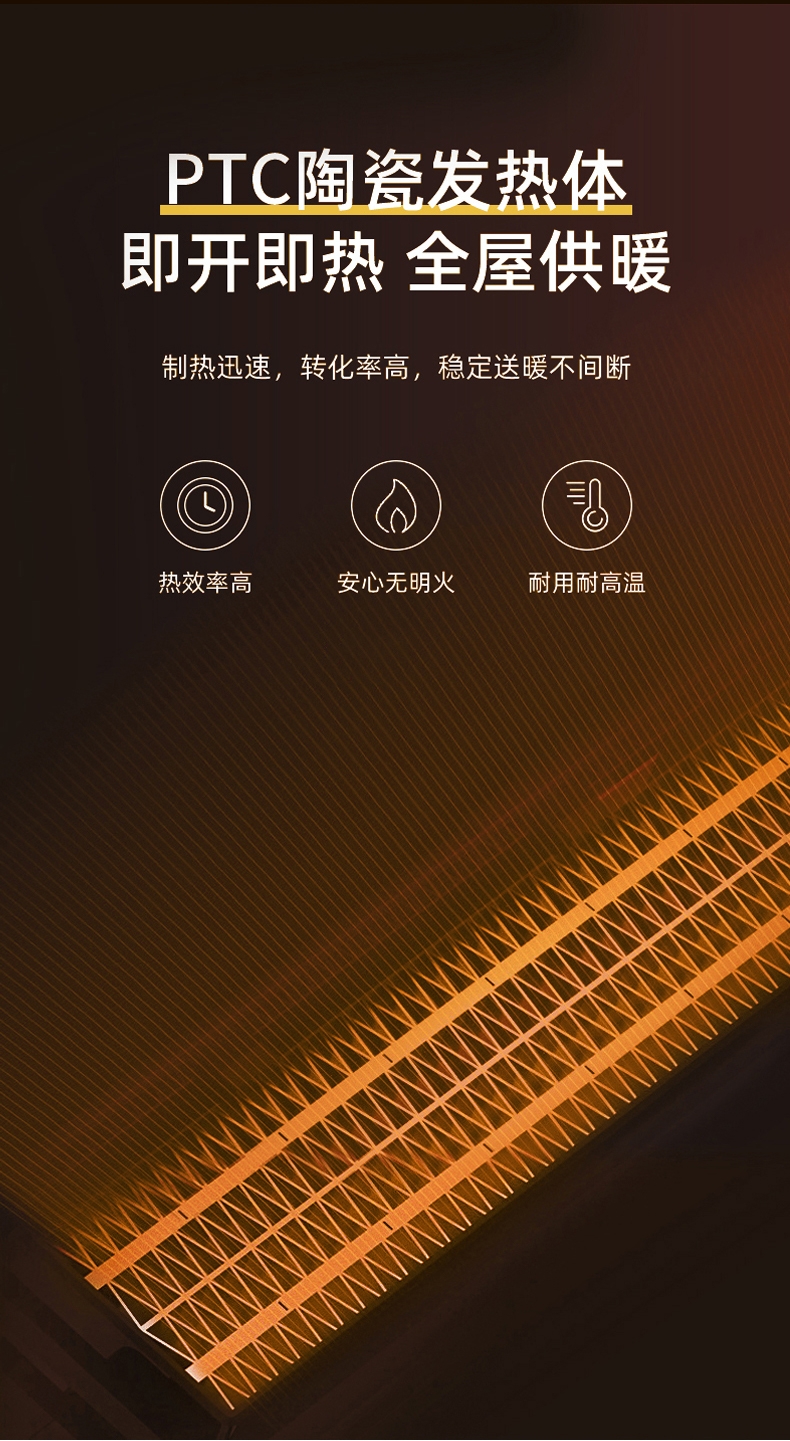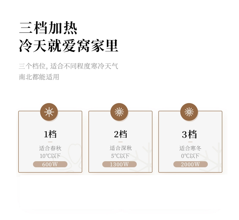 采用PTC发热体,即开即热,功率2000W;三档温度调节;外观小巧,方便收纳