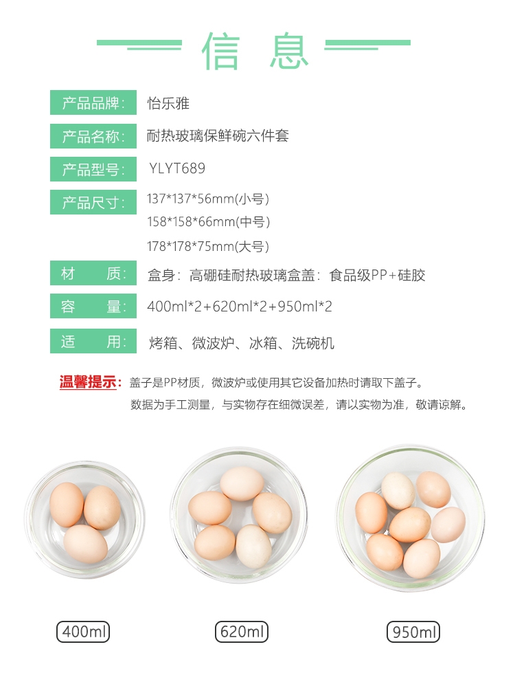 配置清单:配置:400ml *2+620ml*2+950ml*2 材质:碗--高硼硅耐热玻璃 盖--食品级PP密封圈--硅胶树脂