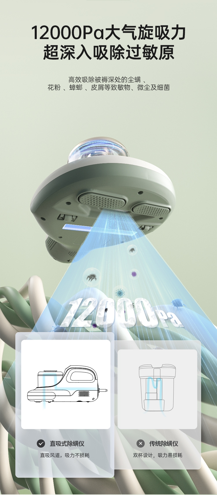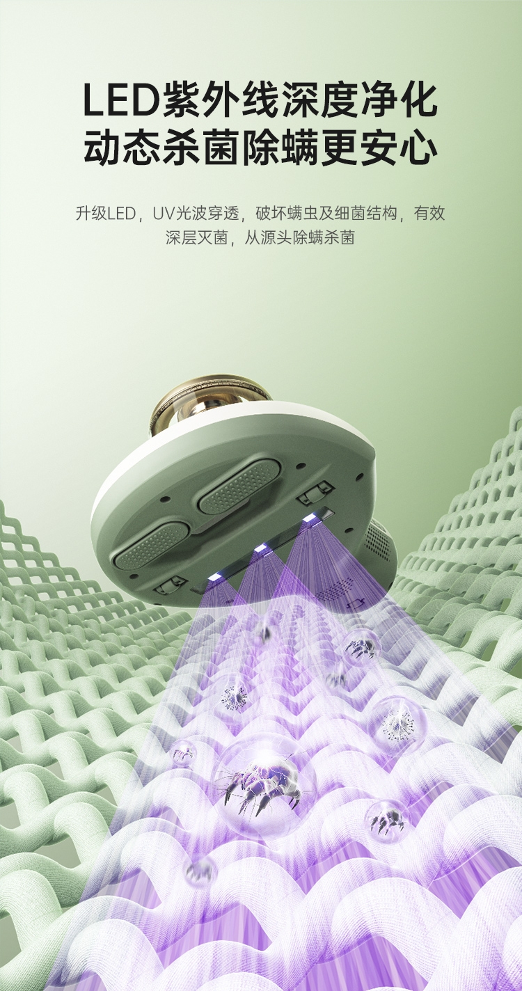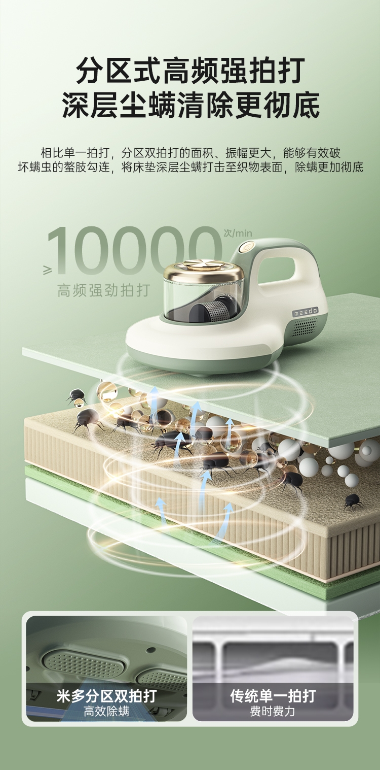 DPOWER无刷马达驱动可以达到:63000转/分;12000Pa大气旋吸力 超深入吸除过敏原高效吸除;分区高频强拍打 深层尘螨清除更彻底