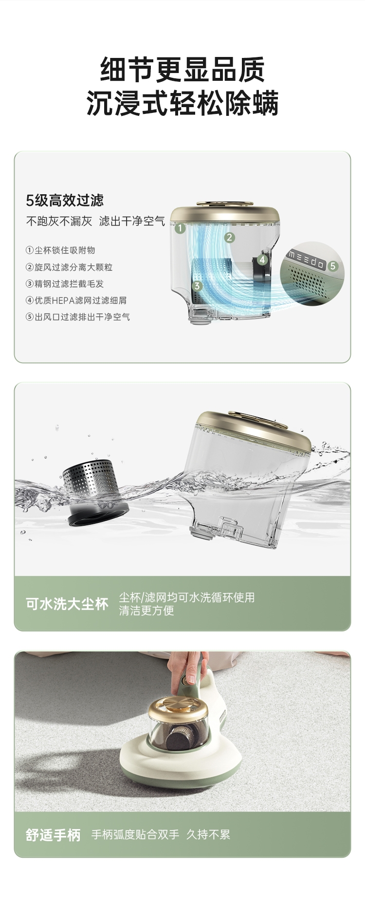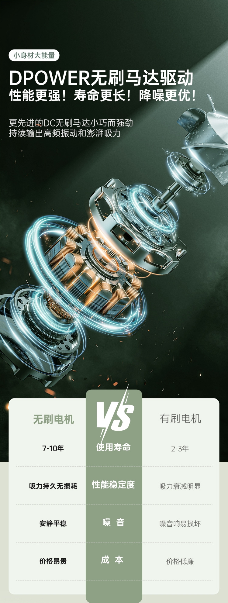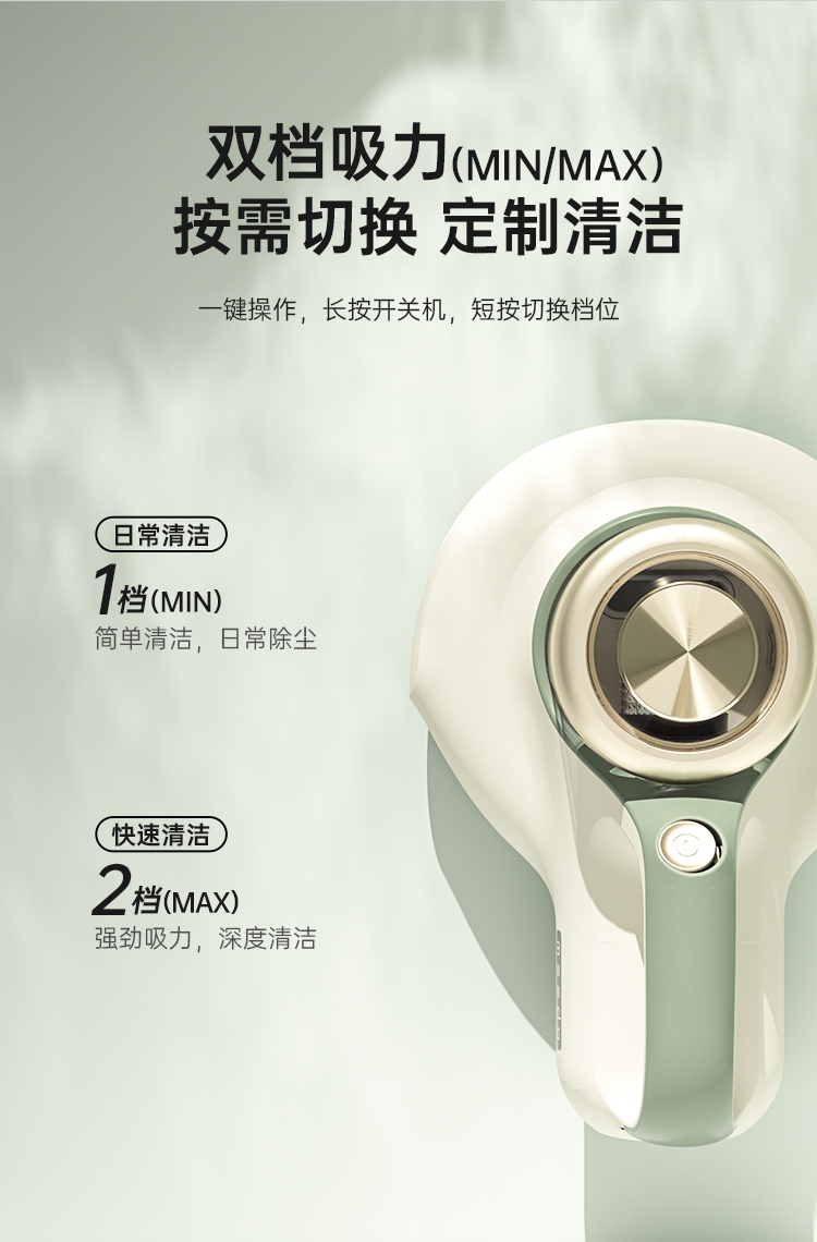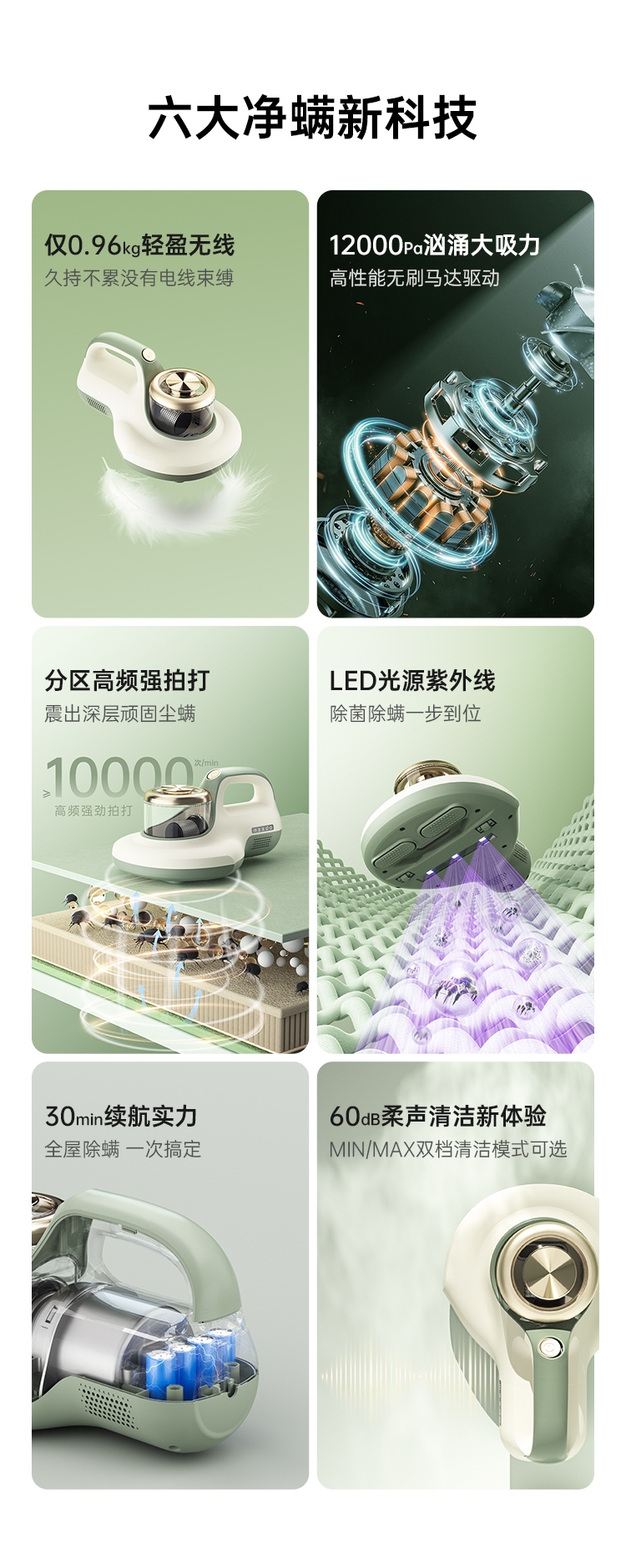 DPOWER无刷马达驱动可以达到:63000转/分;12000Pa大气旋吸力 超深入吸除过敏原高效吸除;分区高频强拍打 深层尘螨清除更彻底