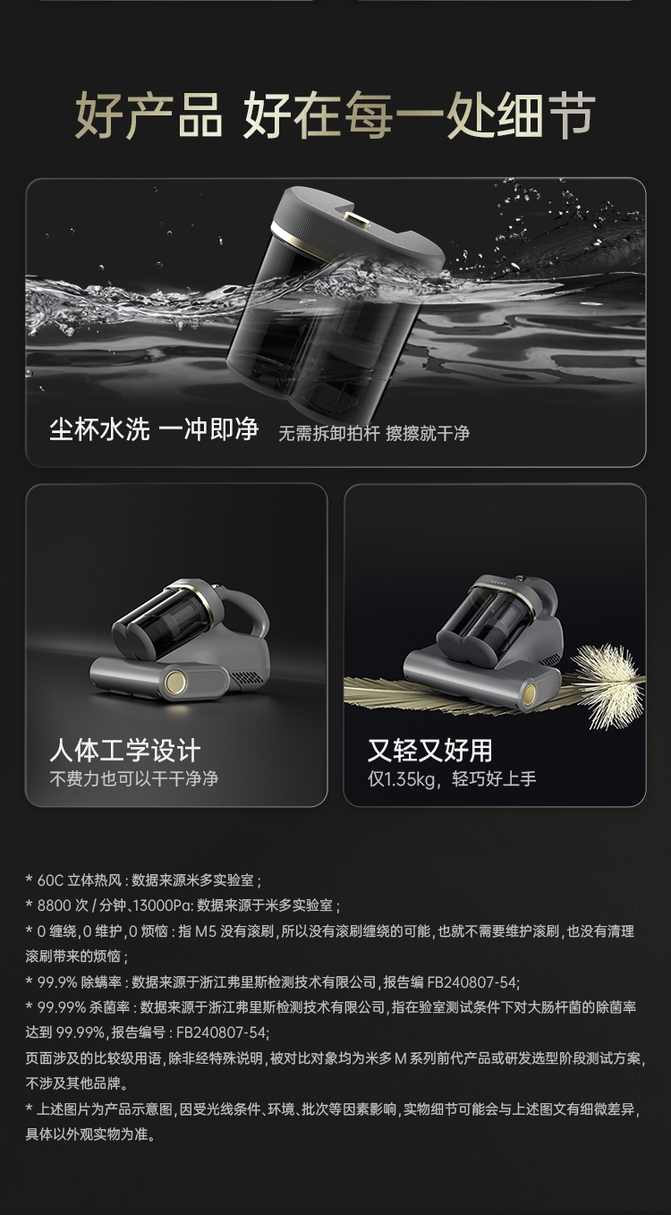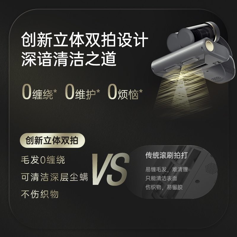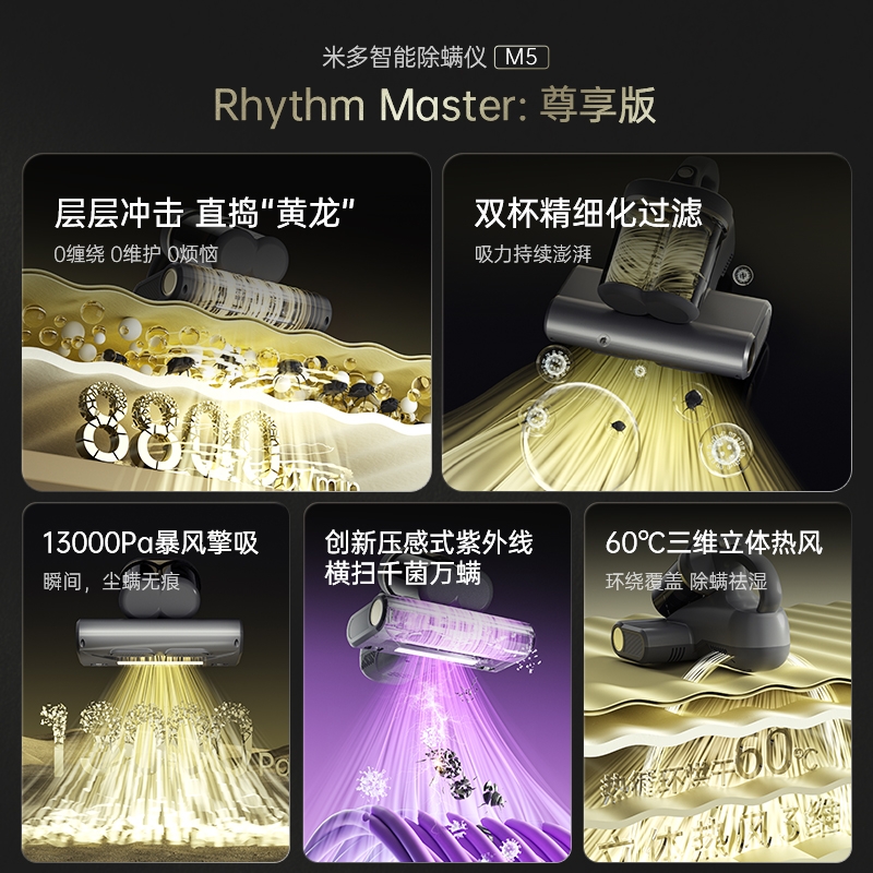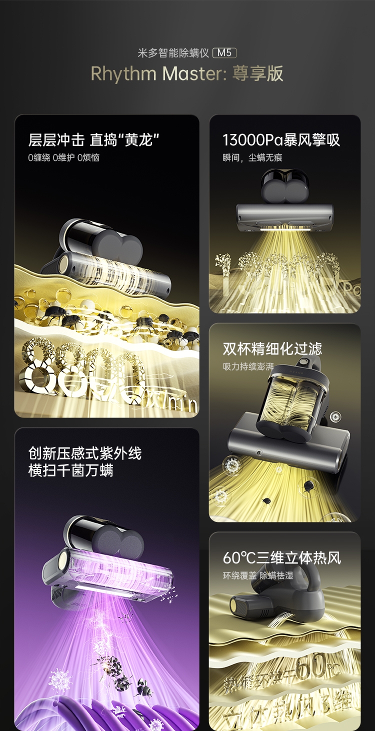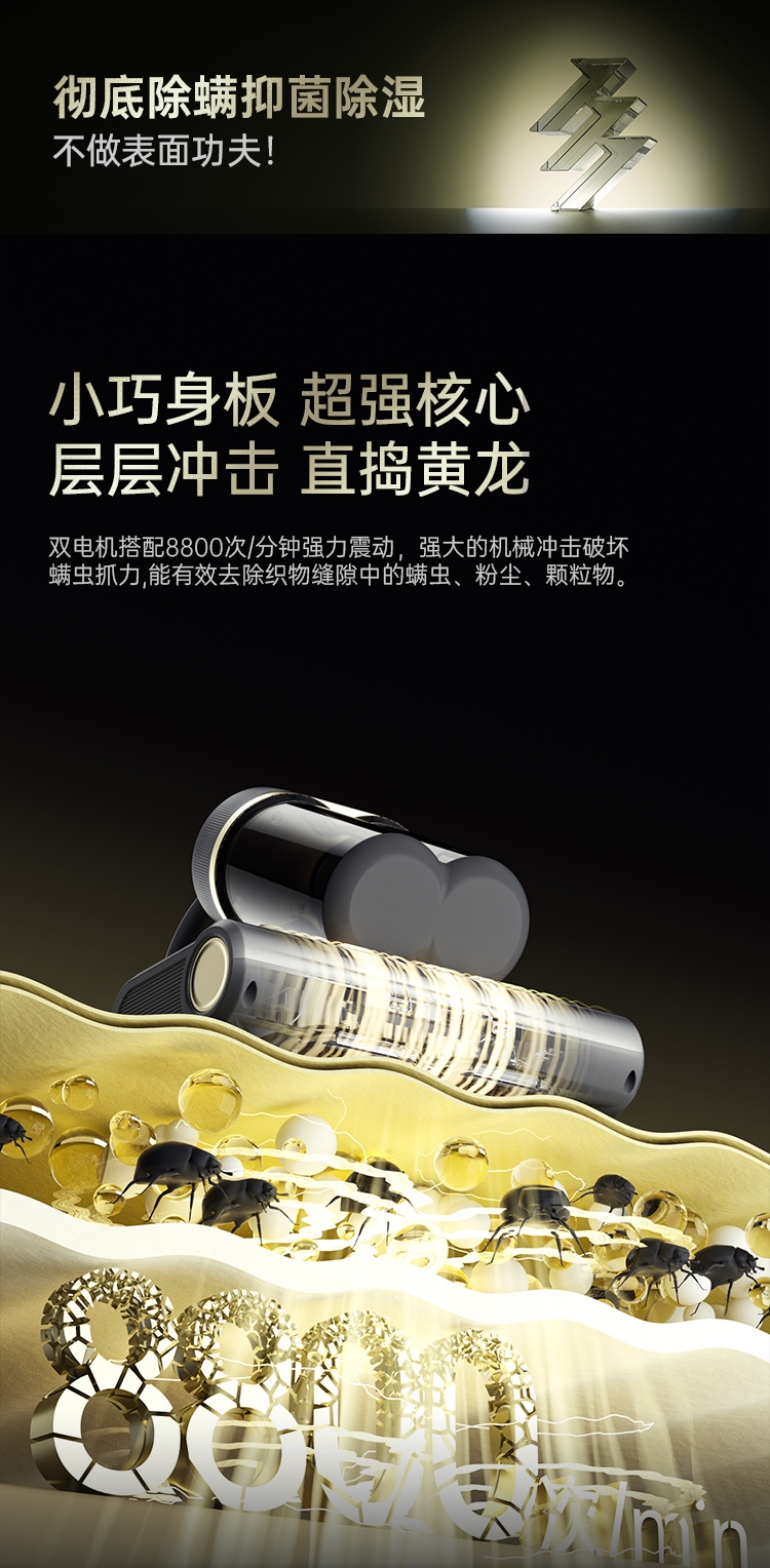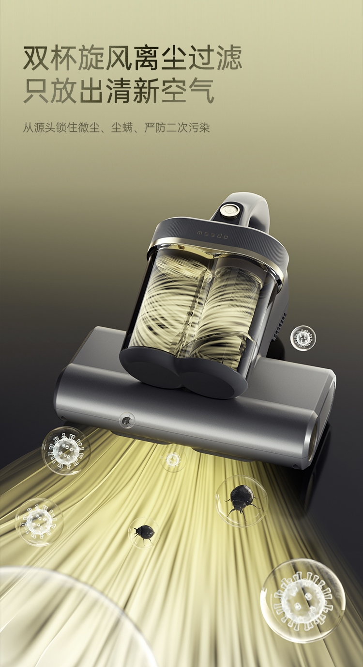 双杯尘气分离,多重净化密滤;13000Pa暴风擎吸,瞬间尘螨无痕;创新压感式紫外线,横扫千菌万螨