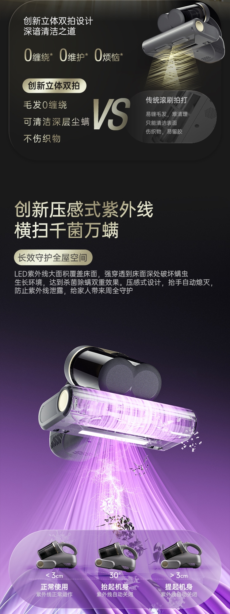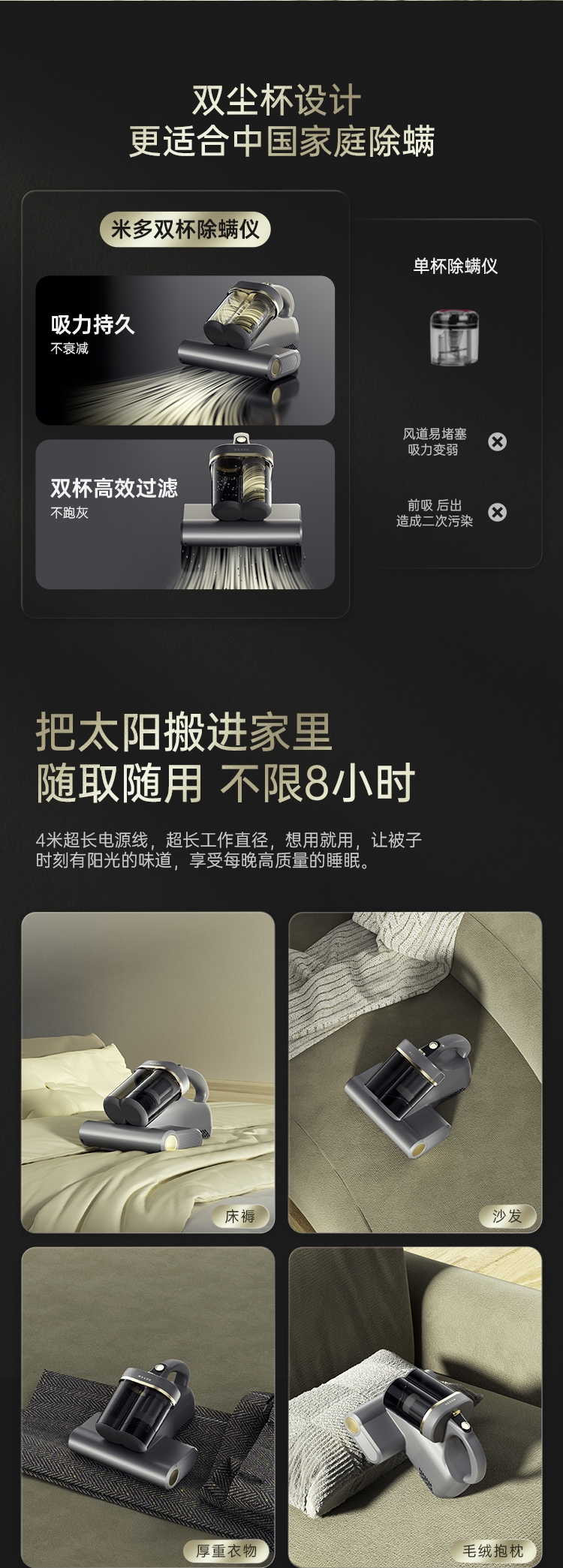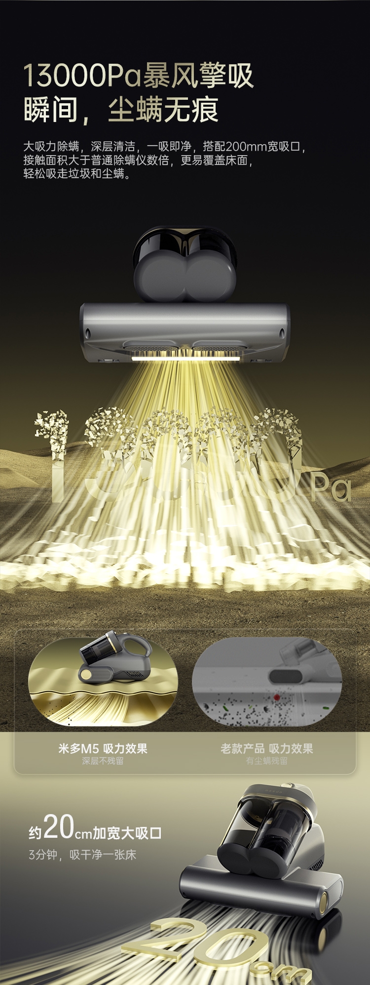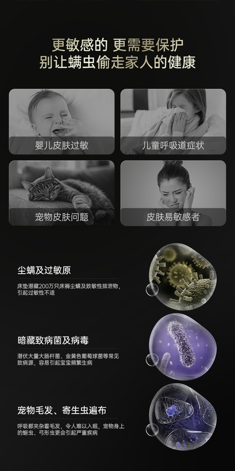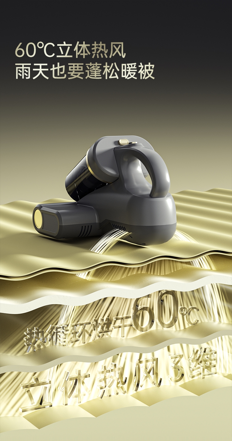 双杯尘气分离,多重净化密滤;13000Pa暴风擎吸,瞬间尘螨无痕;创新压感式紫外线,横扫千菌万螨