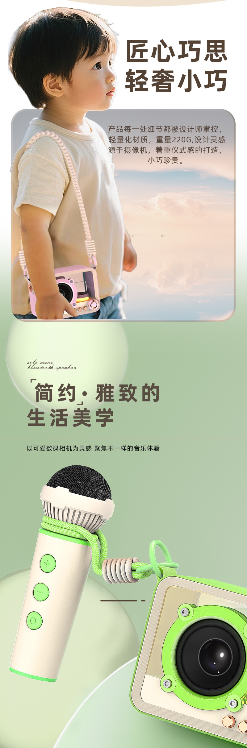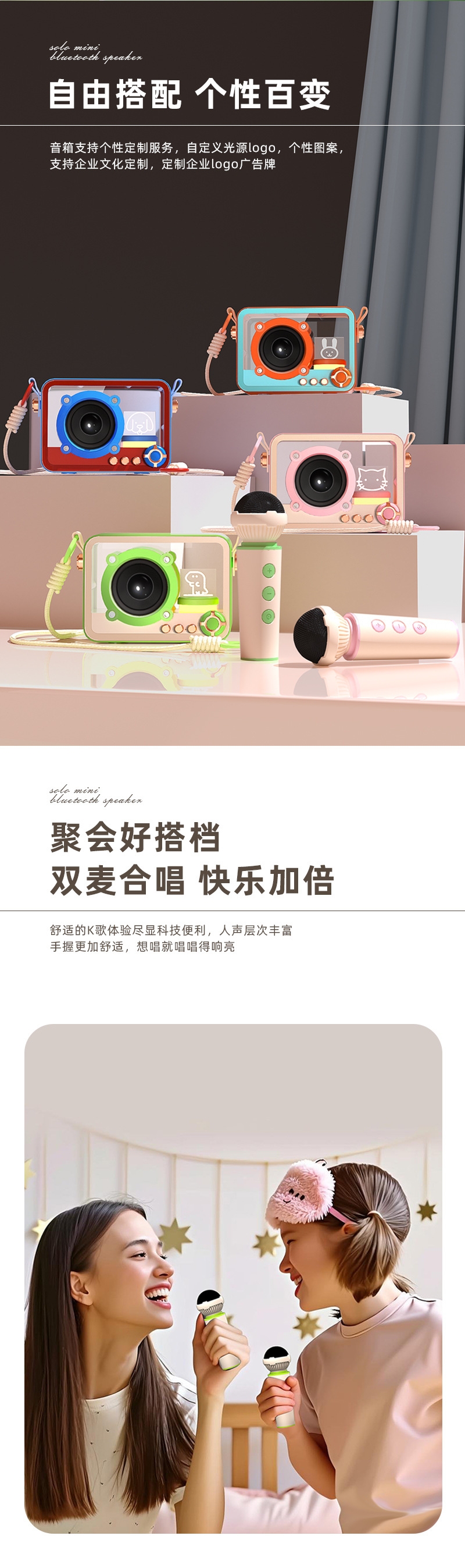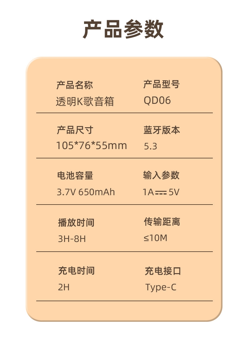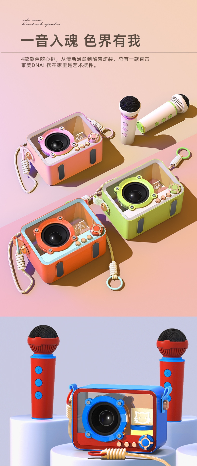 105*76*55mm、专业音色;颜色多样、持久续航、自由K歌、独立发声;便携小巧、肩带携带、多场景适用