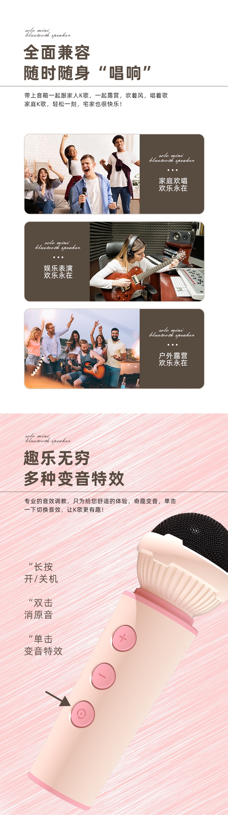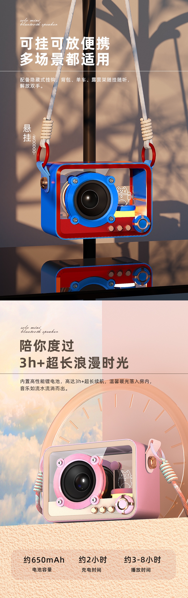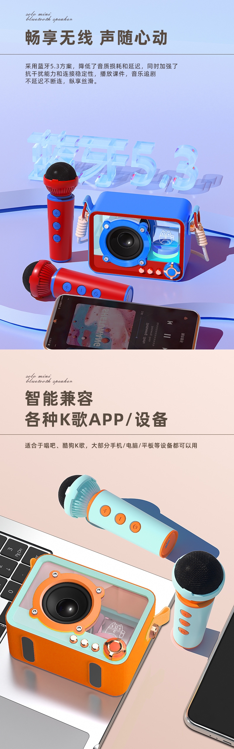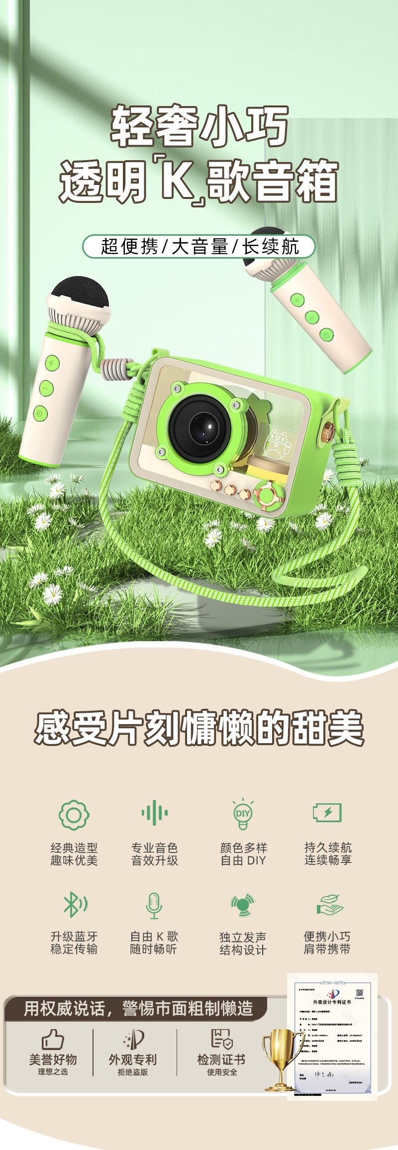 105*76*55mm、专业音色;颜色多样、持久续航、自由K歌、独立发声;便携小巧、肩带携带、多场景适用