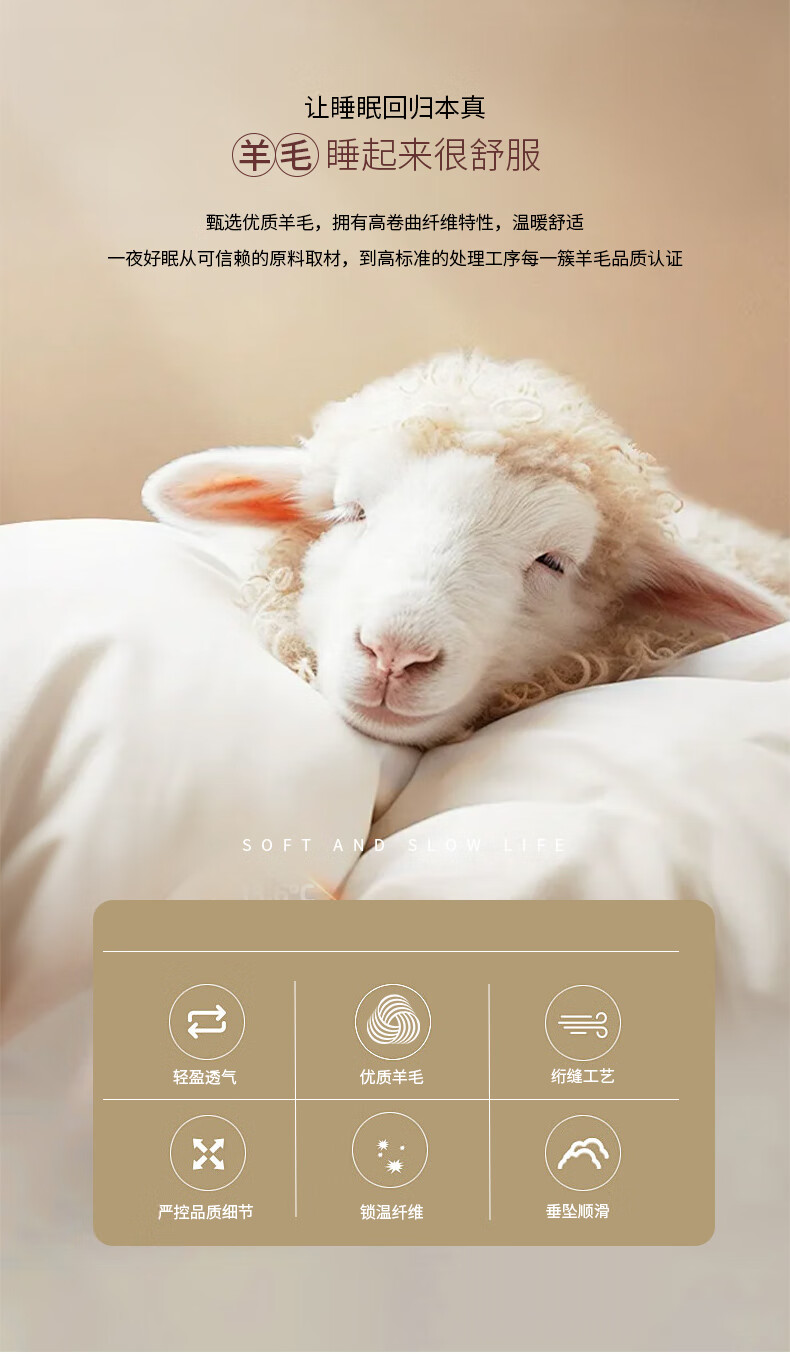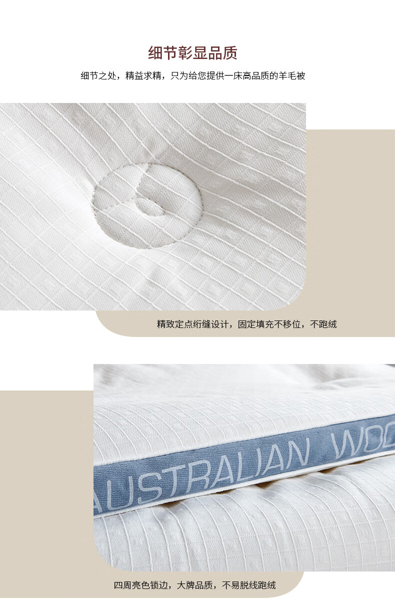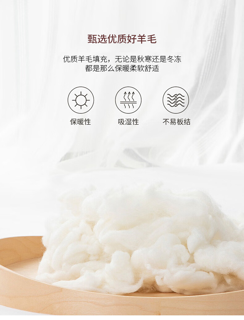 中间层100%澳洲羊毛,外层聚酯纤维锁温层;冷热双向调节,吸湿透气不闷汗,给你云端般包裹感!;羊毛锁温外层防风,聚酯纤维加固保暖