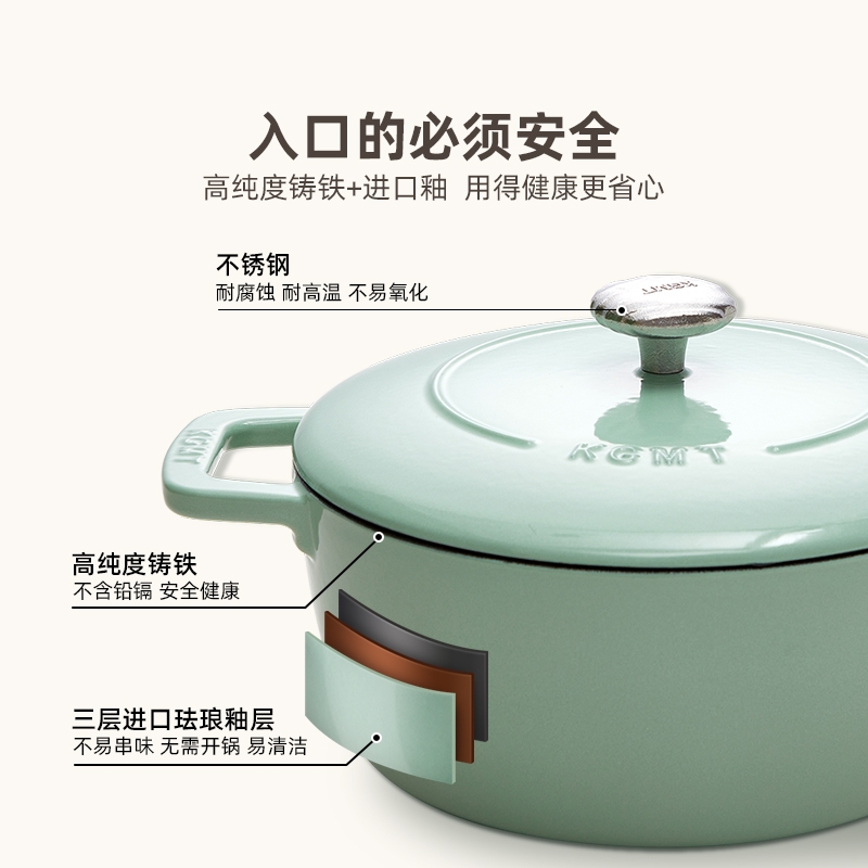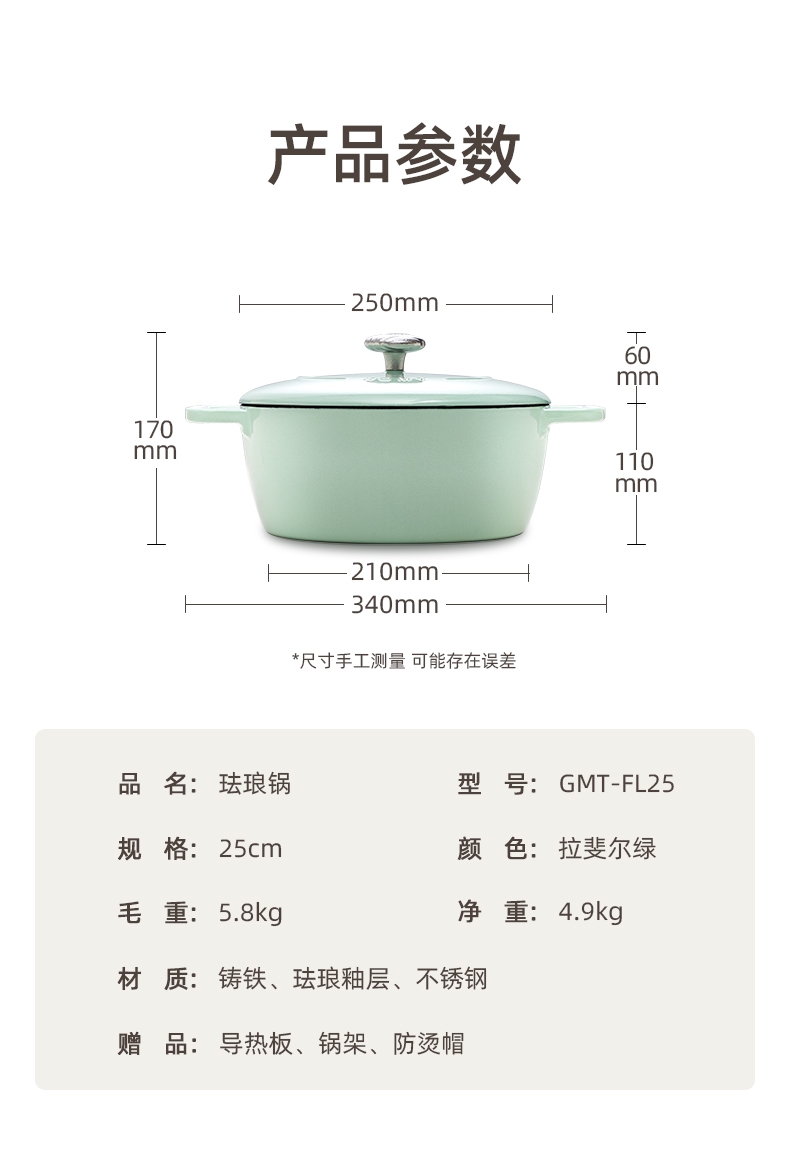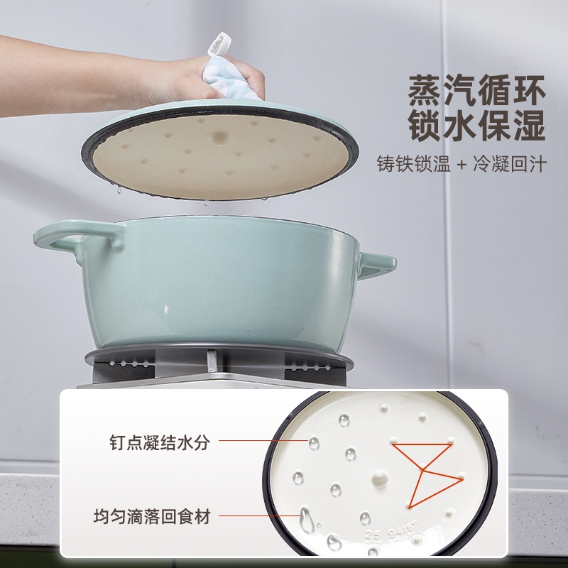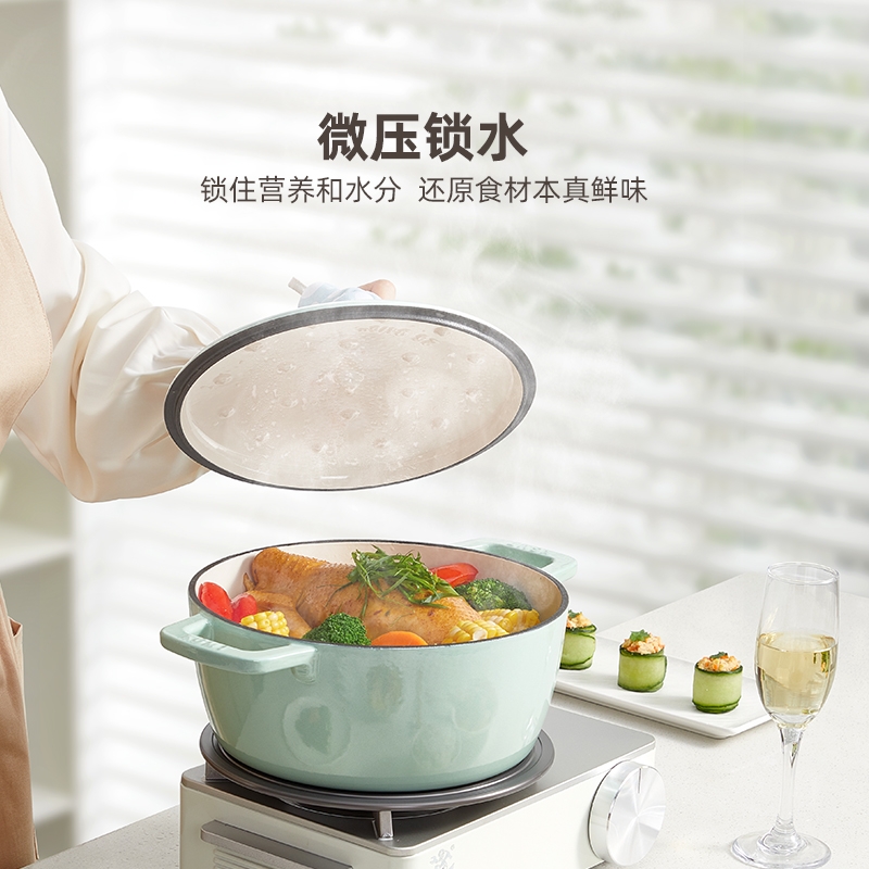 一锅多用,厨房小白变大厨,焖、炖、煮、煎、炸;锅具直径25cm,容量4L大容量,一锅解决所有美食;铸铁锅体,进口陶瓷釉面,安全耐高温,釉面光滑不粘;标配导热板,标配锅架,避免锅具高温烫坏桌面。;一体成型锅体,均匀导热,聚热保温。