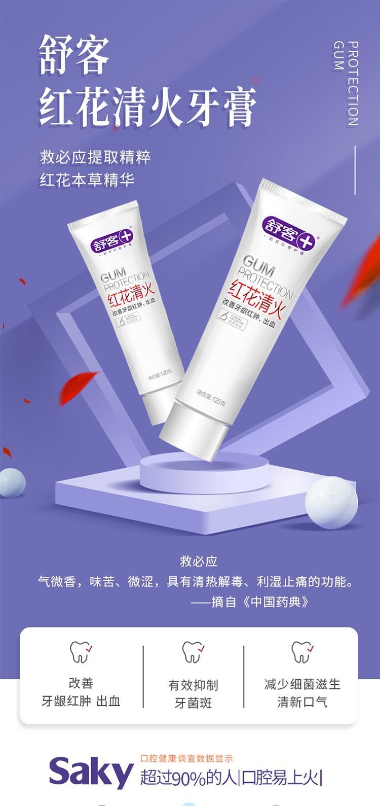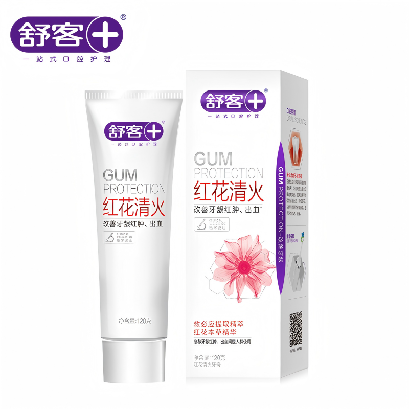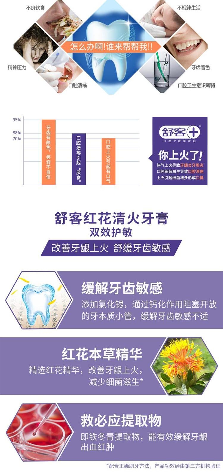 舒客红花清火牙膏 救必应提取精粹红花本草精华;舒客小苏打洁白细护牙膏 食品级小苏打|柠檬薄荷精华;三重活性酵素高效协同 4.0进阶配方 美白效果跃升;舒客炭丝能量牙刷双支装,细软刷毛呵护娇嫩牙龈