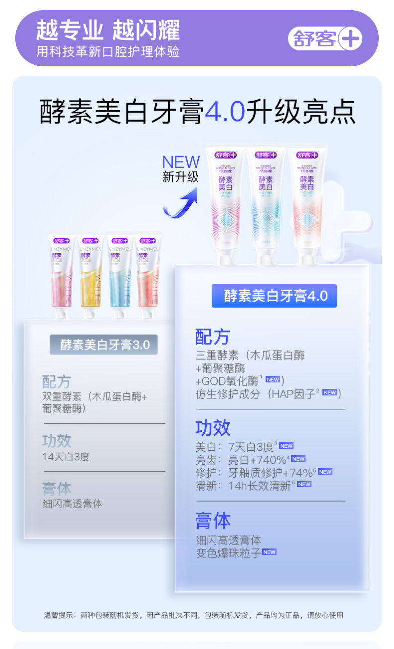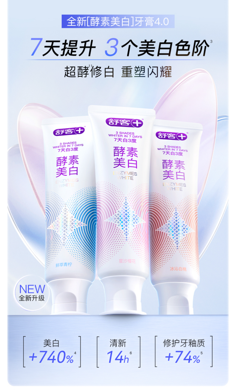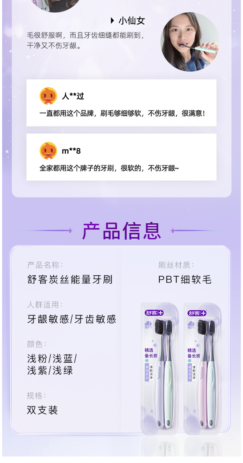 舒客红花清火牙膏 救必应提取精粹红花本草精华;舒客小苏打洁白细护牙膏 食品级小苏打|柠檬薄荷精华;三重活性酵素高效协同 4.0进阶配方 美白效果跃升;舒客炭丝能量牙刷双支装,细软刷毛呵护娇嫩牙龈