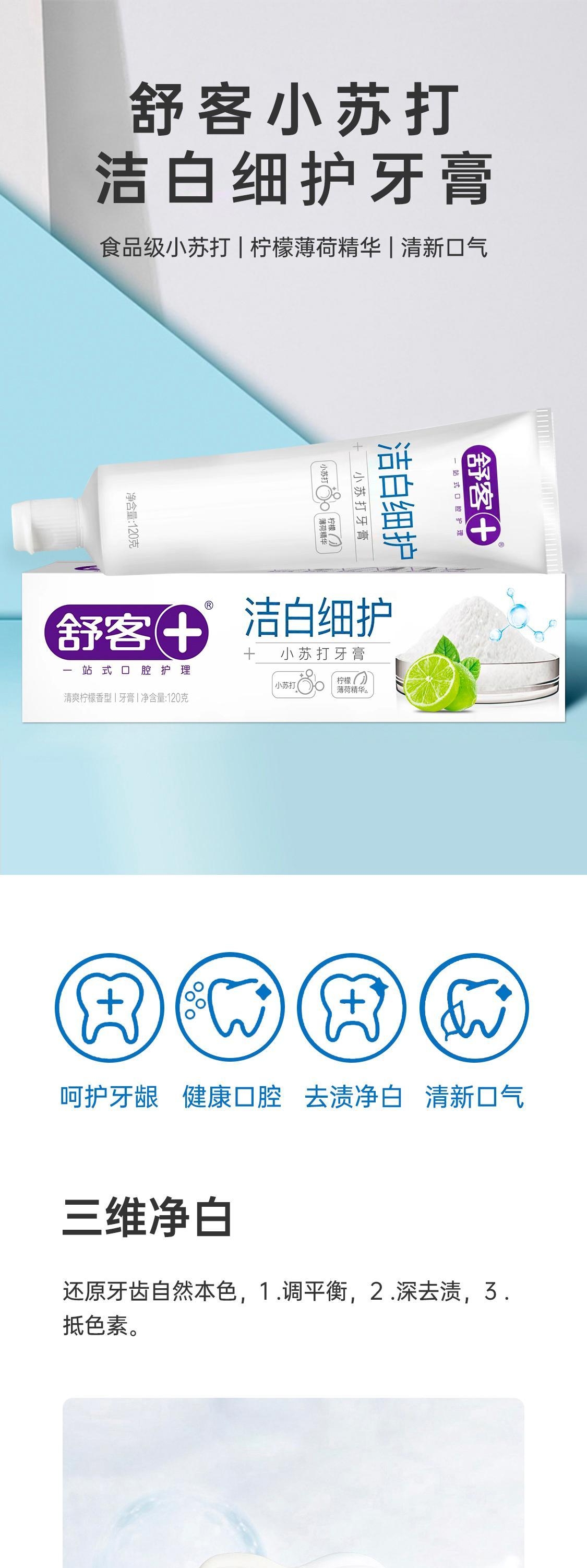 配置清单:舒客小苏打牙膏(洁白细护)120克+舒客精研亮白酵素牙膏(鲜萃青柠)120克+舒客红花清火牙膏120克+舒客炭丝能量倍护牙刷(新包装/颜色随机发)