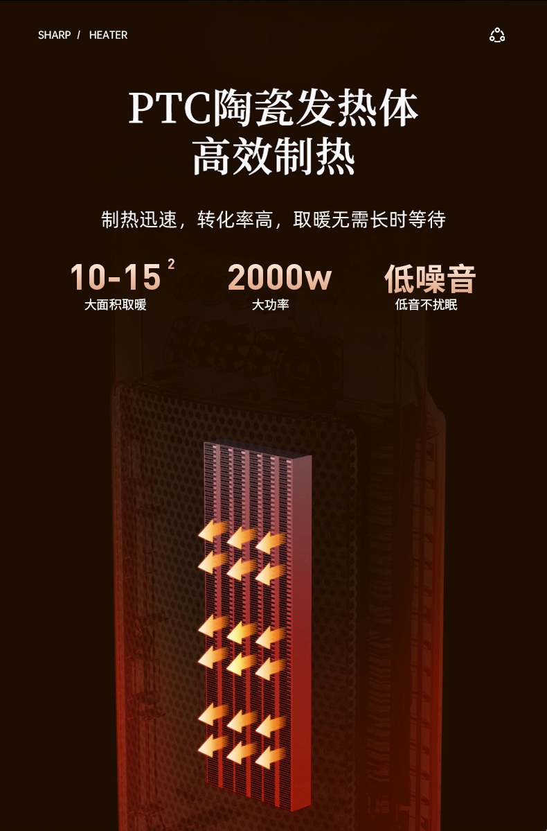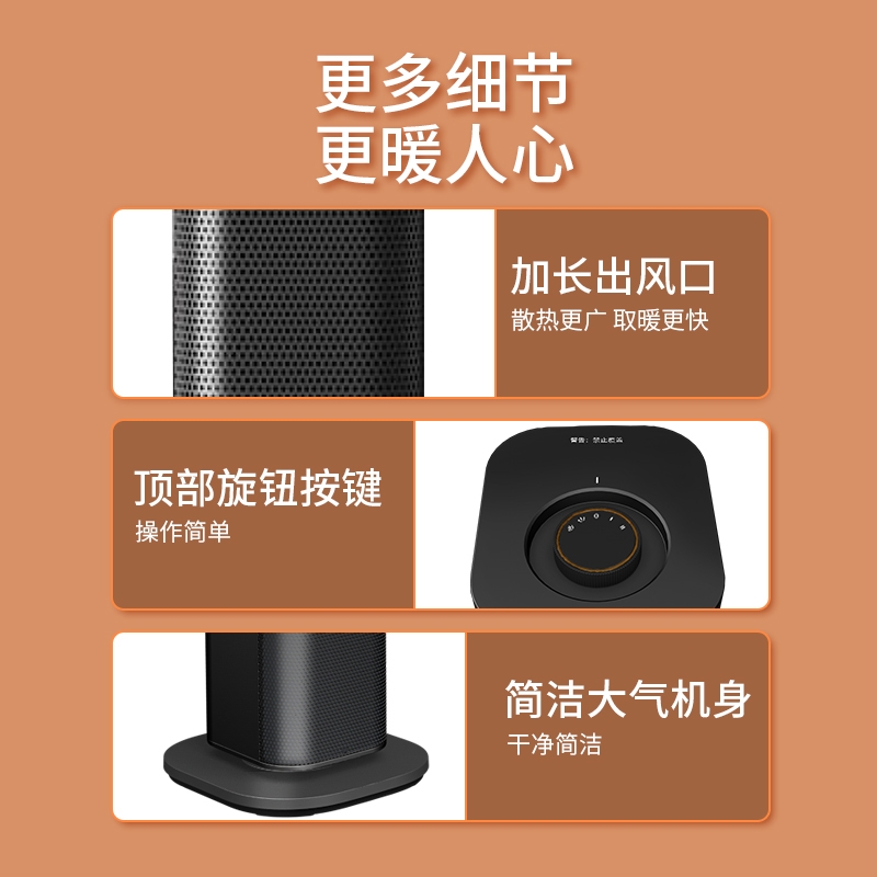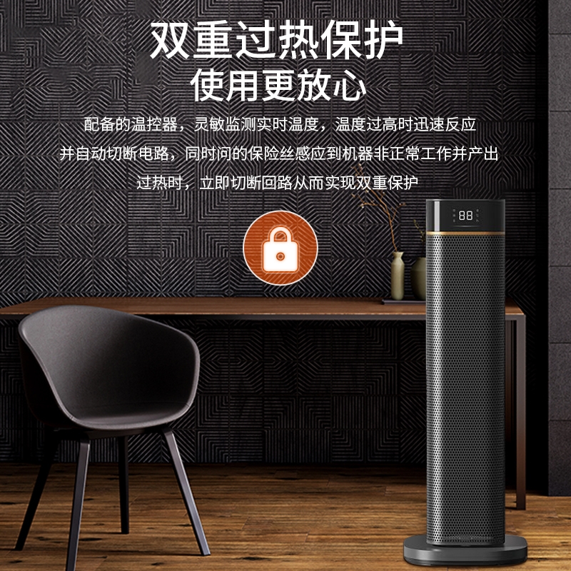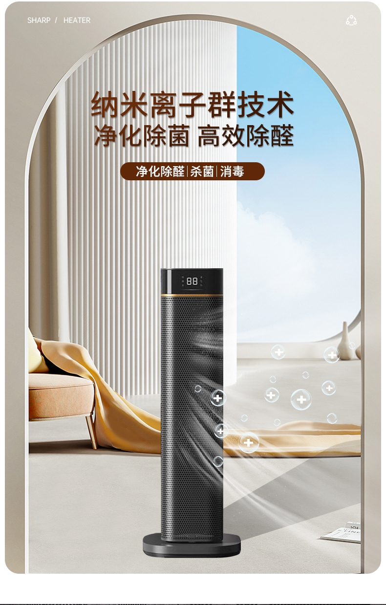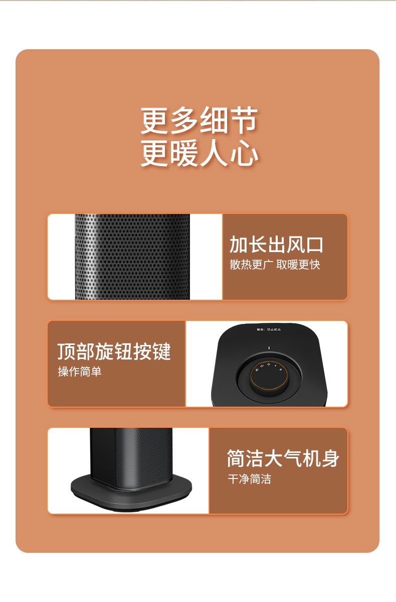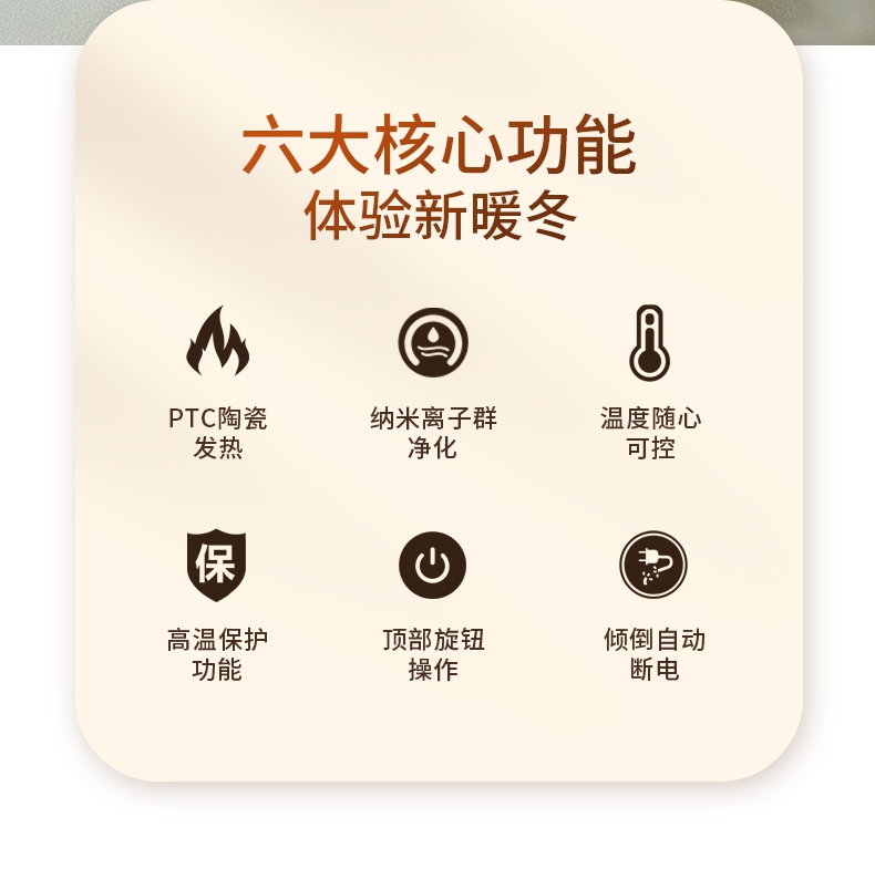 PTC发热:三秒即暖,暖风强劲;离子群模块:净化空气;高温保护