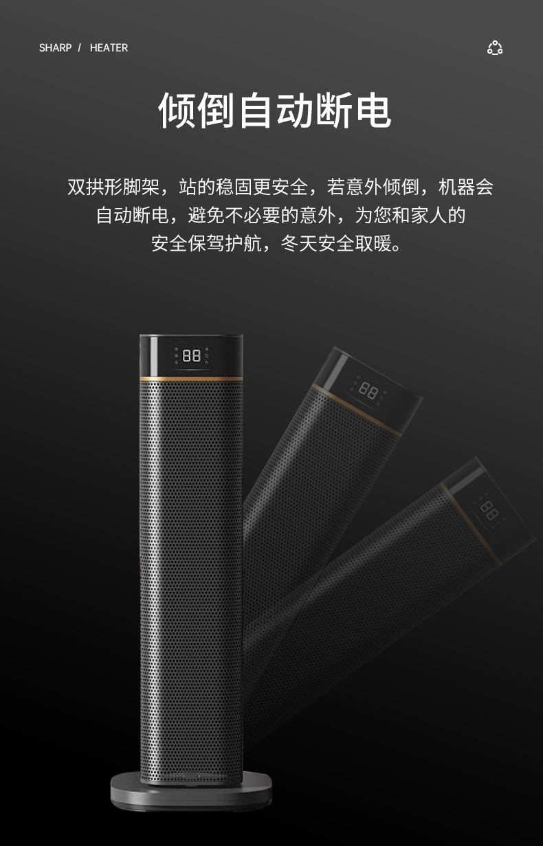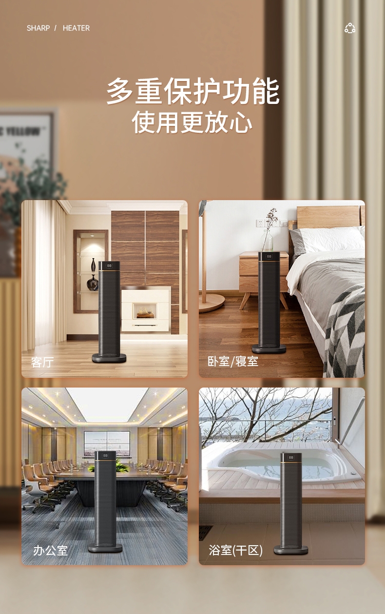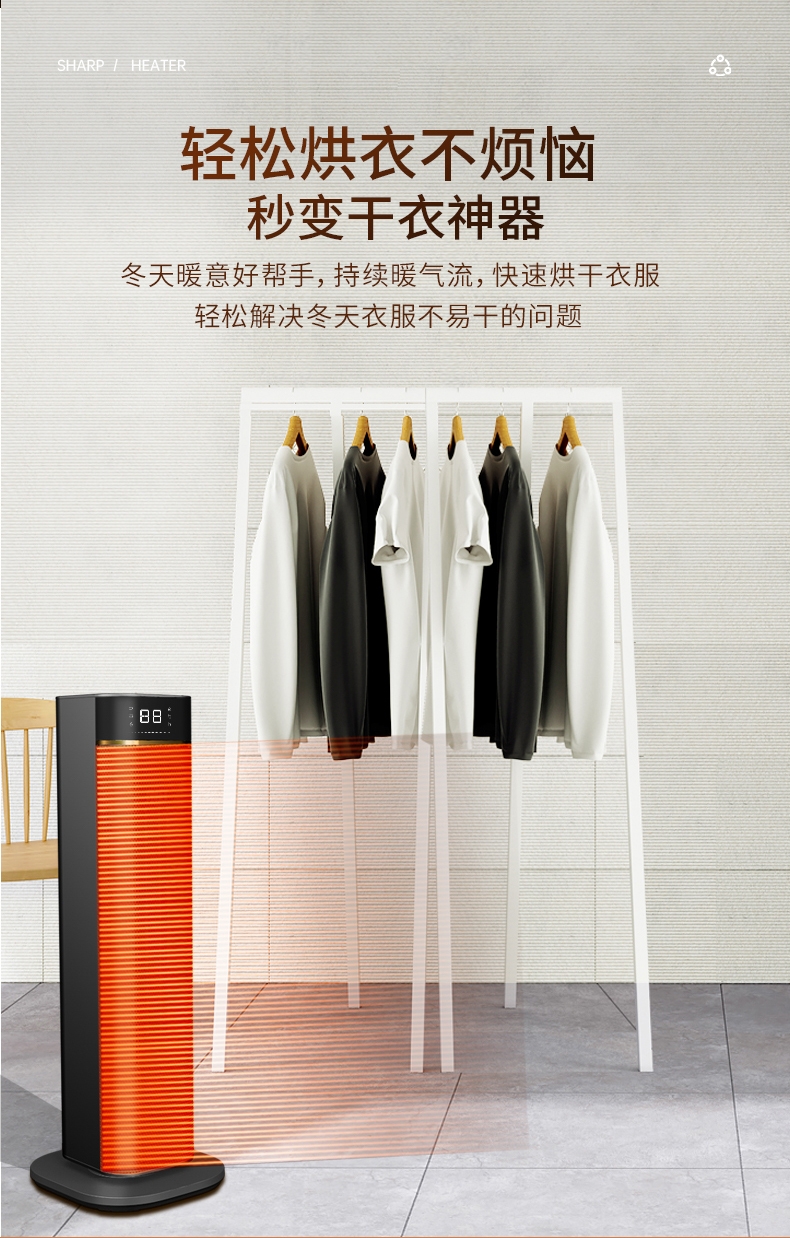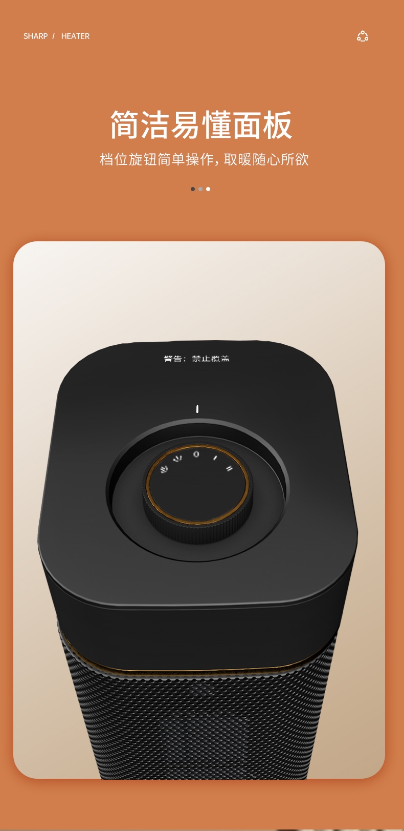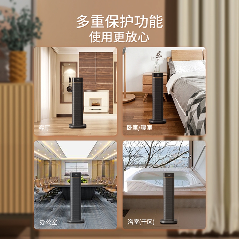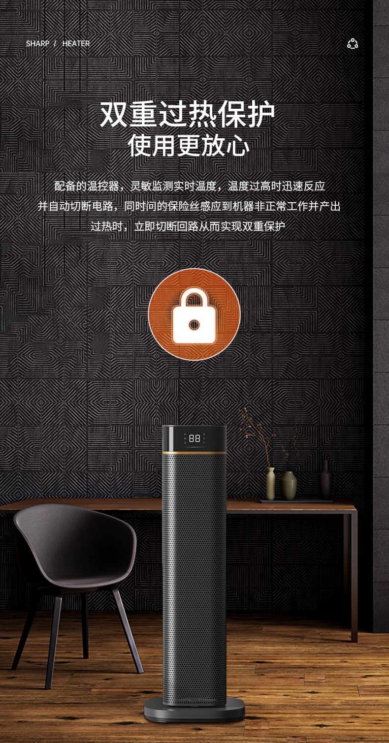 PTC发热:三秒即暖,暖风强劲;离子群模块:净化空气;高温保护