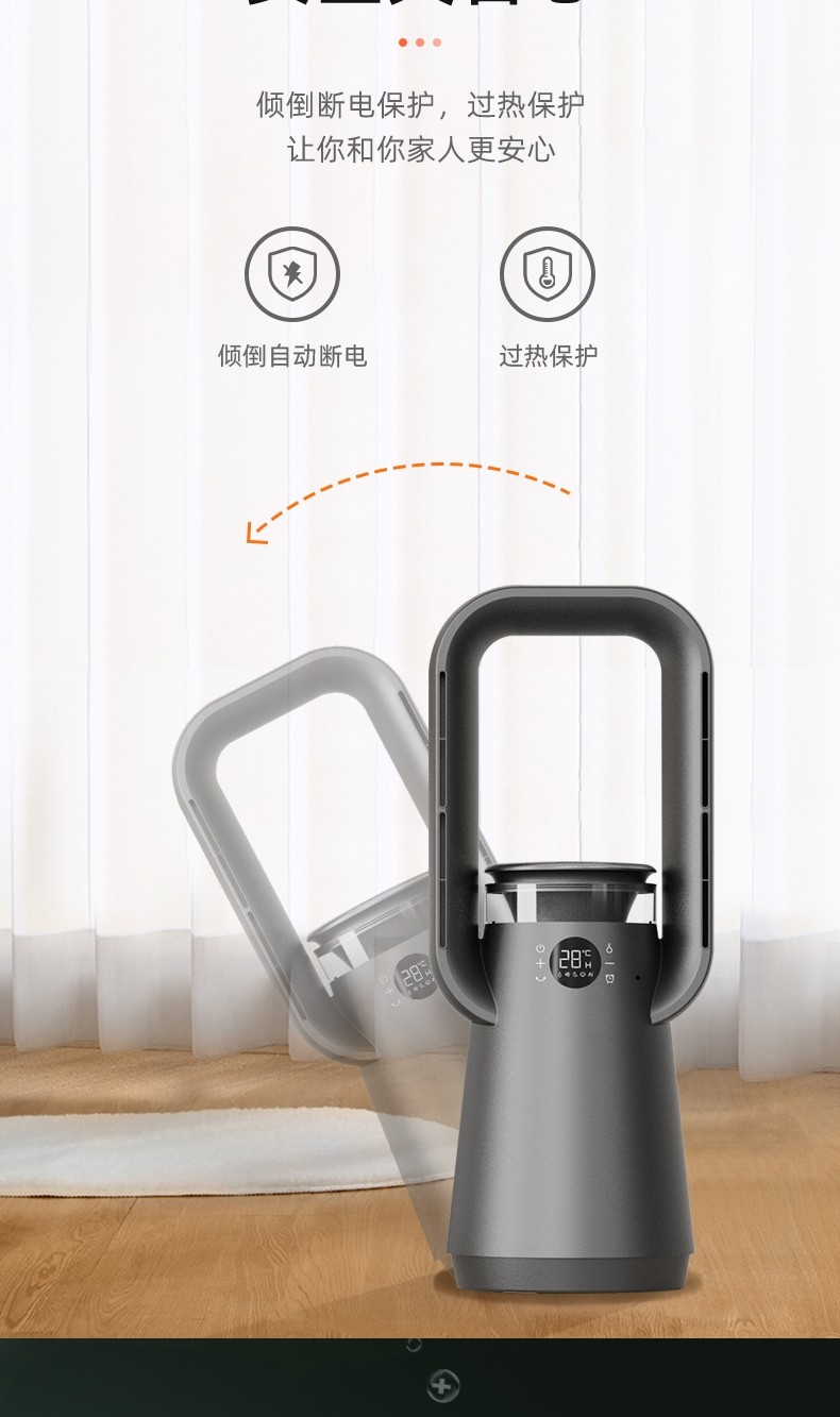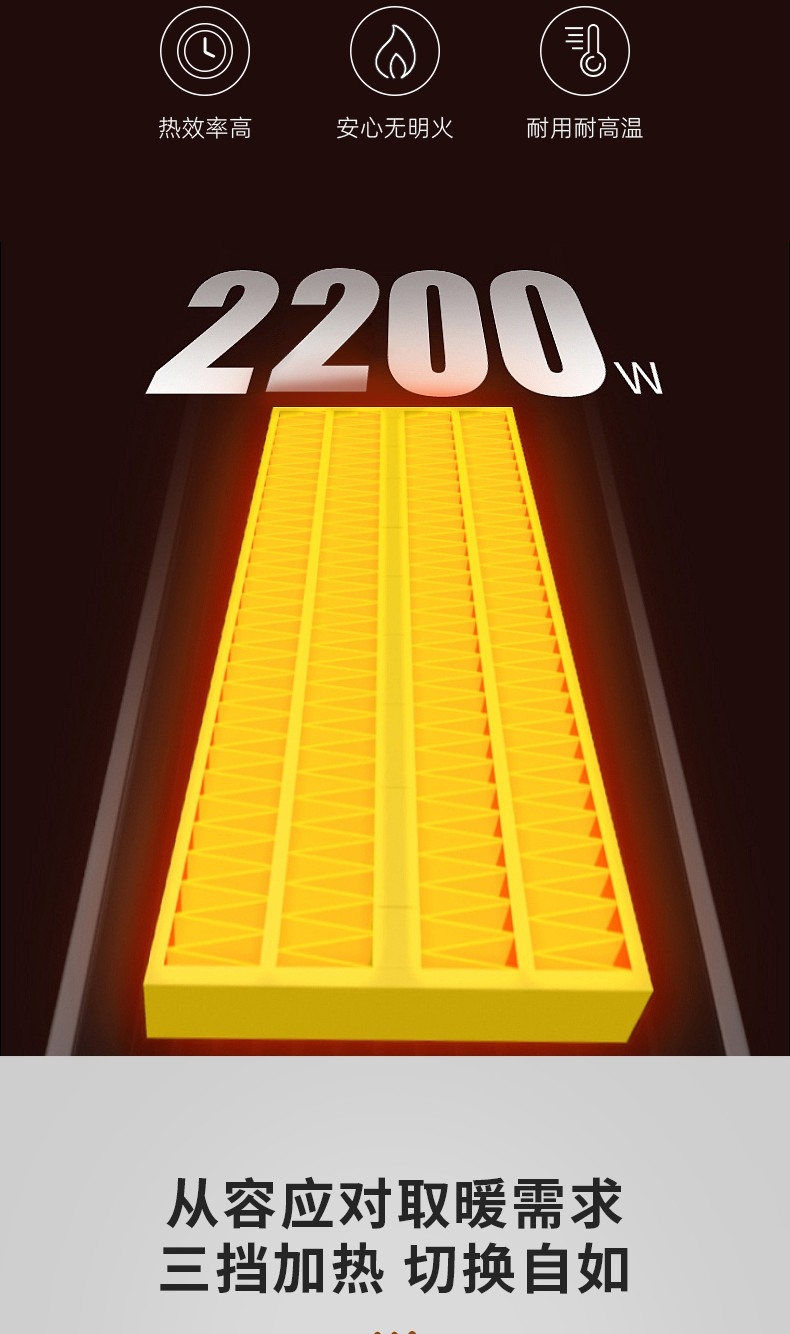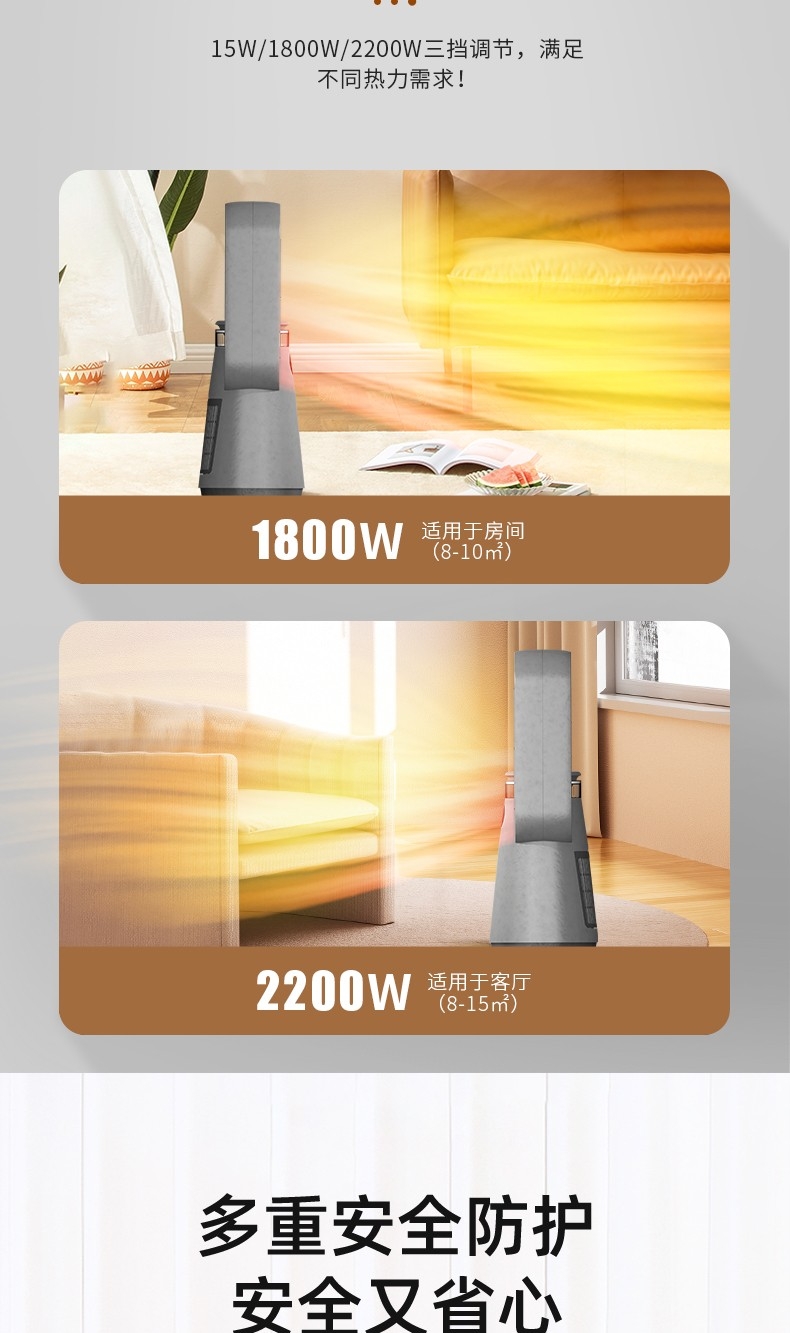 操作方式:遥控+触控+声控 三重操作模式;发热体:PTC石墨烯发热体;功率档位:15W、1800W、2200W三档功率调