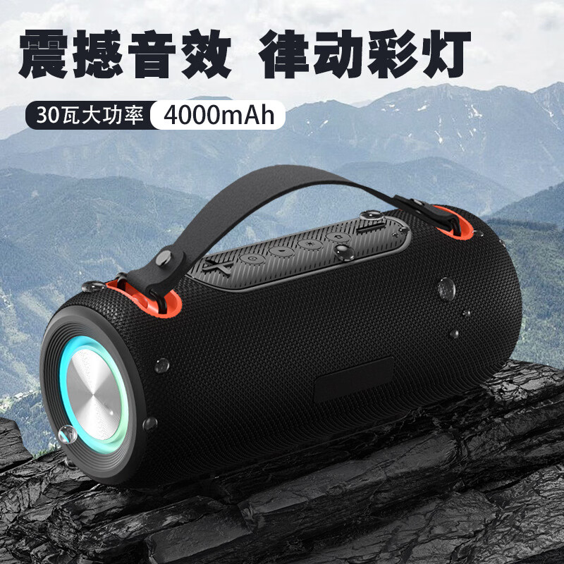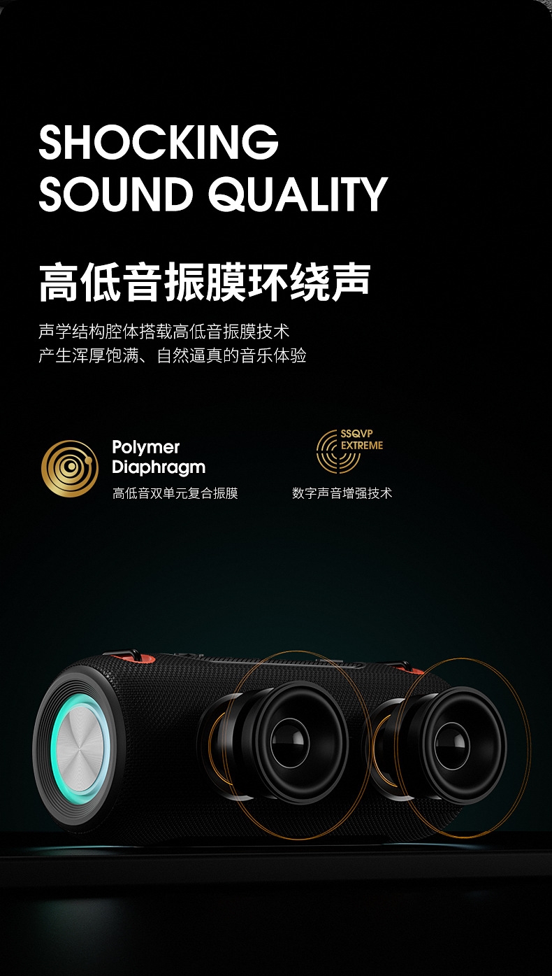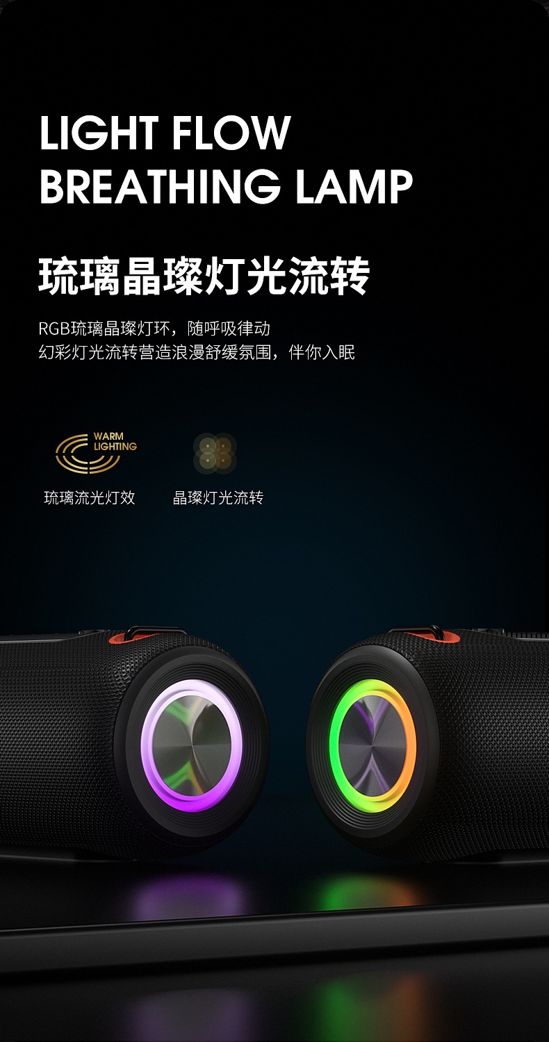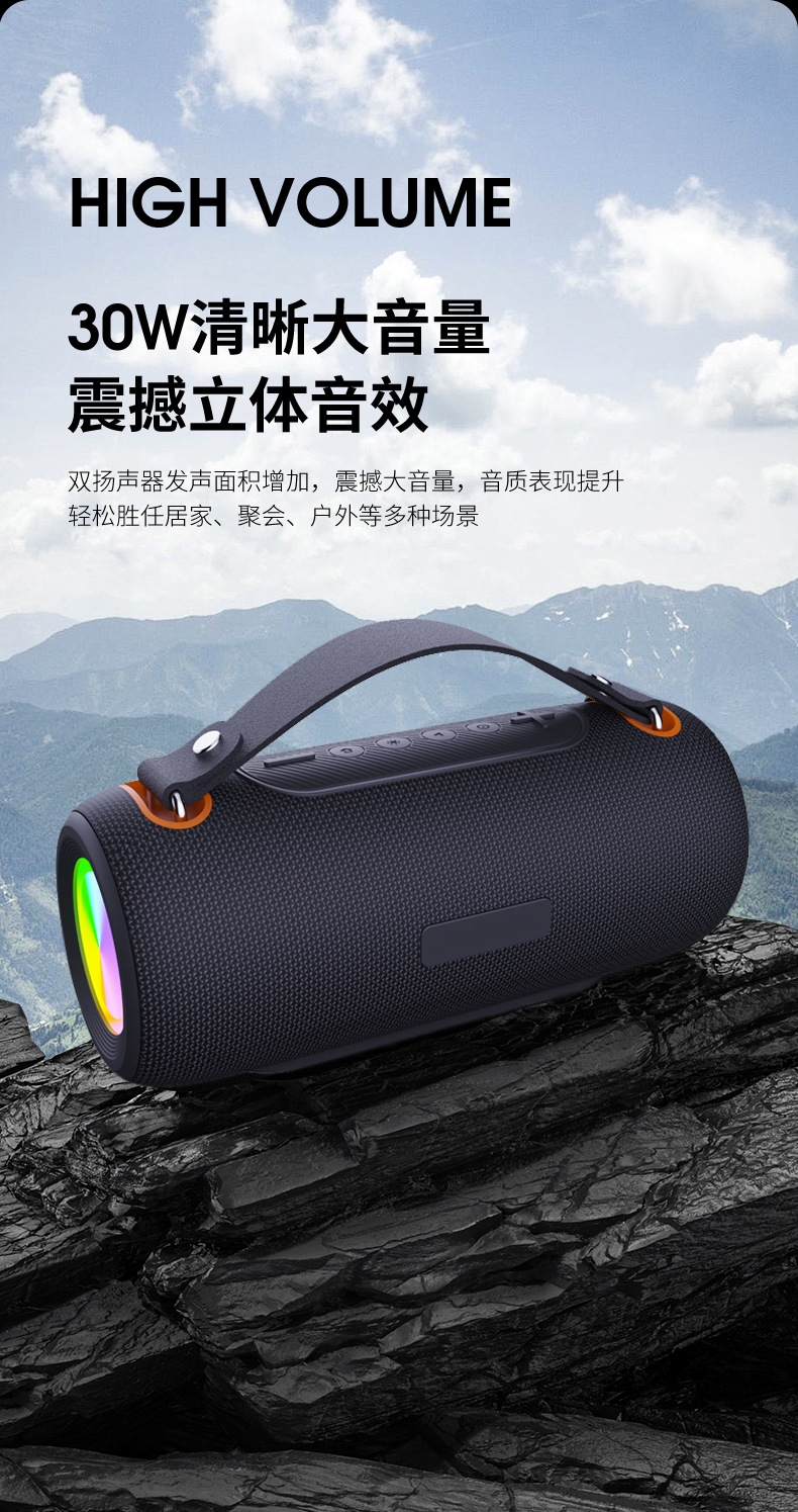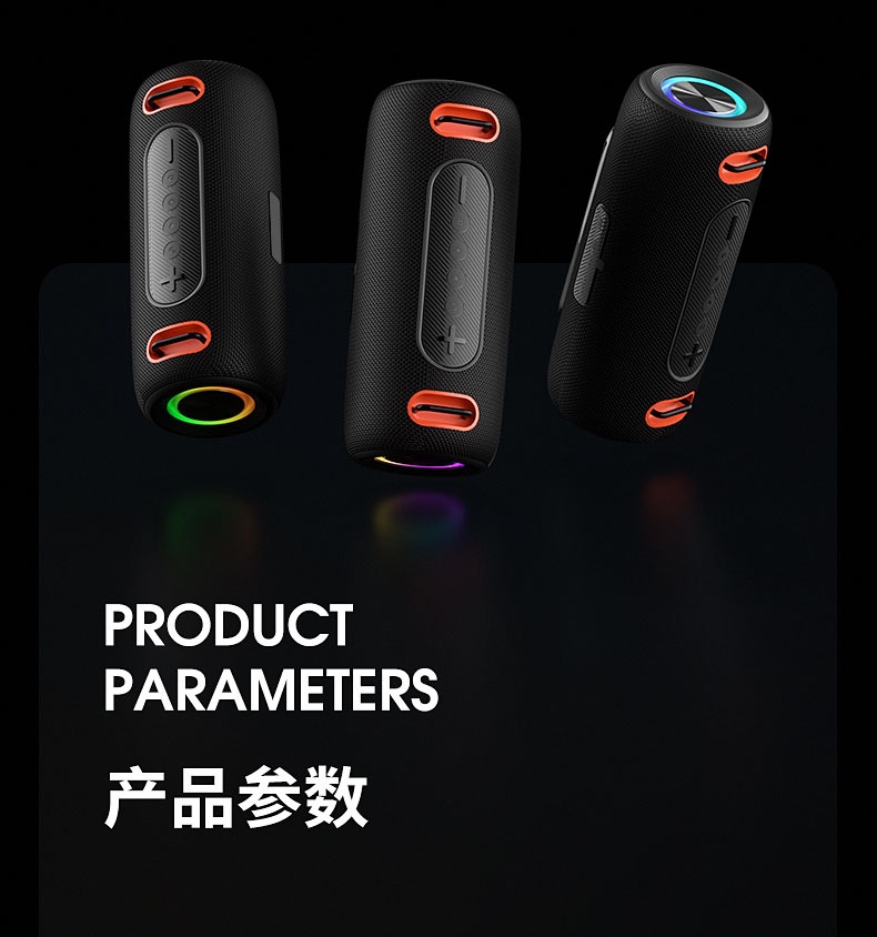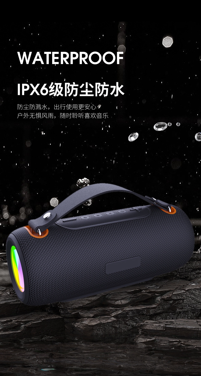 230*96*96mm、多功能插孔、可挂绳设计;炫彩灯效、IPX6级防水、HIFI音效、超长续航;方便携带、蓝牙模式