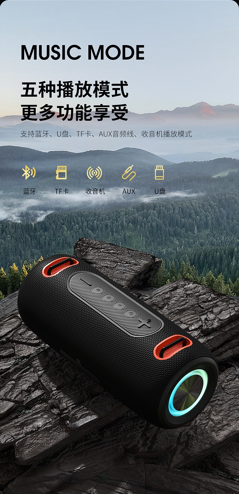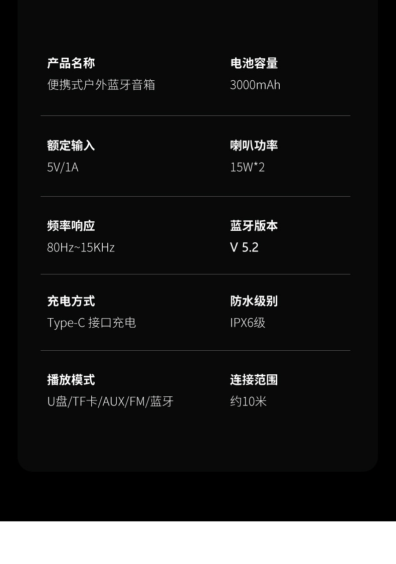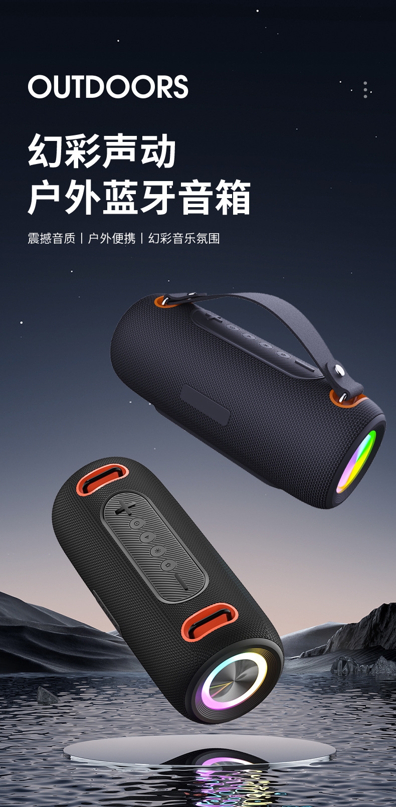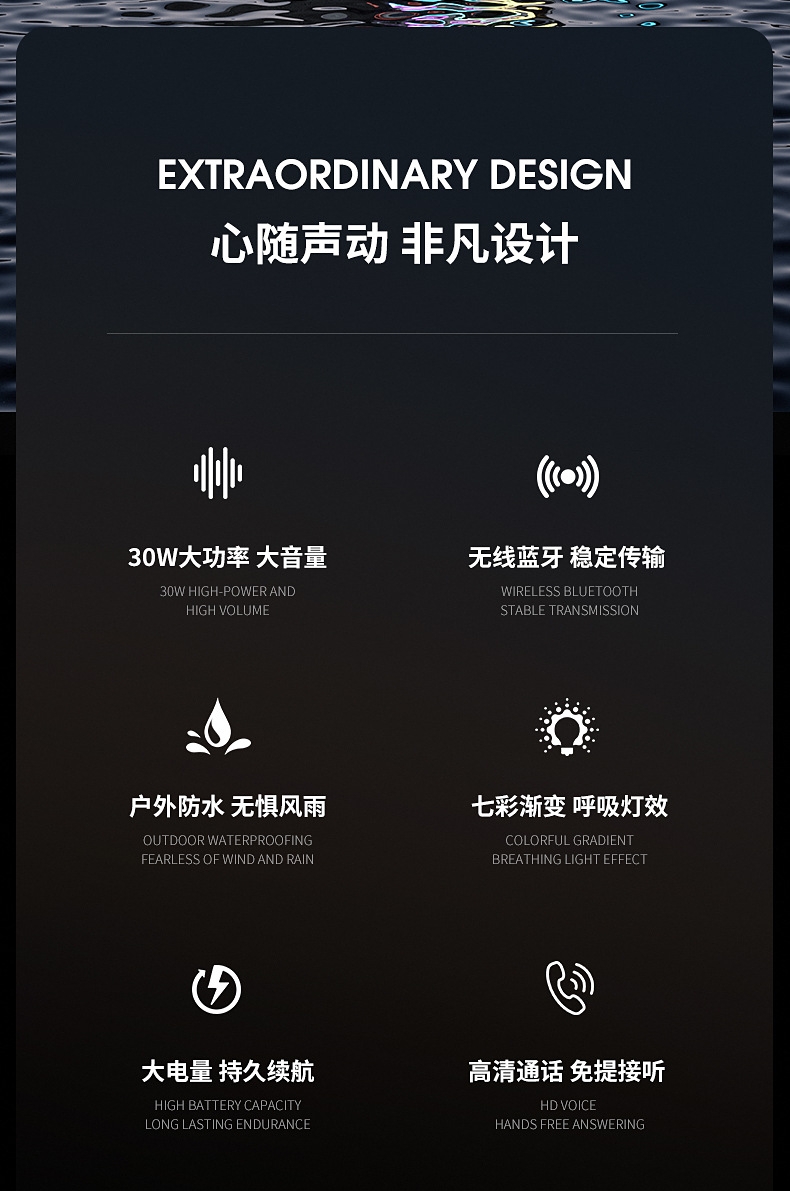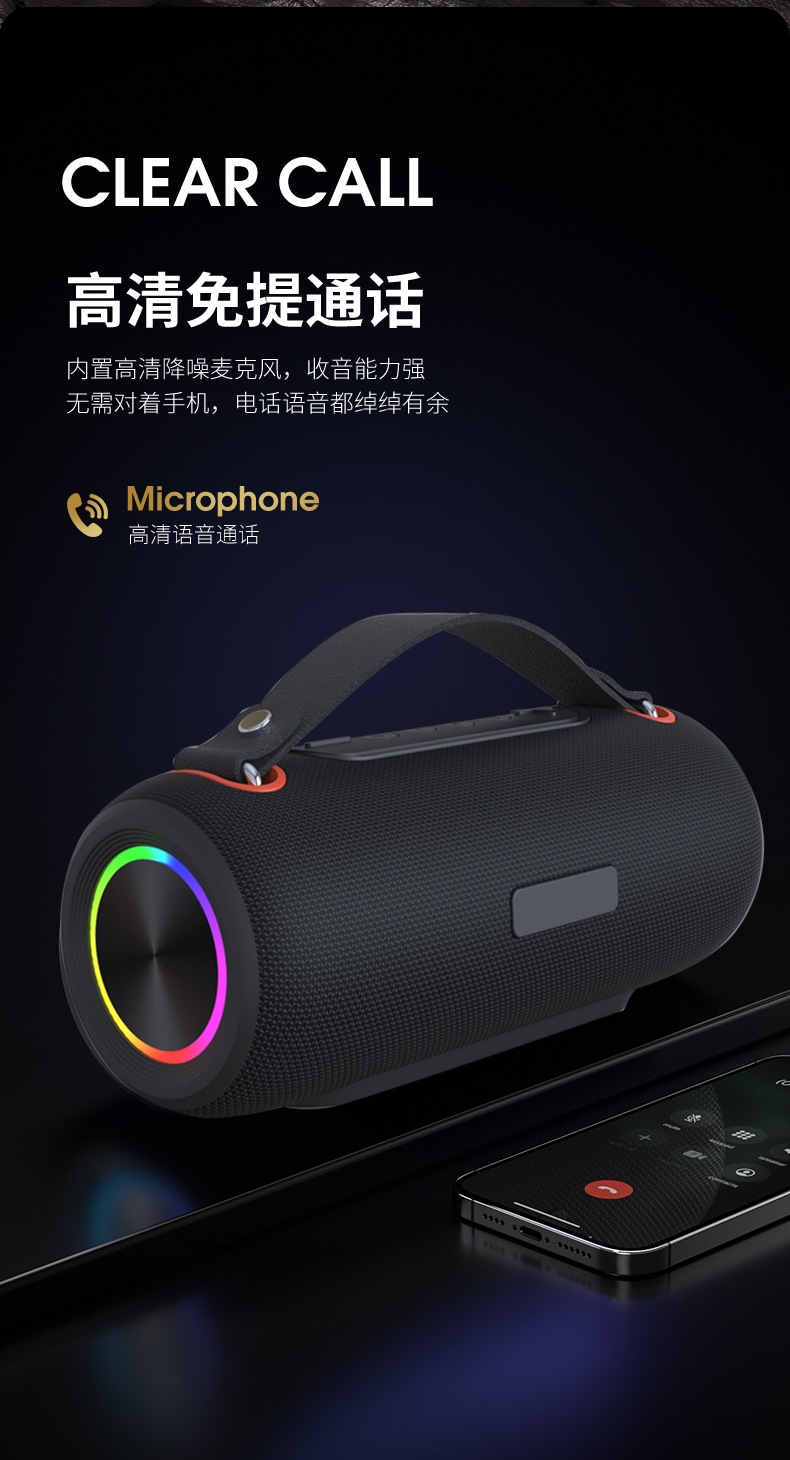 230*96*96mm、多功能插孔、可挂绳设计;炫彩灯效、IPX6级防水、HIFI音效、超长续航;方便携带、蓝牙模式