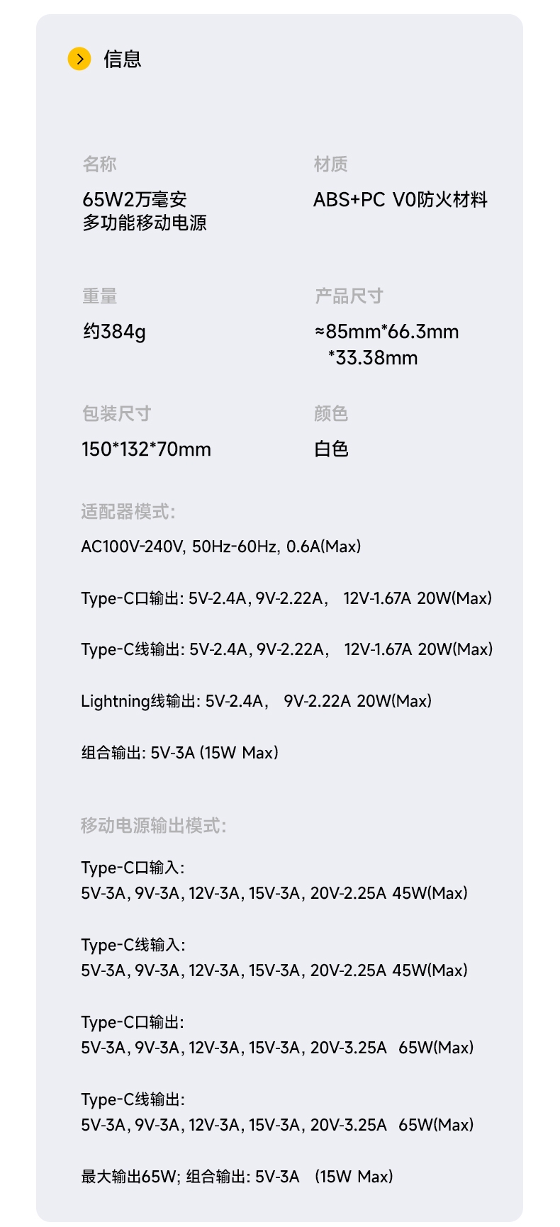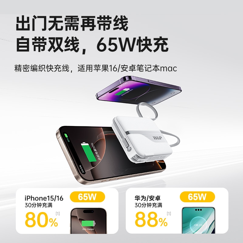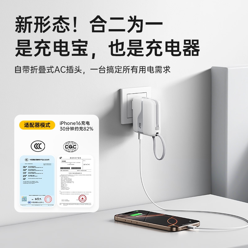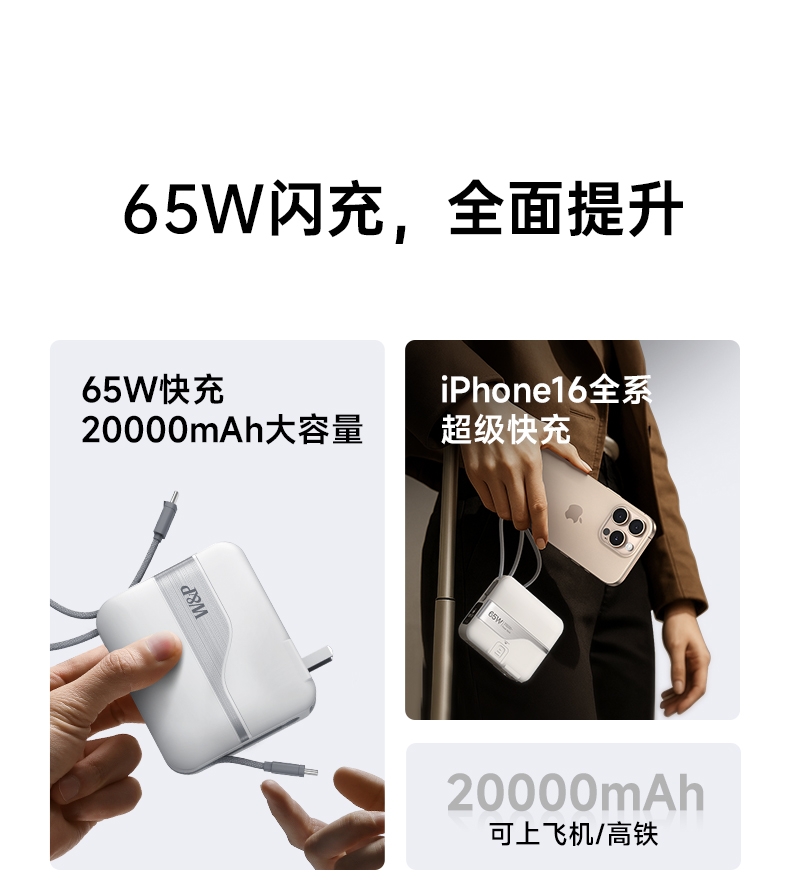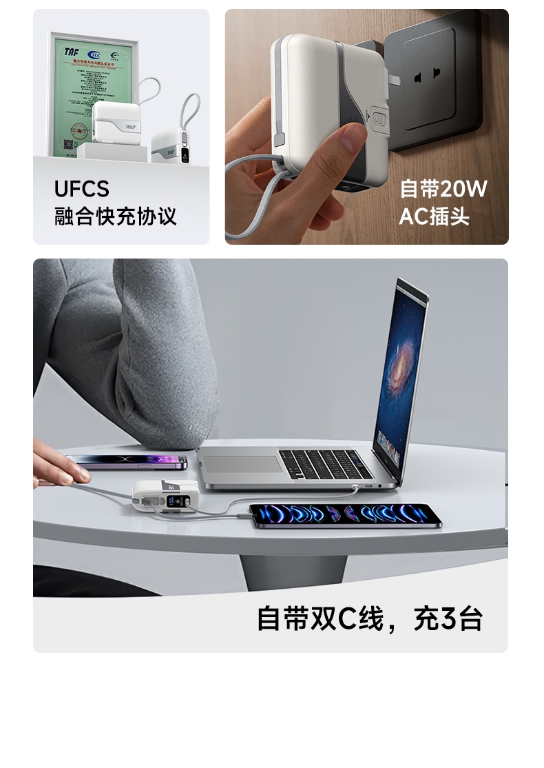 自带隐藏式AC插头和双快充线;LED数码显示,便携拎手;国家3C认证,放心上飞机