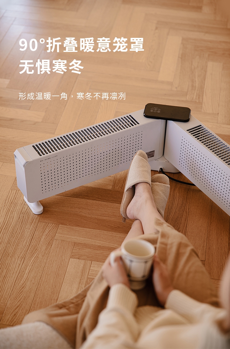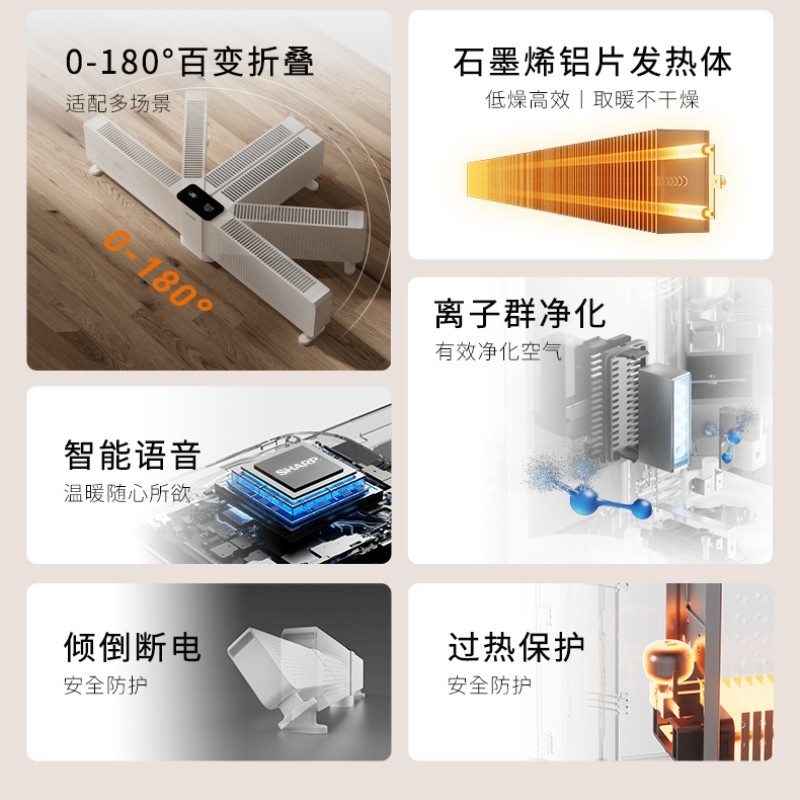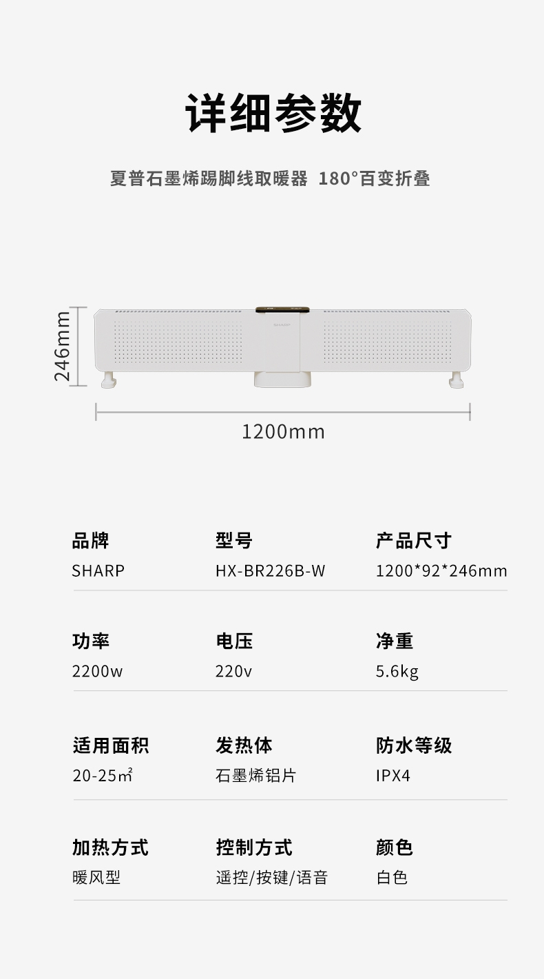 操作方式:遥控+触控+声控 三重操作方式;发热体:石墨烯铝片发热体;档位功率:2200W、1100W两档功率
