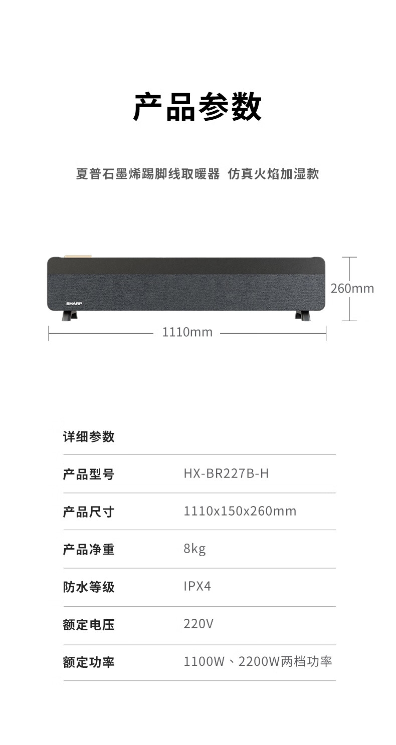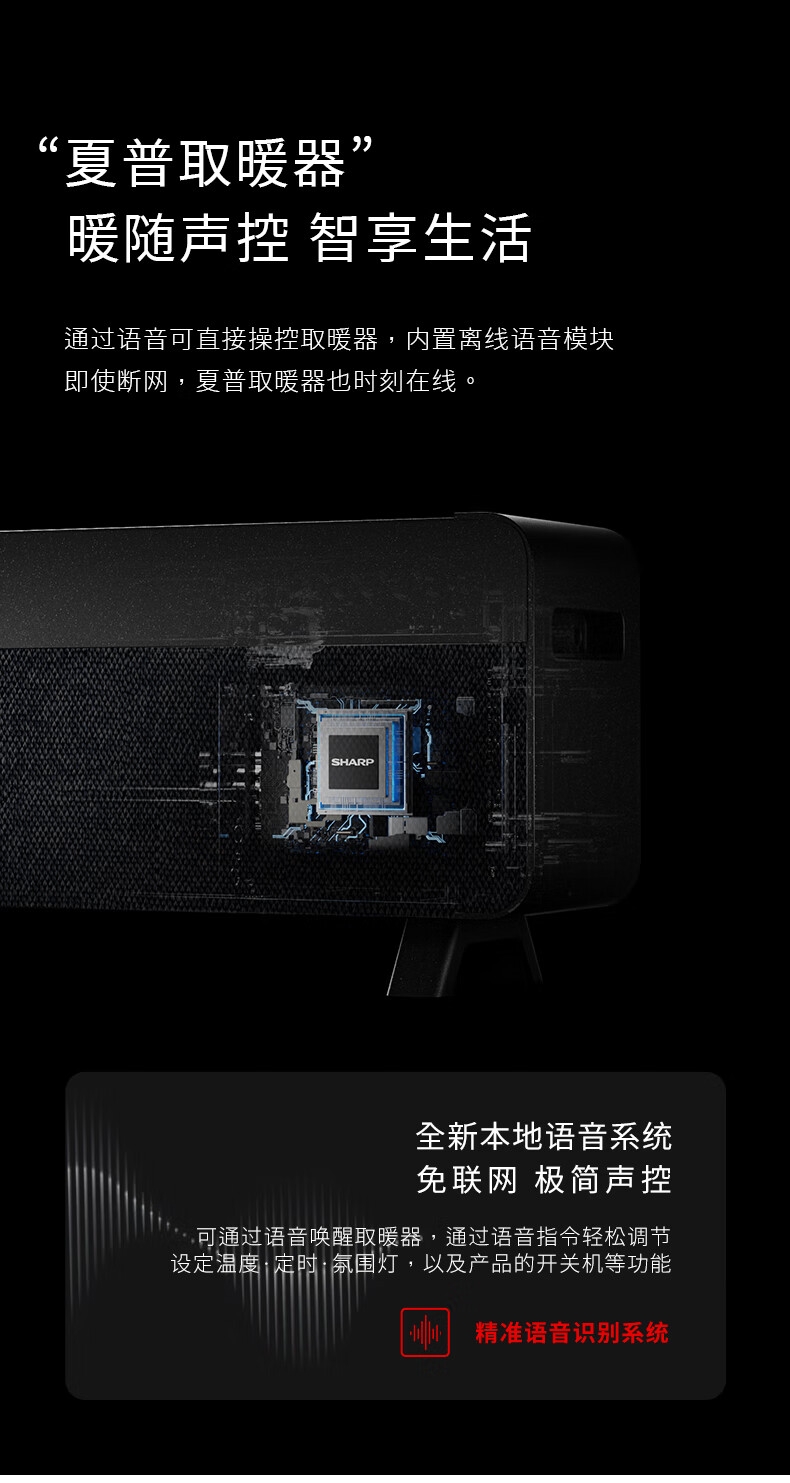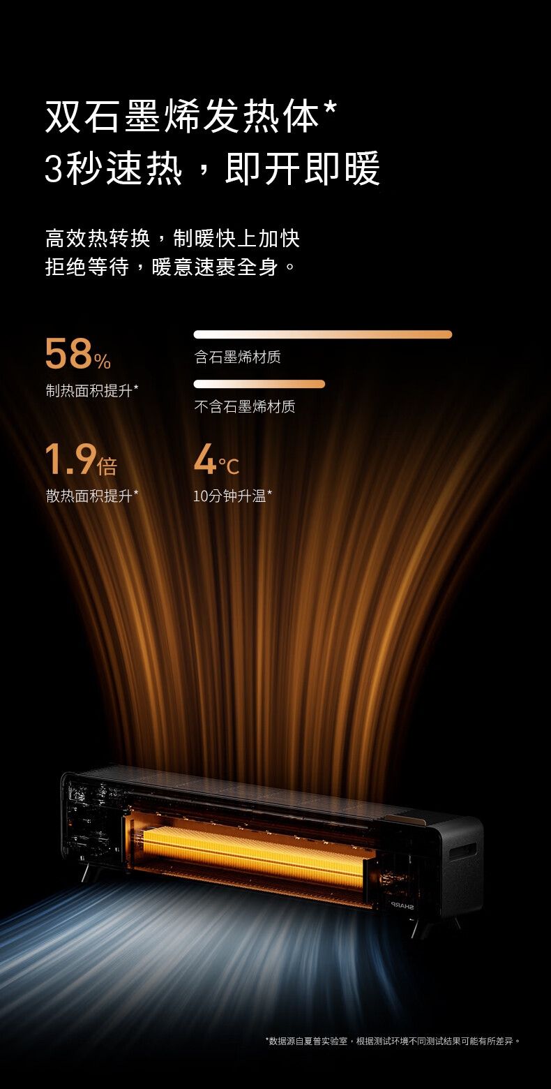 操作方式:遥控+触控+声控 三重操作模式;功率档位:1100W、2200W两档功率;发热体:石墨烯铝片发热
