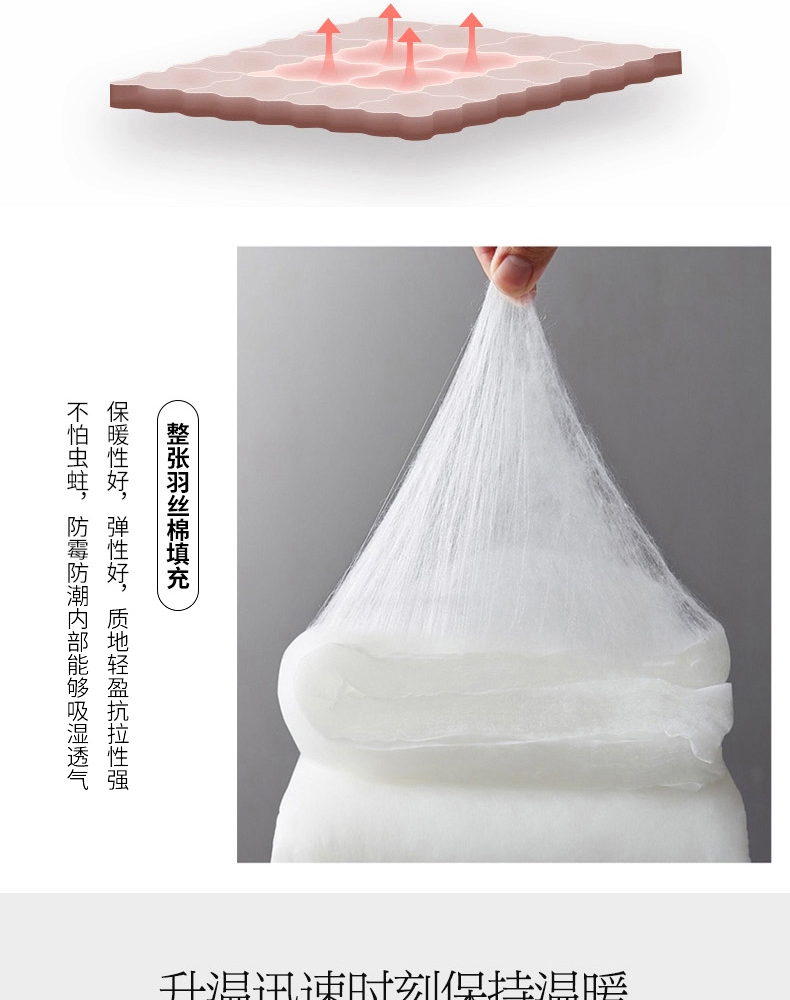 撞色包边,绗缝设计,美观又温暖;整张羽丝绒填充,稳固定型,不跑绒,保暖性强;彩盒、无纺布两种包装,满足集采代发不同需求