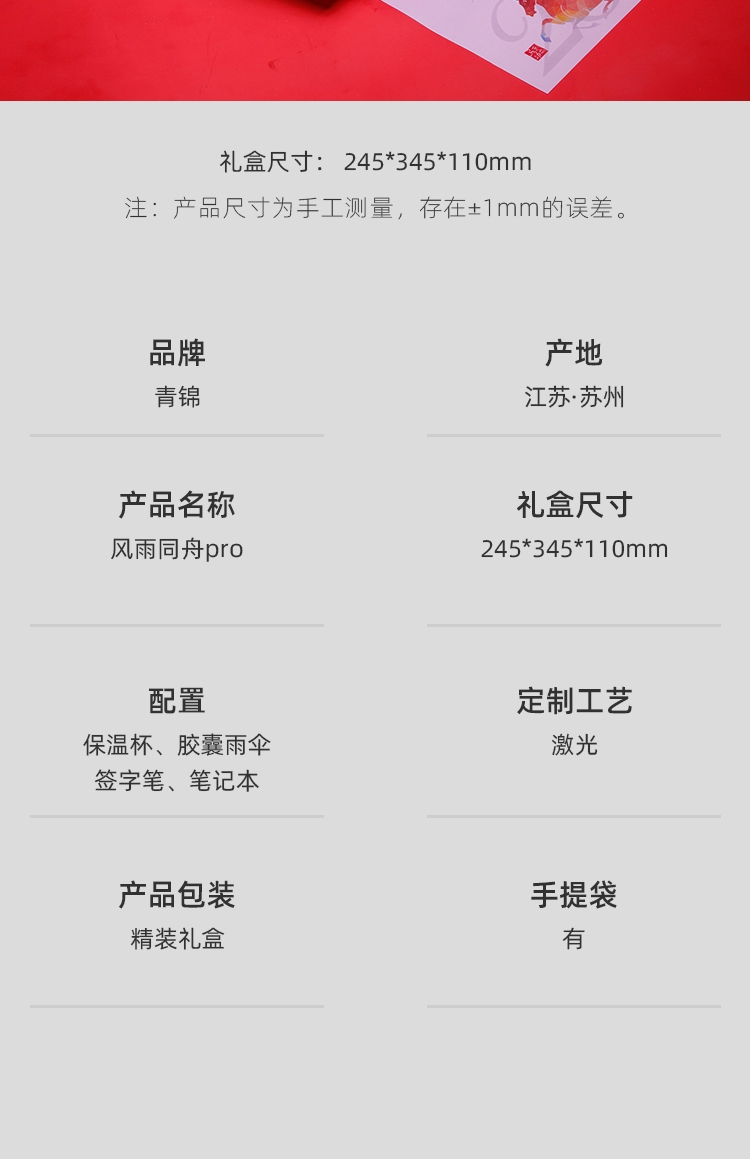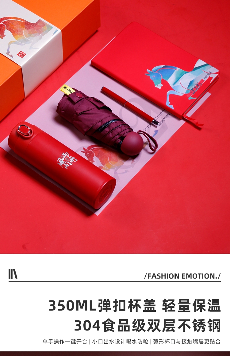 配置清单:配置 名仕保温杯350ML*1 颜色:红色 坐标签字笔*1 颜色 红色/黑色 青马笔记本*1 颜色红色/白胶囊雨伞*1 手提袋套*1 精装礼盒手提袋*1 材质 保温杯:304钢 签字笔:金属 笔记本:皮革千越象牙白纸100克80张 雨伞:碰击布过黑胶 晴雨两用 可以遮阳 尺寸 笔记本:130*212mm 签字笔:141*10mm 雨伞:175*50mm 保温杯:200*60*60mm 礼盒:245*345*110mm