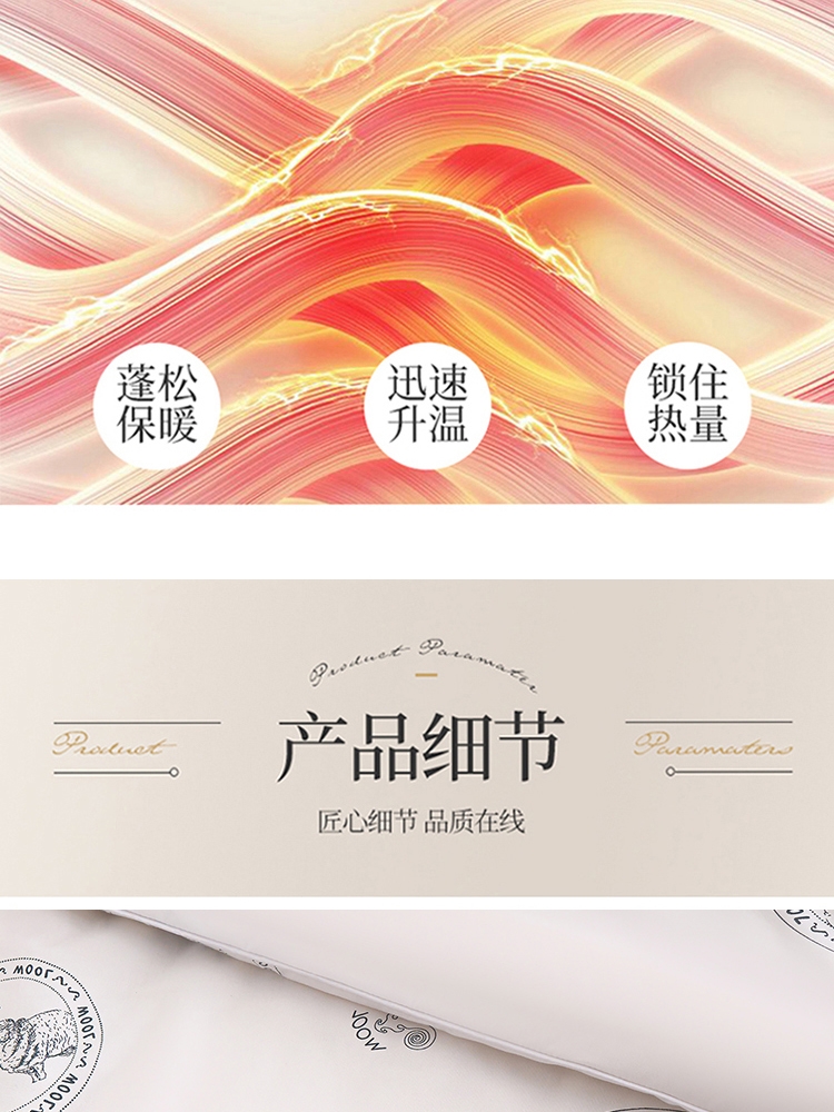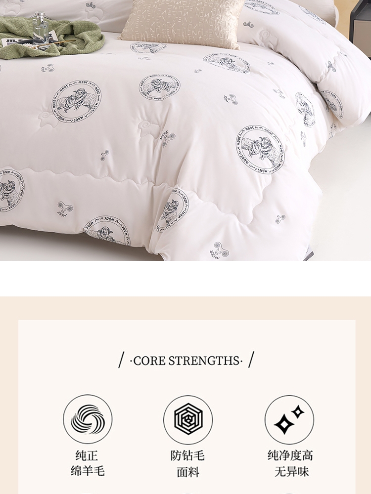 绵羊毛填充,保暖又舒适;绗缝设计,稳固定型,不跑毛;彩盒、无纺布两种包装,满足集采代发不同需求