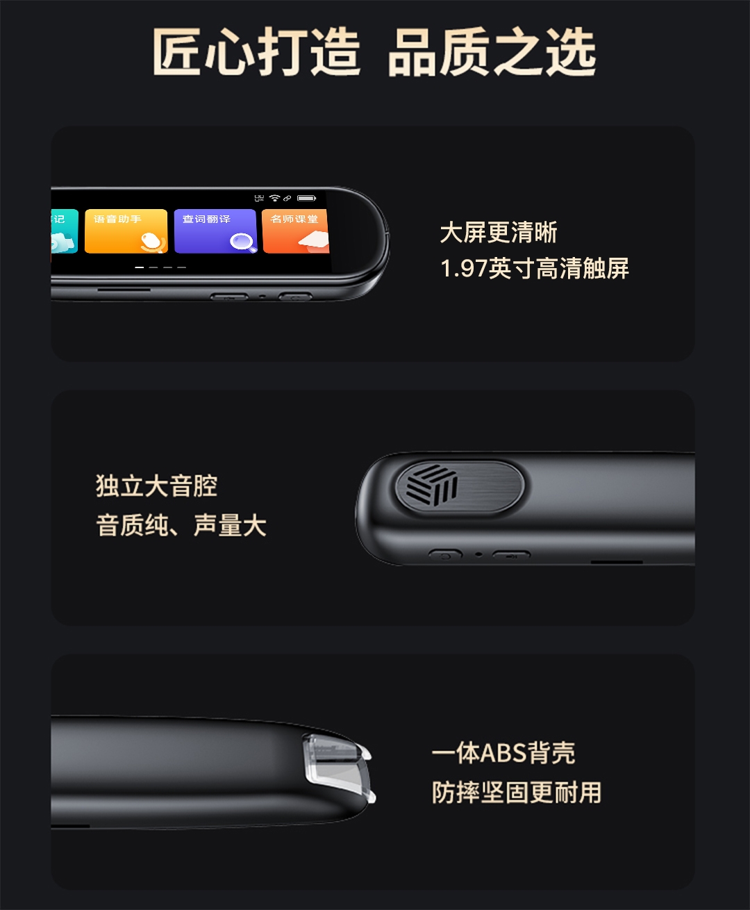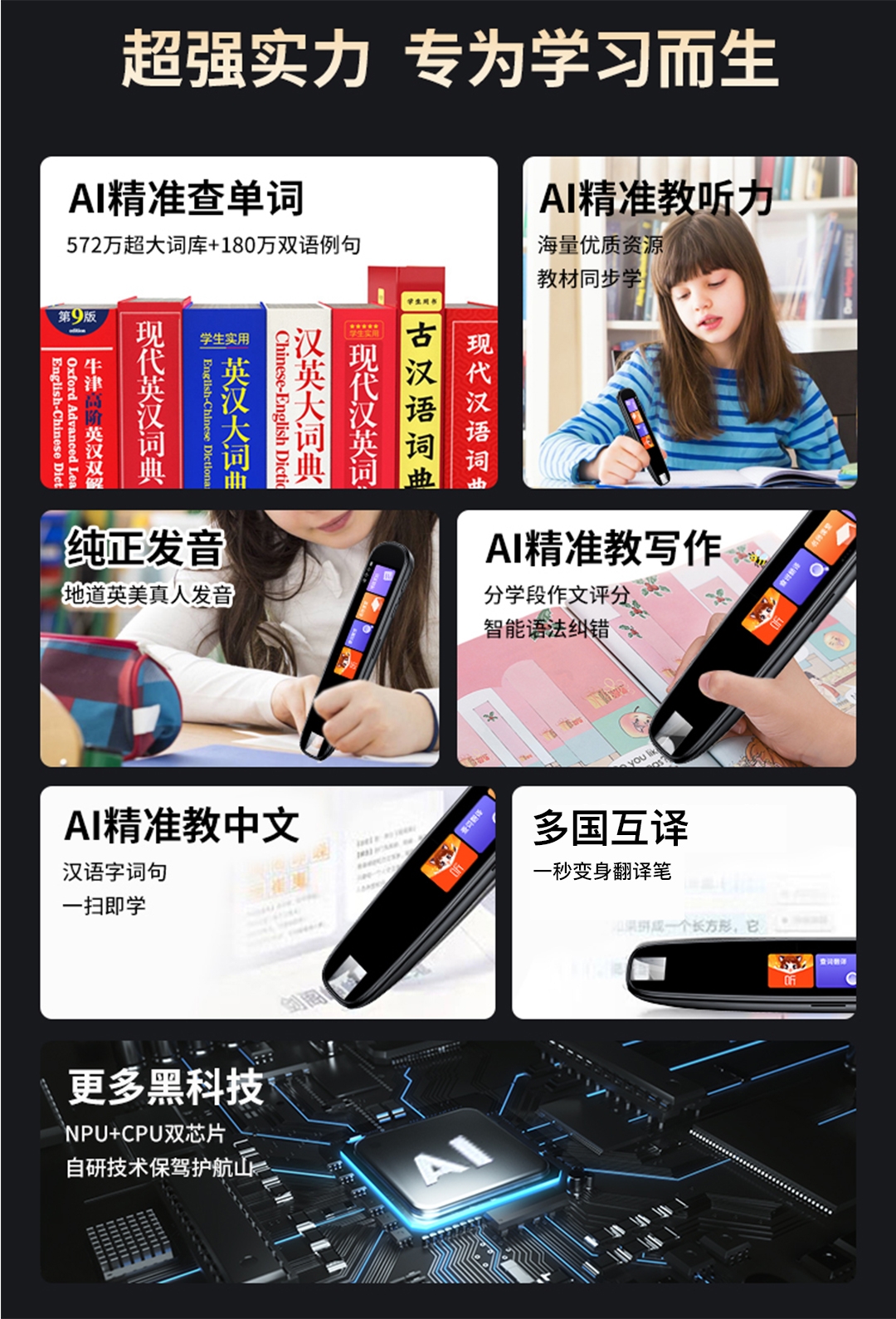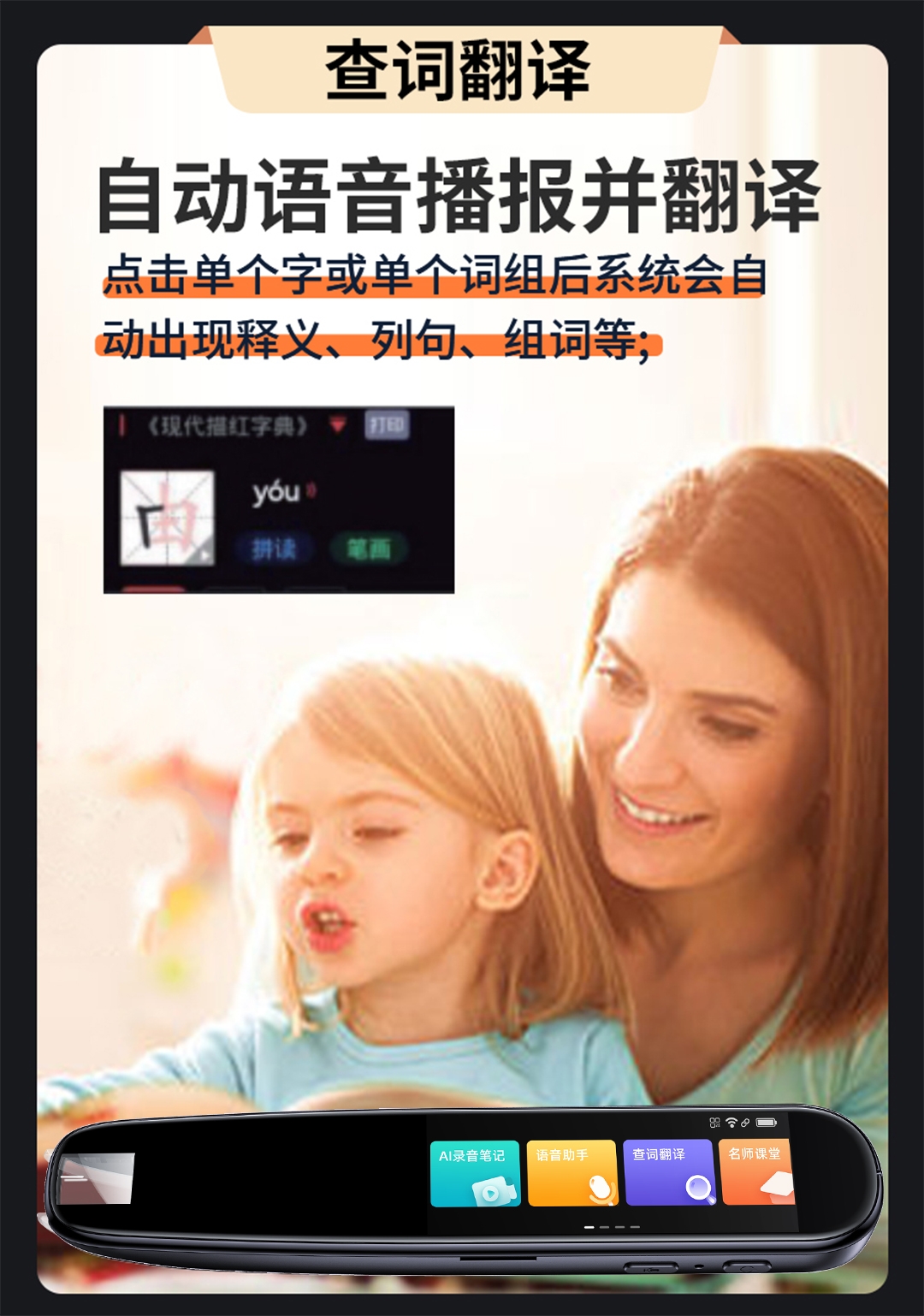 查词翻译、难题求助、名师课堂;作文指导 多国互译、音标学习、拼音学习;笔画练习 语音助手、喜马拉雅、AI录音笔记、文本摘