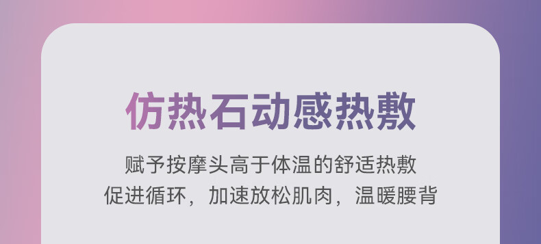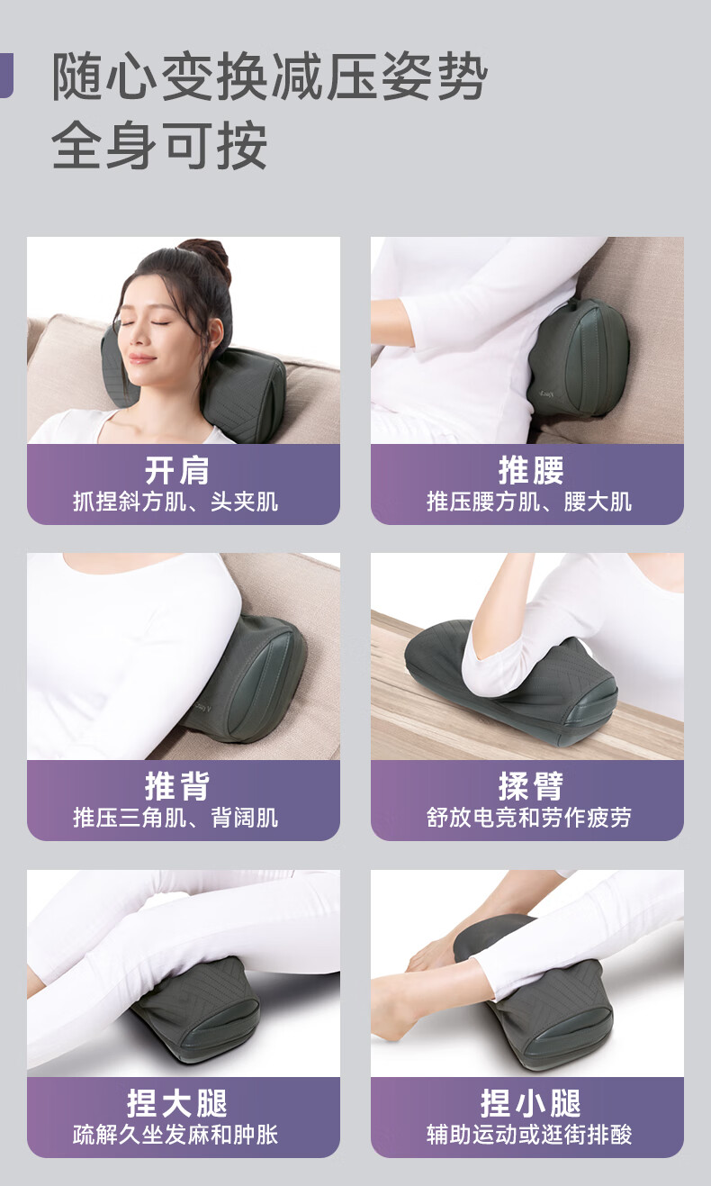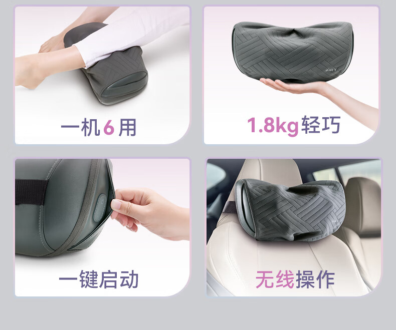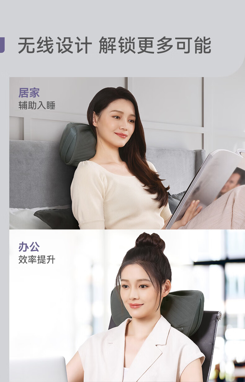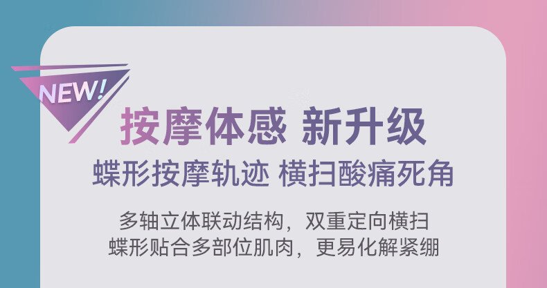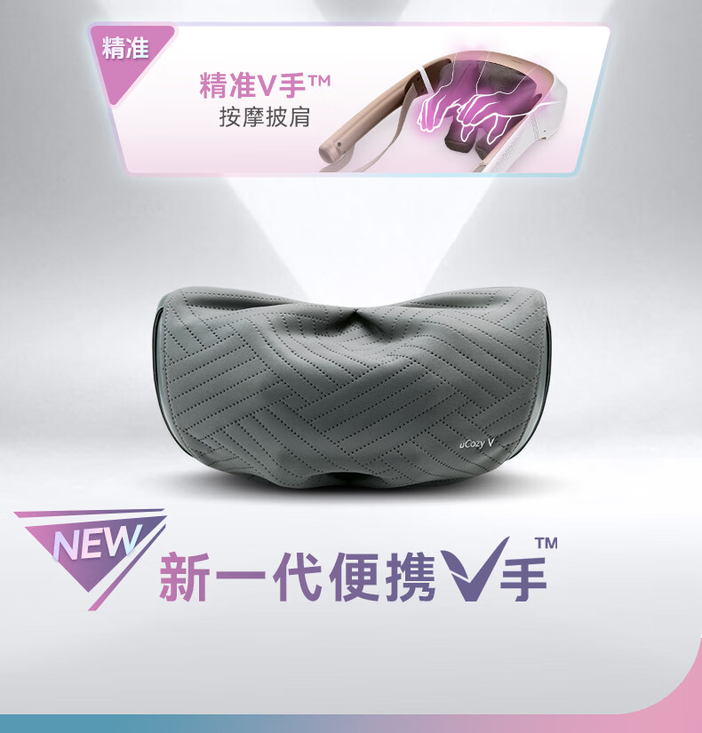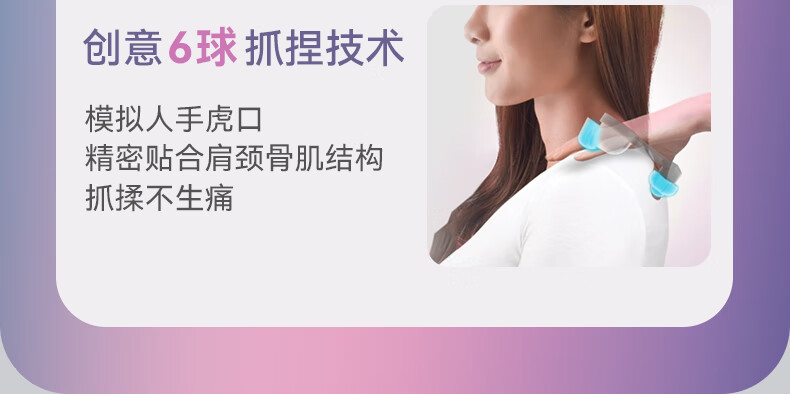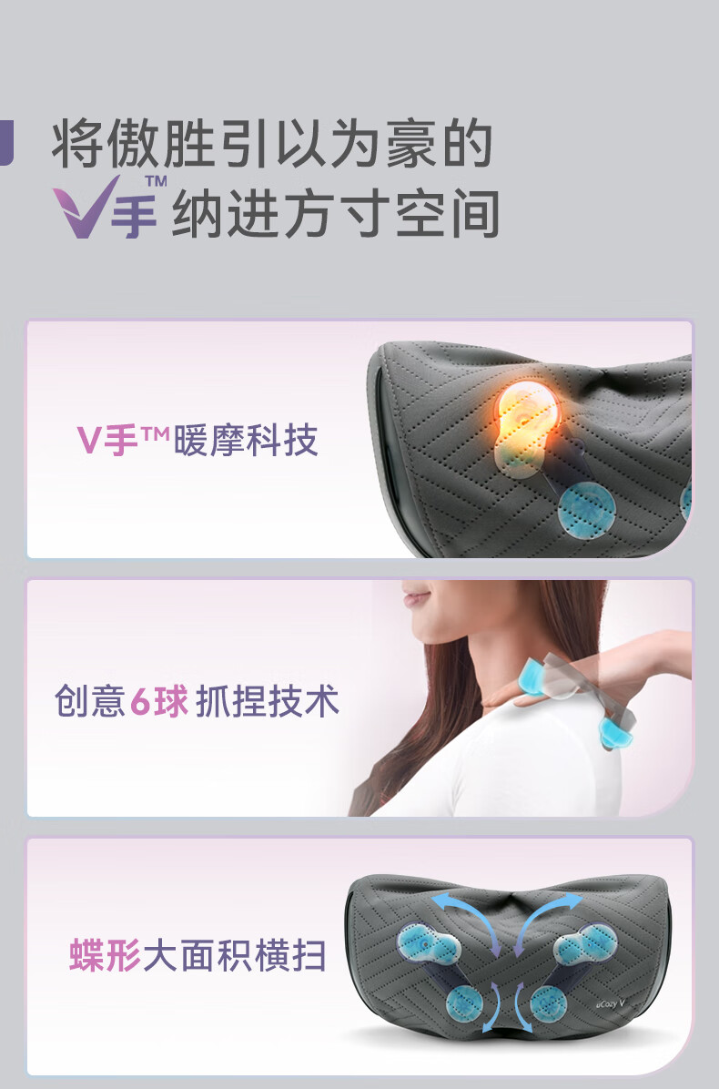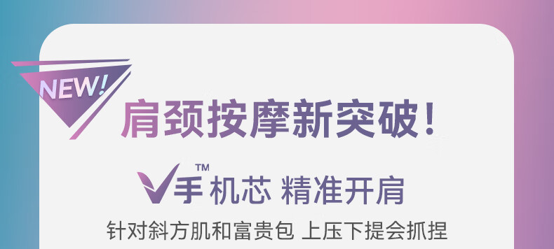 V手专利机芯精准开肩,针对斜方肌和富贵包;蝶形按摩轨迹,横扫酸痛死角,仿热石动感热敷促进循环;无线操作,轻巧便携,一机多用