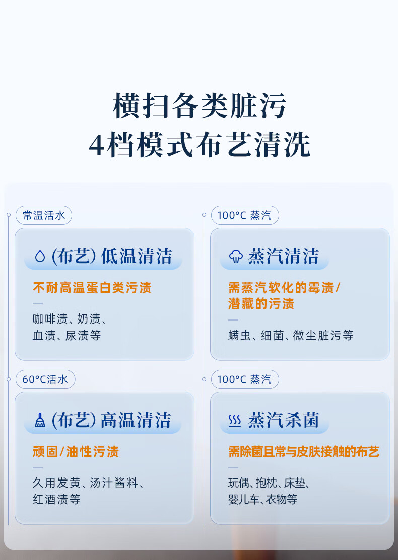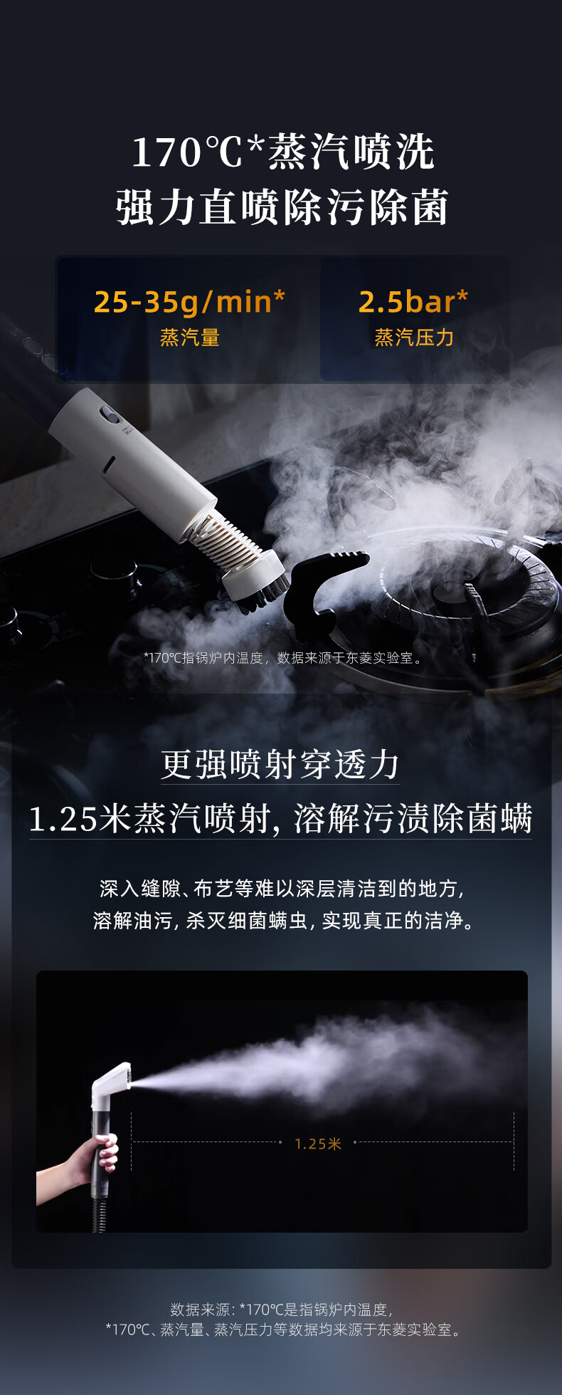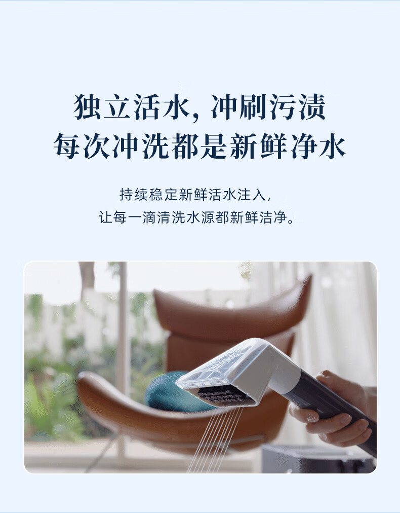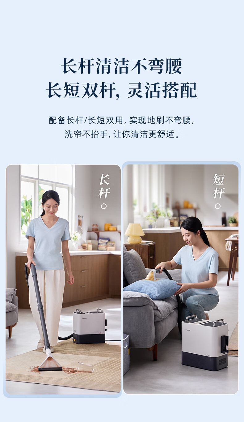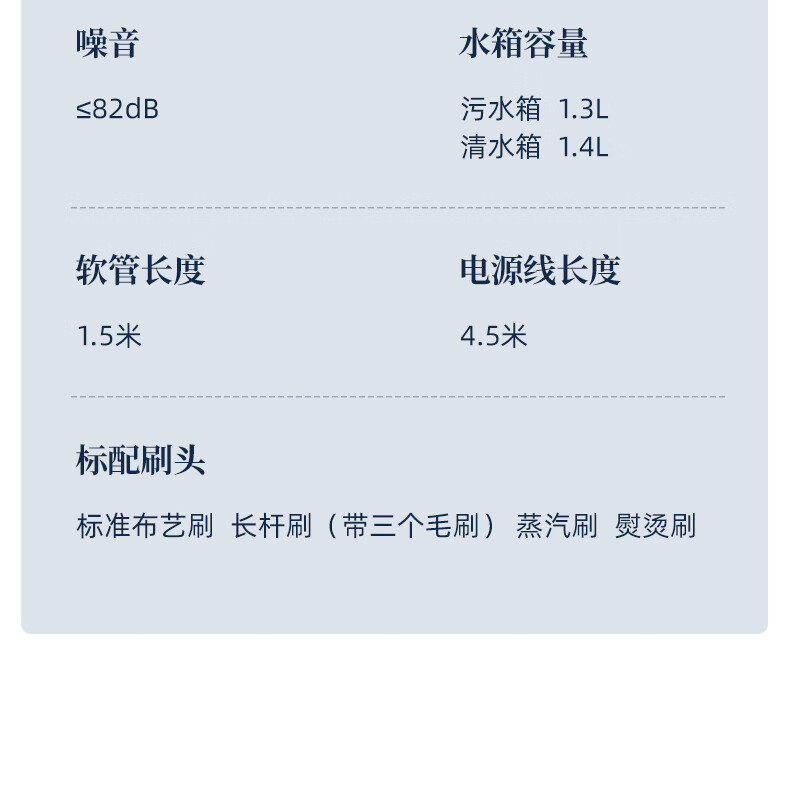 专刷专用,长短杆搭配,地毯清洁不弯腰;170℃蒸汽喷洗,强力直喷除污除菌;强力清洁液350mL+50mL顽固清洁液),一键收