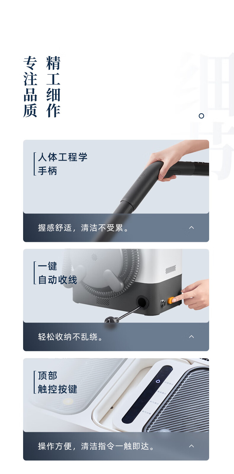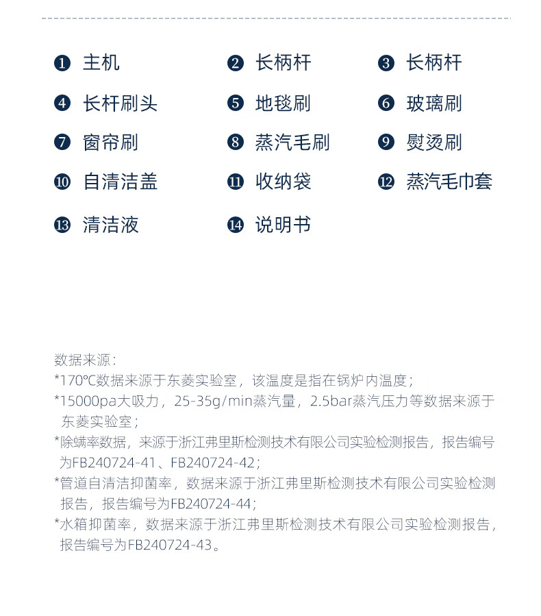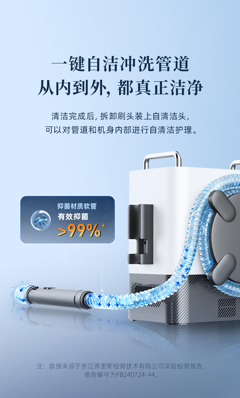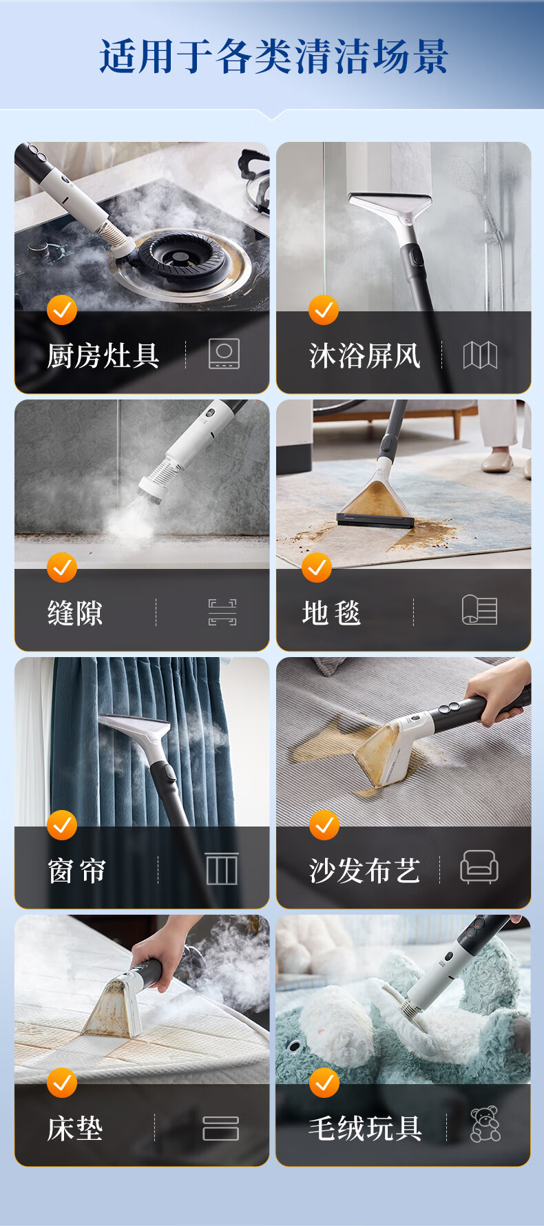 专刷专用,长短杆搭配,地毯清洁不弯腰;170℃蒸汽喷洗,强力直喷除污除菌;强力清洁液350mL+50mL顽固清洁液),一键收