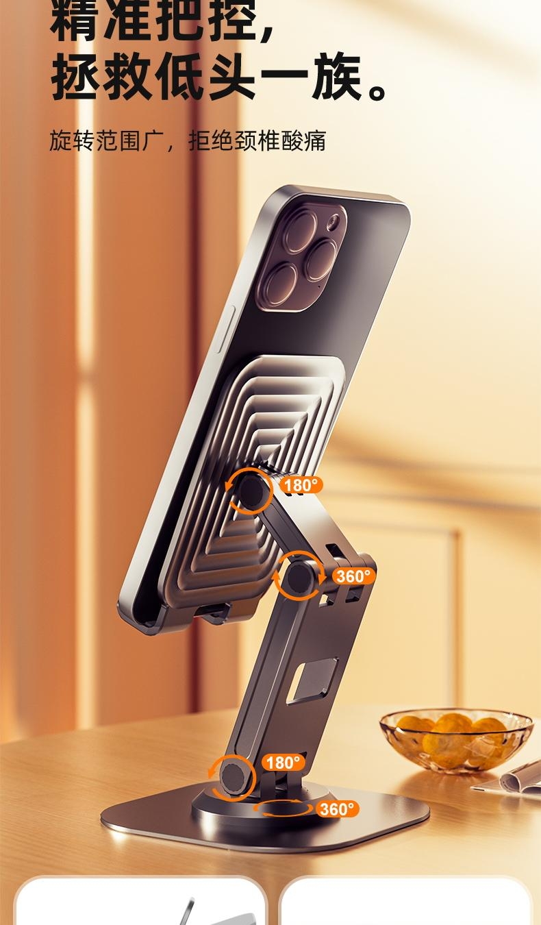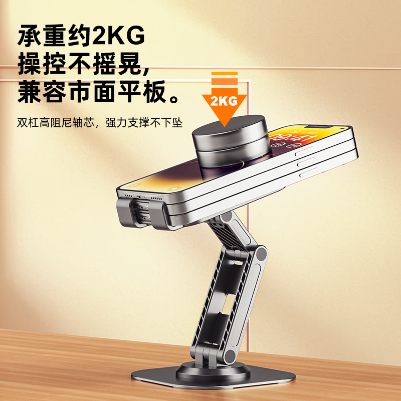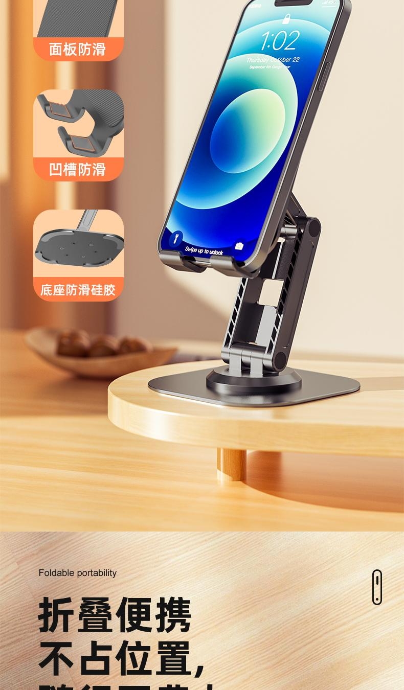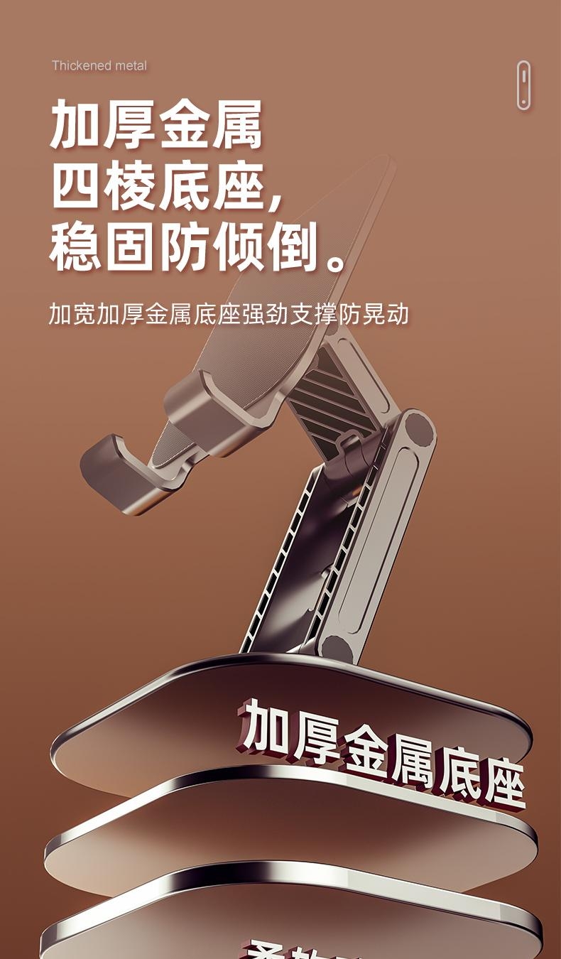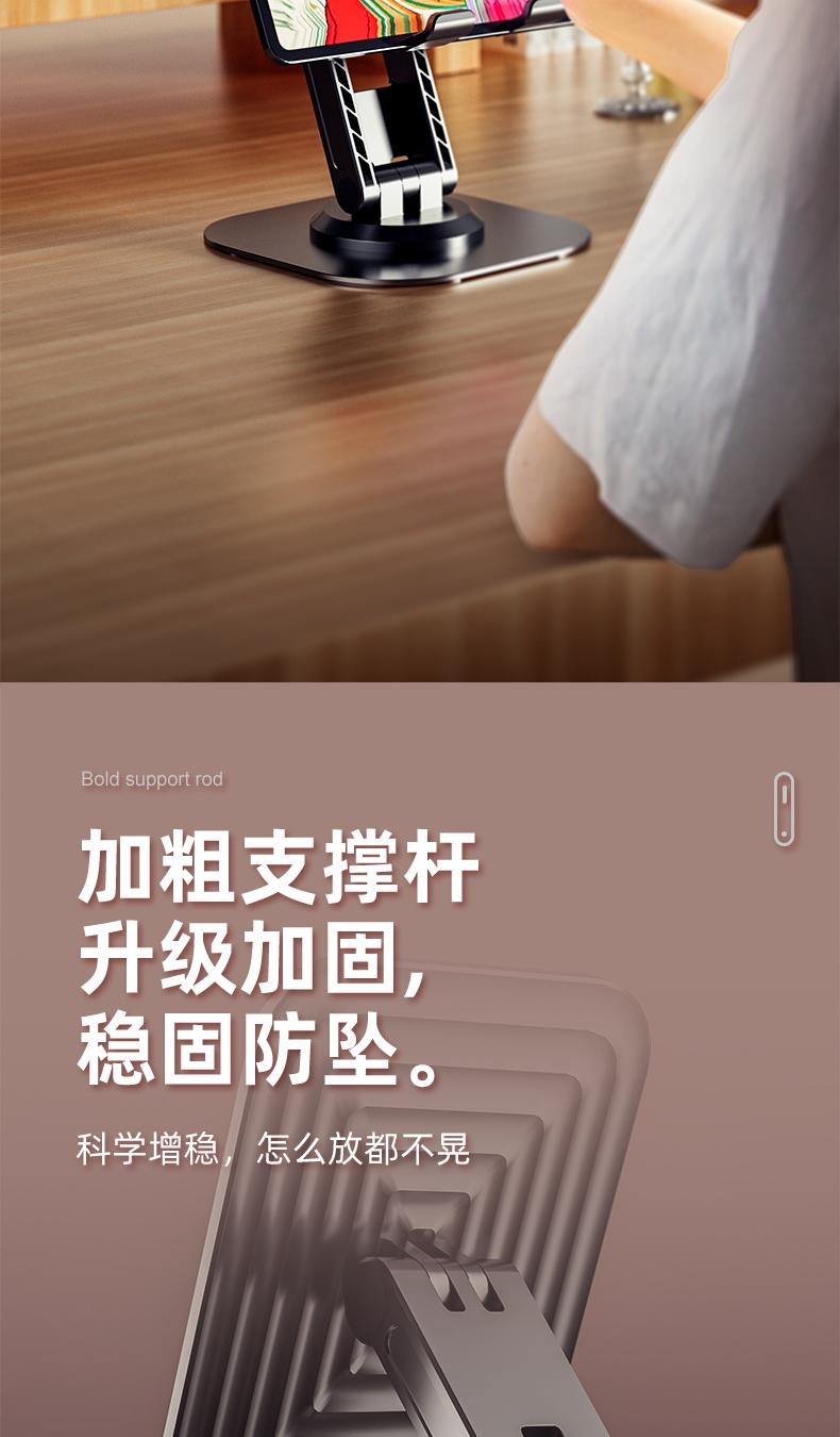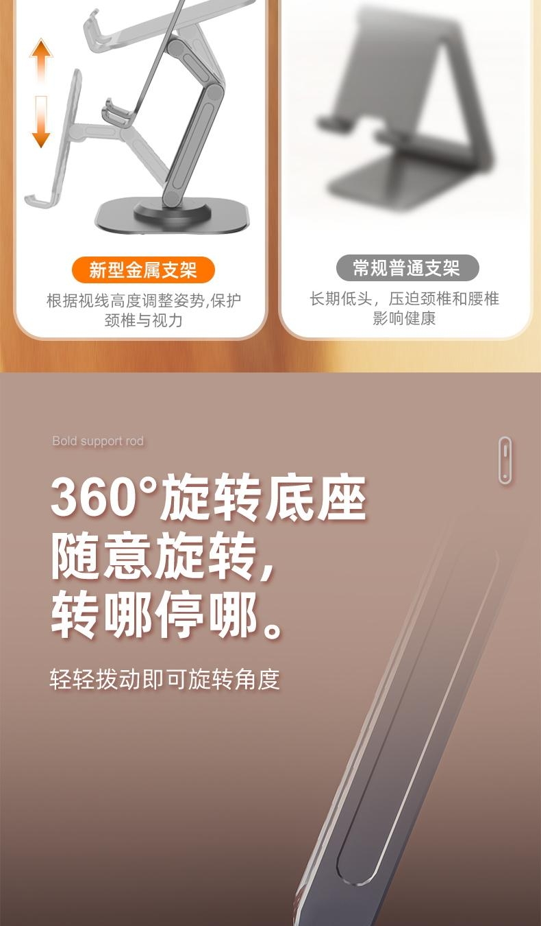 加厚金属、四棱底坐、升级加固支撑杆;360°旋转底座;预留充电口、一体式折叠