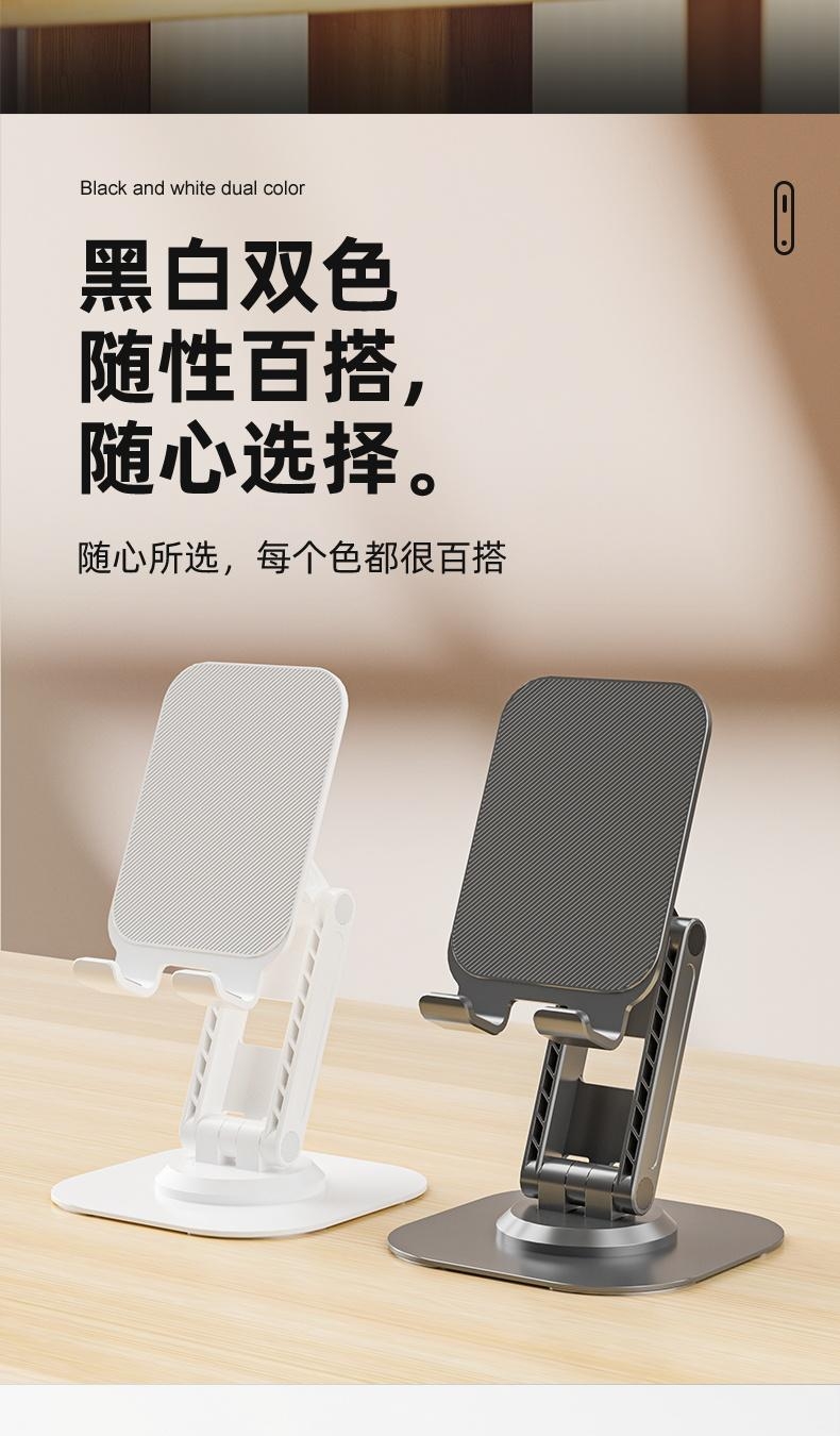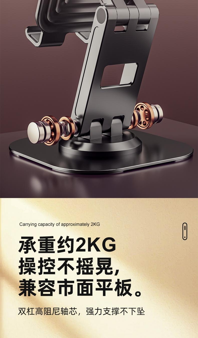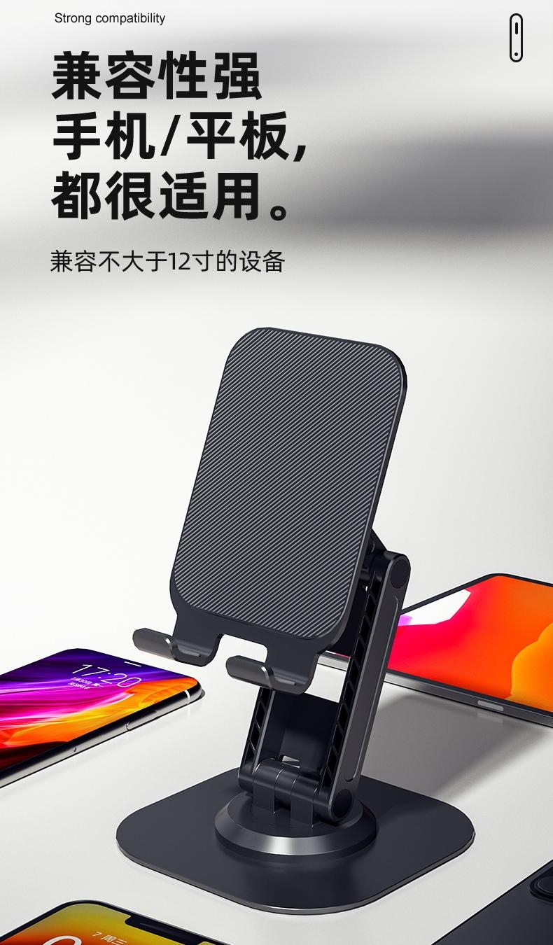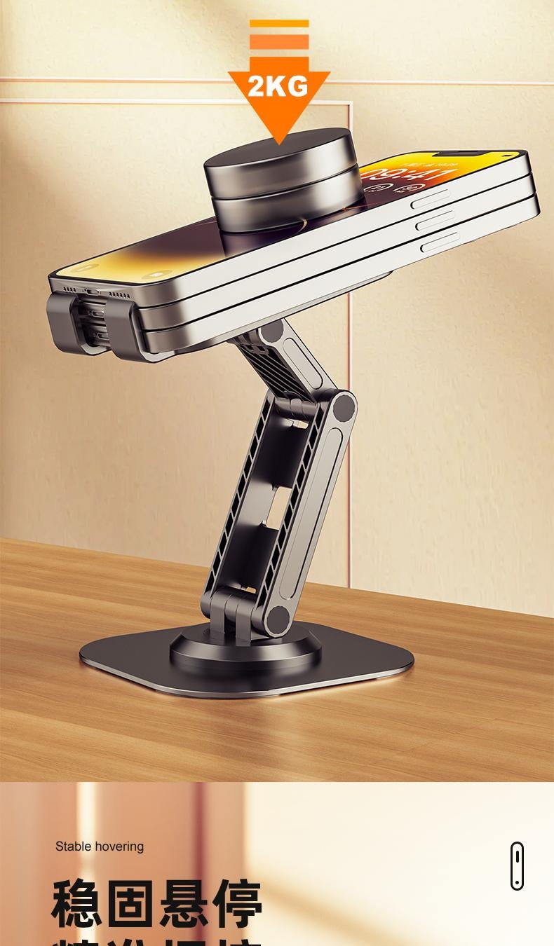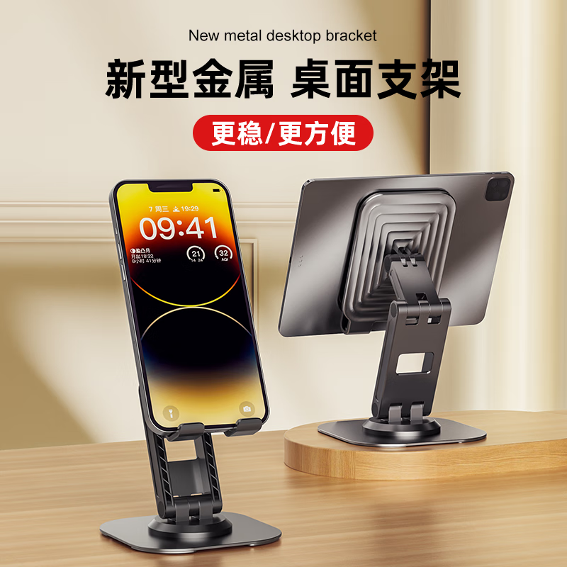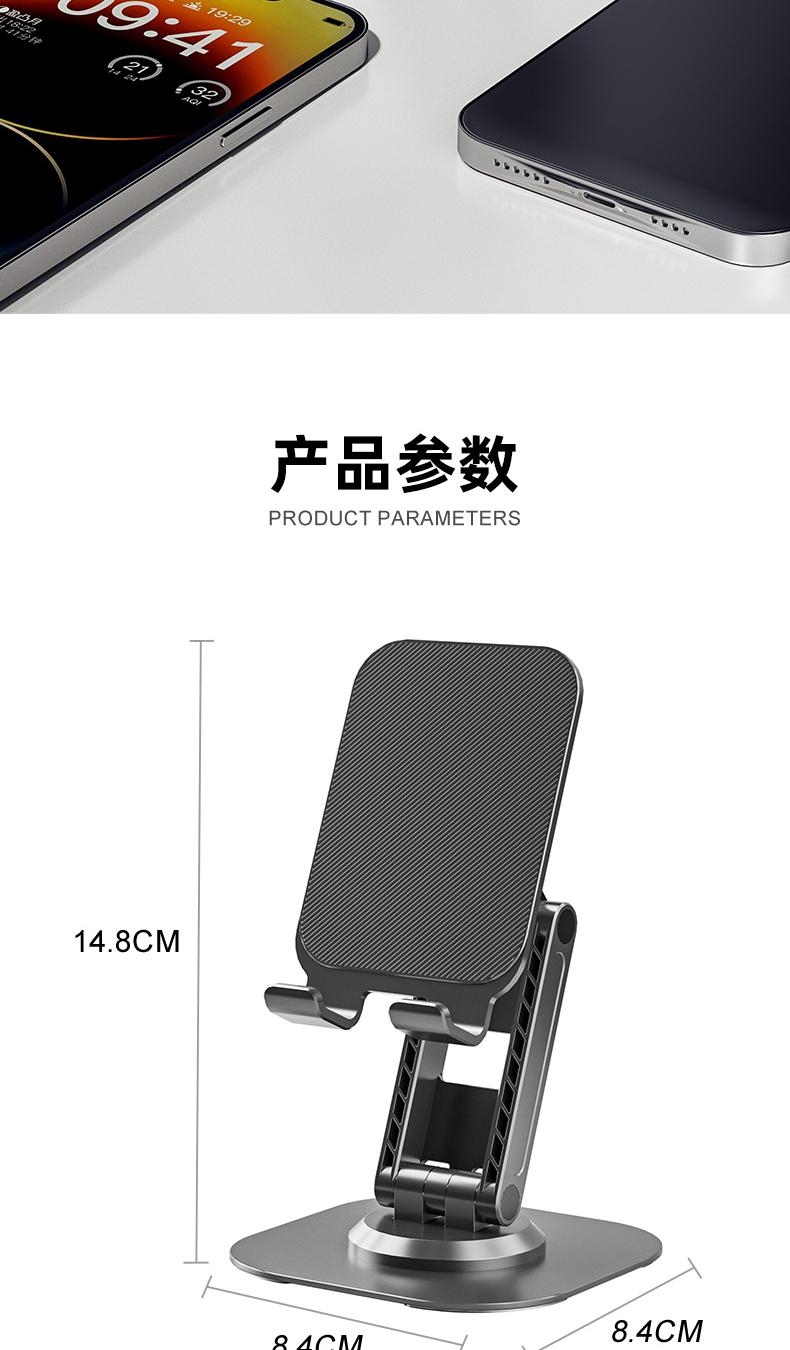 加厚金属、四棱底坐、升级加固支撑杆;360°旋转底座;预留充电口、一体式折叠