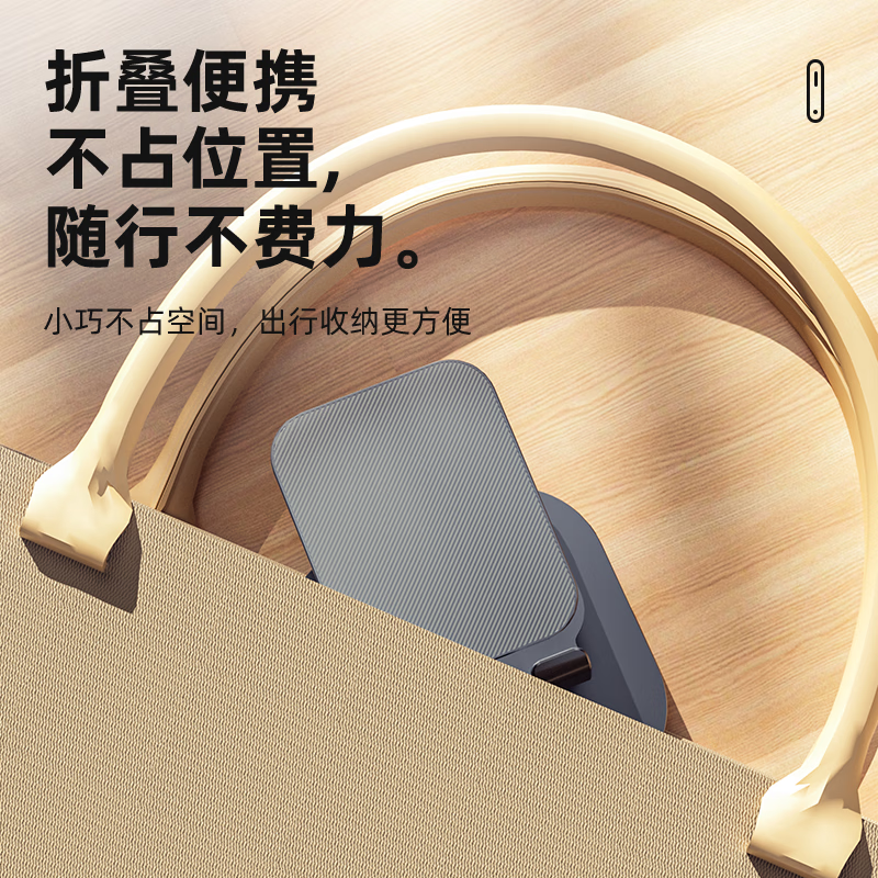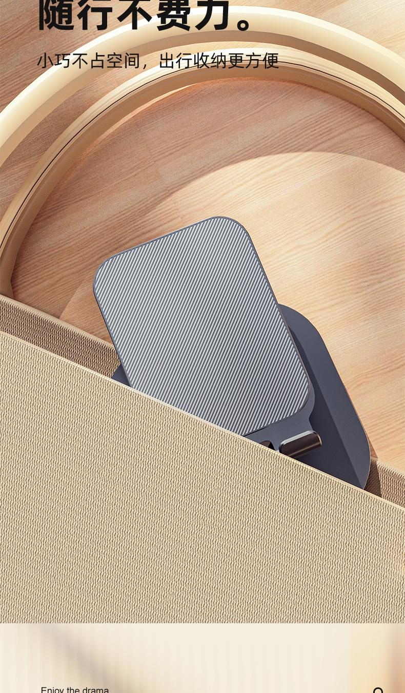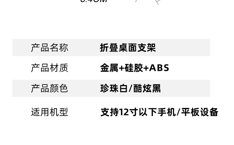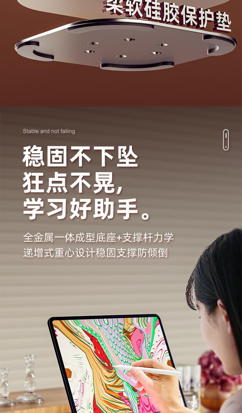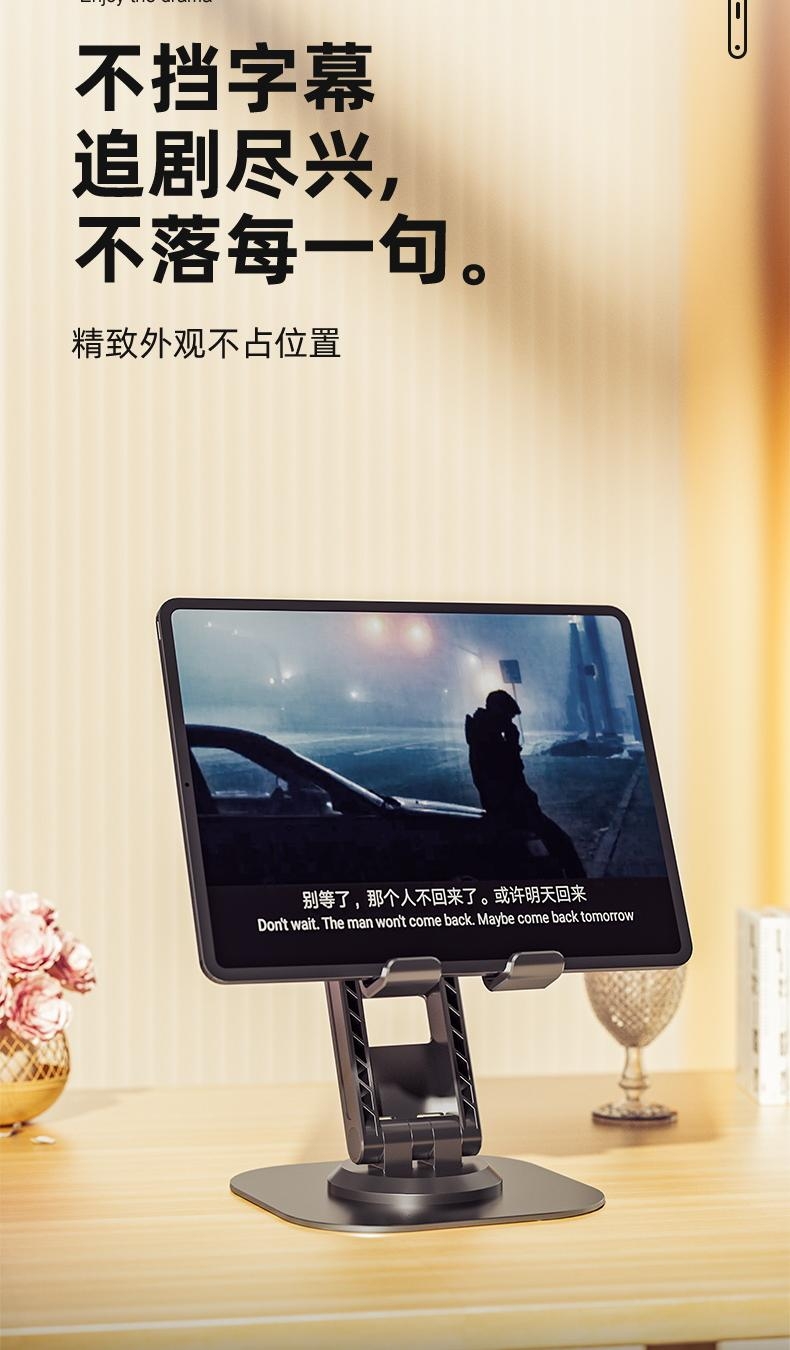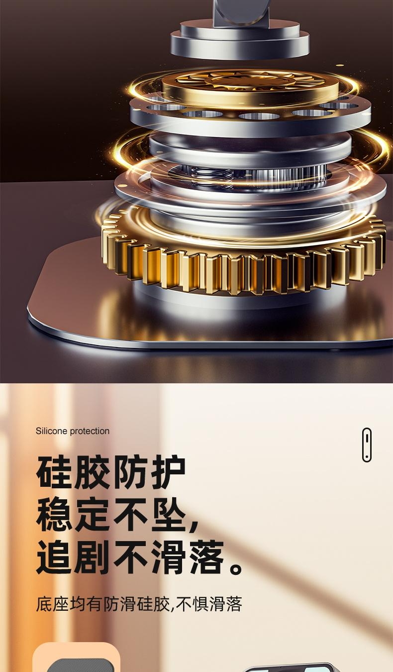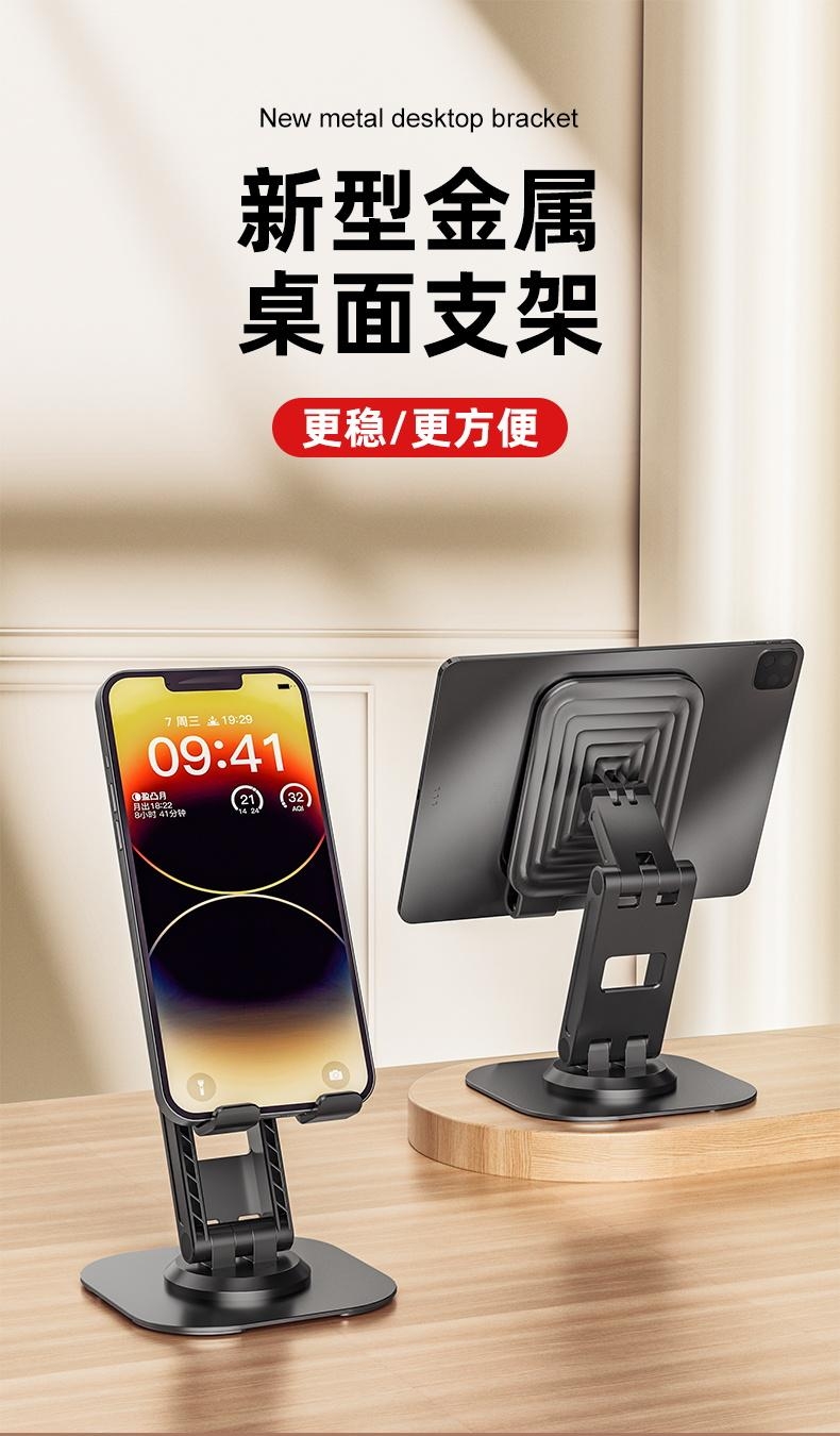 加厚金属、四棱底坐、升级加固支撑杆;360°旋转底座;预留充电口、一体式折叠