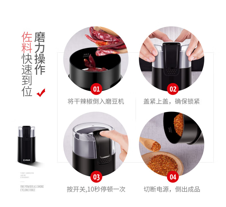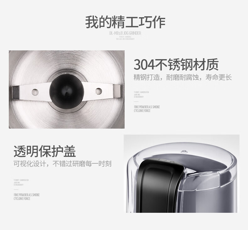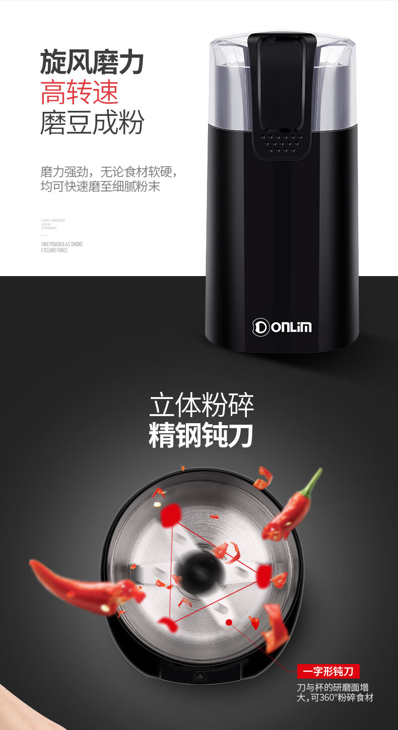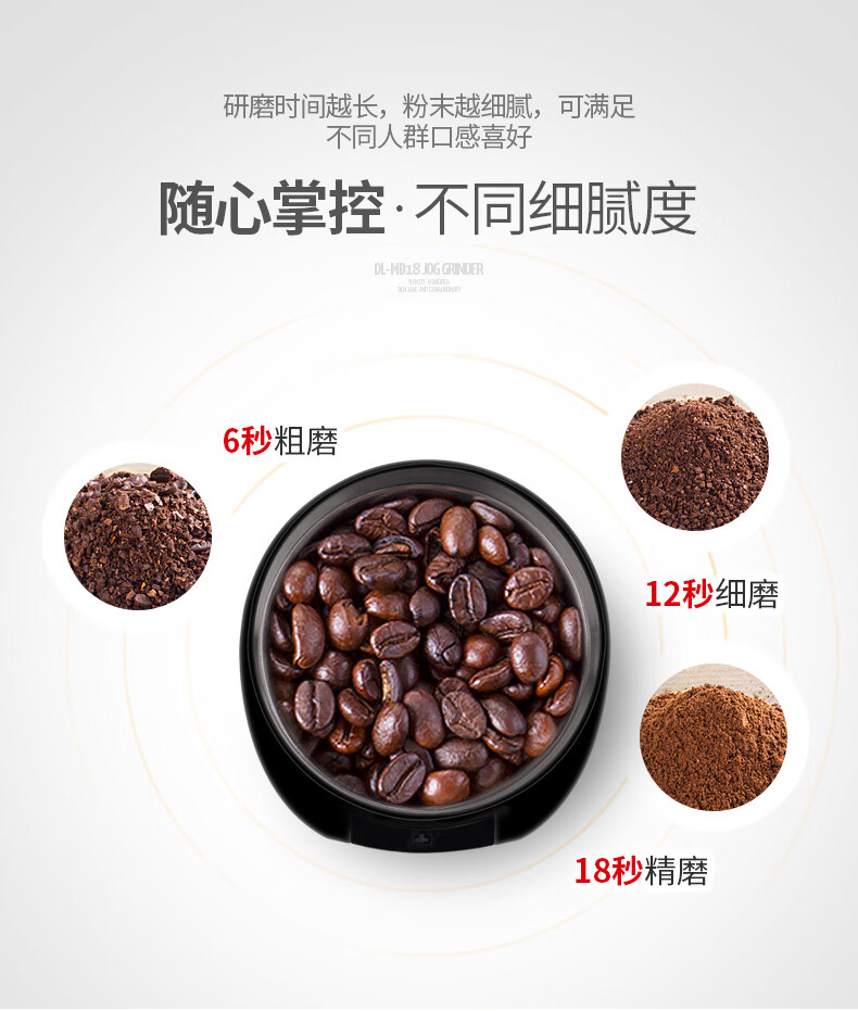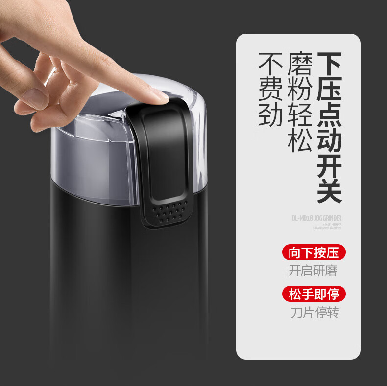 点压式开关,透明顶盖;研磨粗细程度可自由控制;咖啡豆、谷物、豆类、杂粮轻松速磨