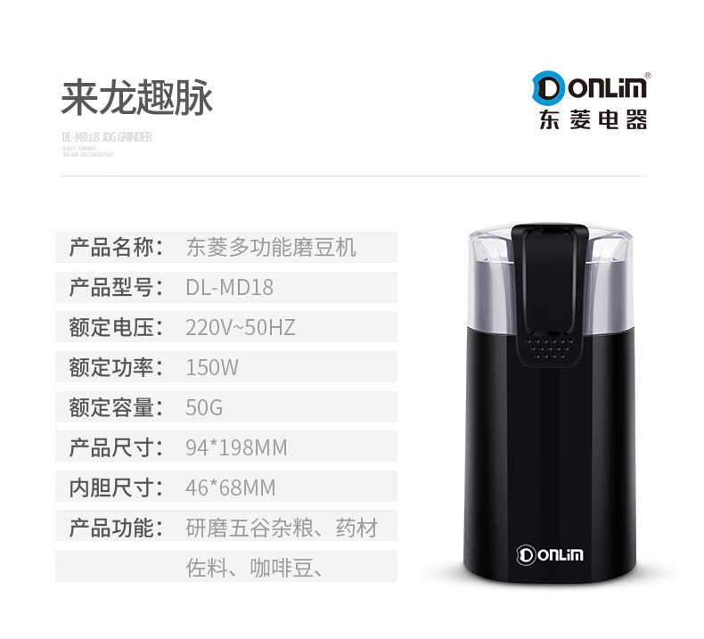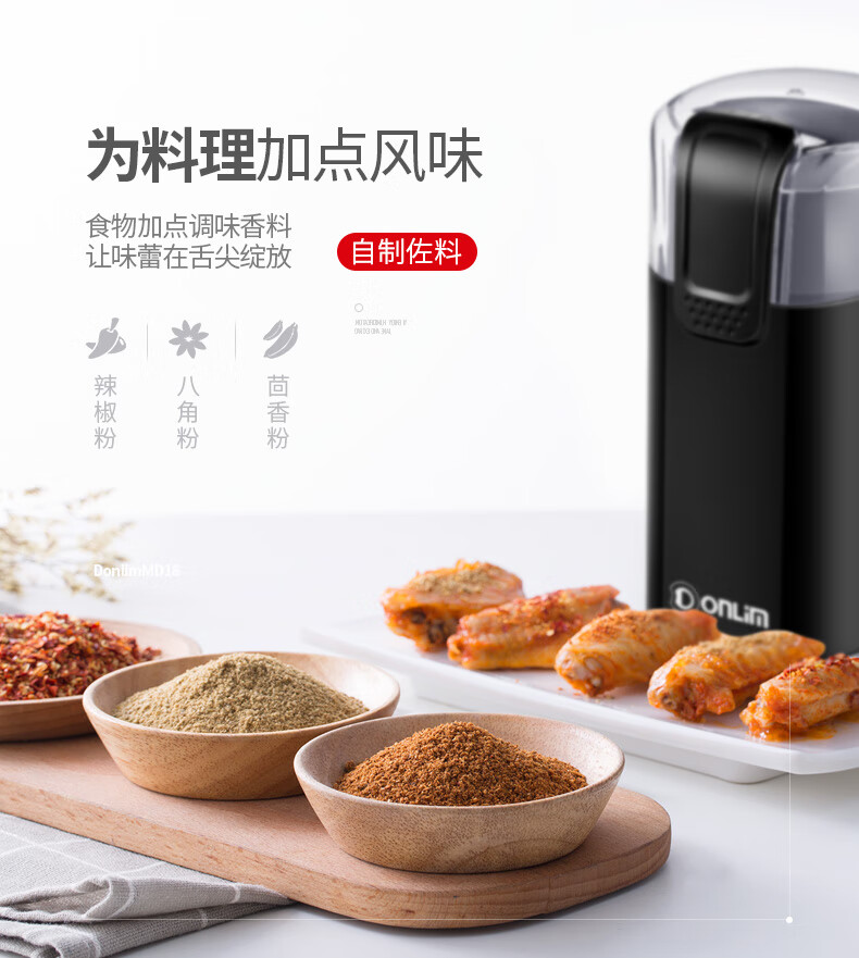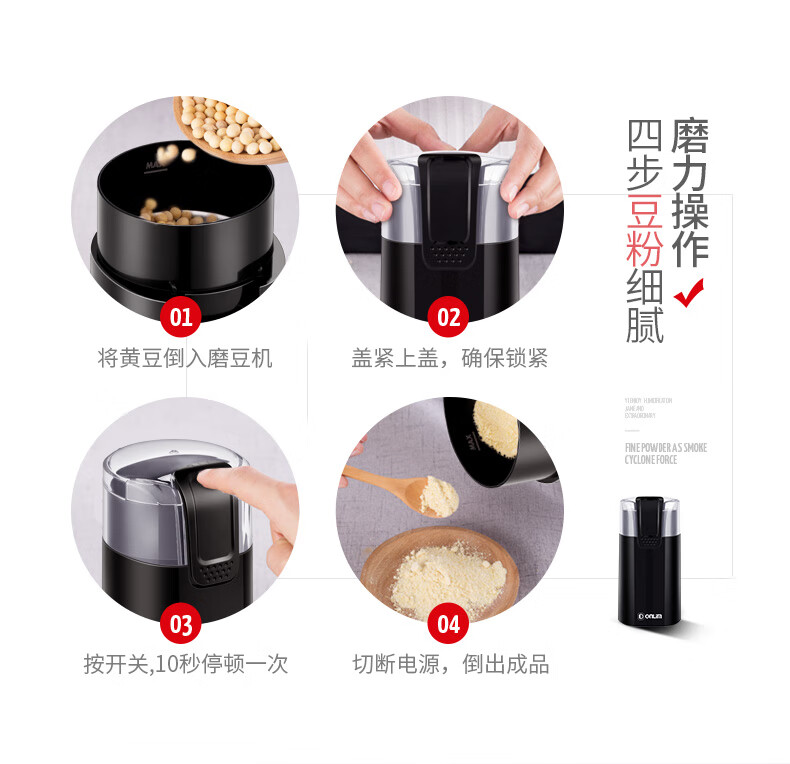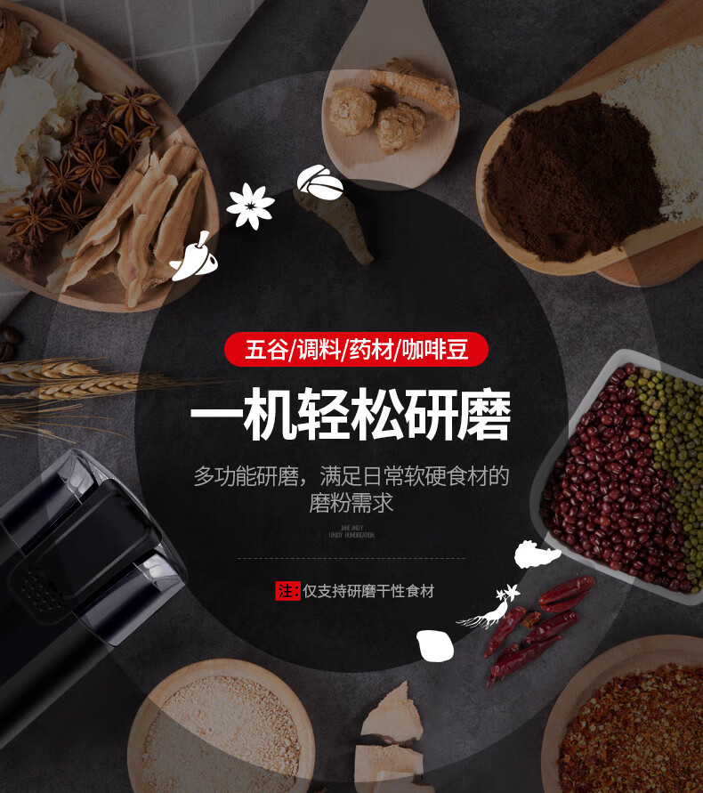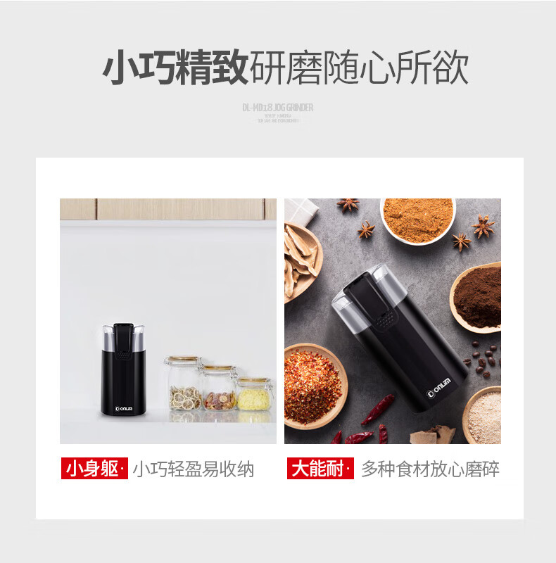 点压式开关,透明顶盖;研磨粗细程度可自由控制;咖啡豆、谷物、豆类、杂粮轻松速磨