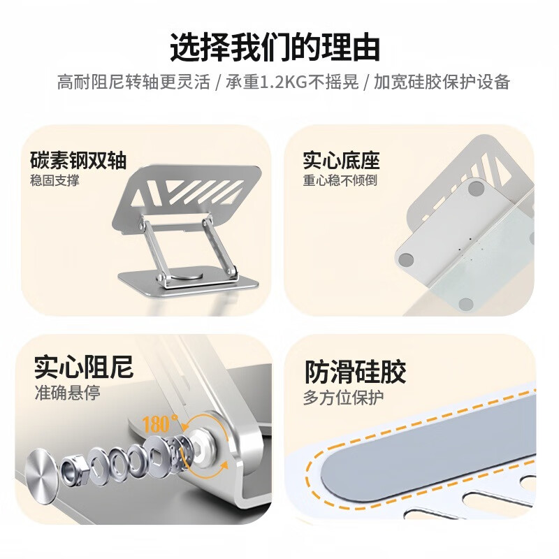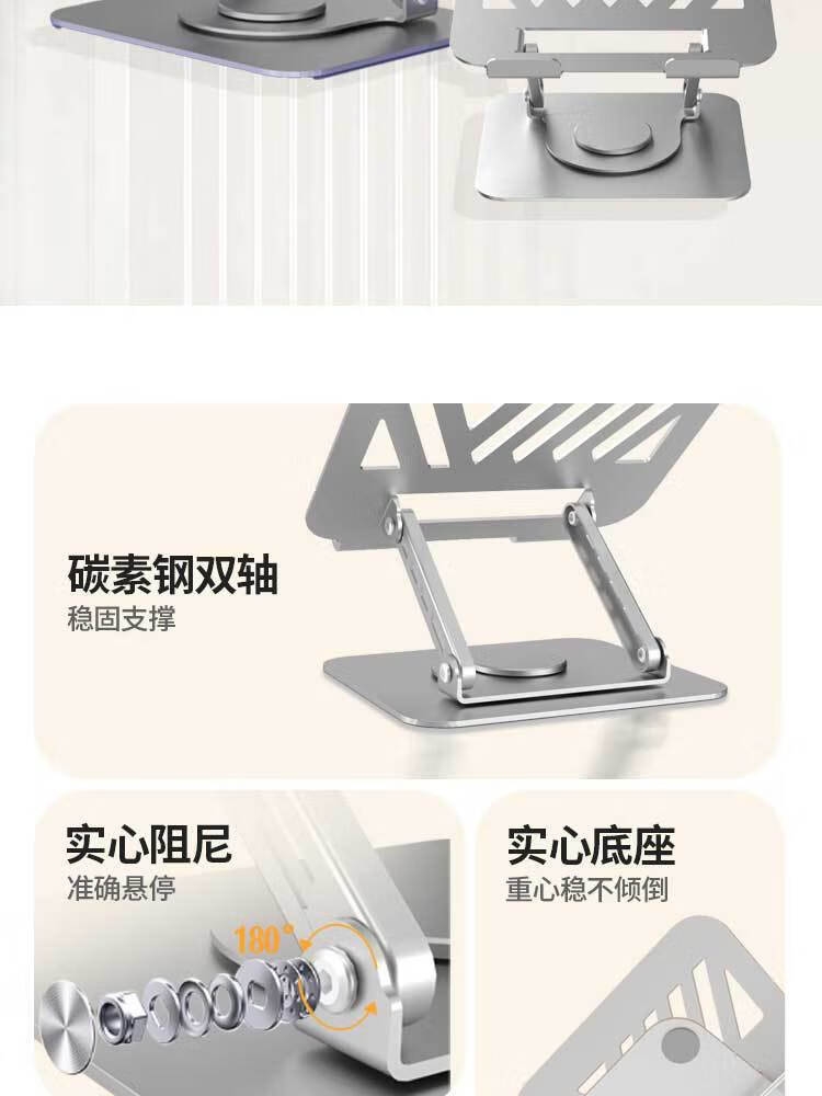 力学大转盘、双轴升降;镀锌钢底座、实心阻尼转轴;哑光金属感、防滑硅胶、
