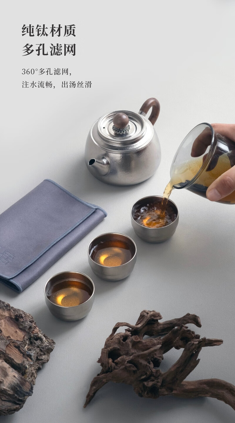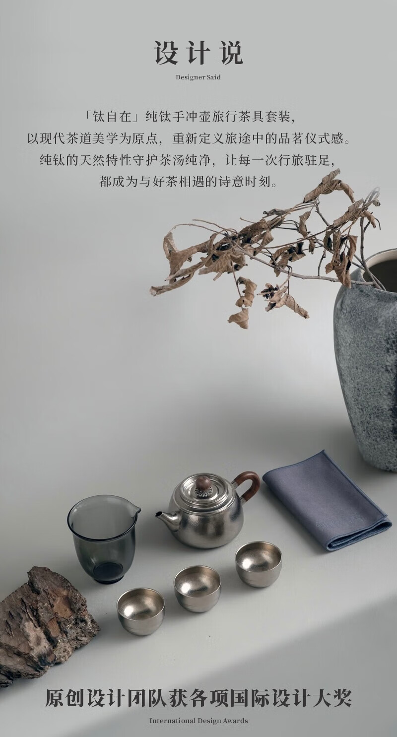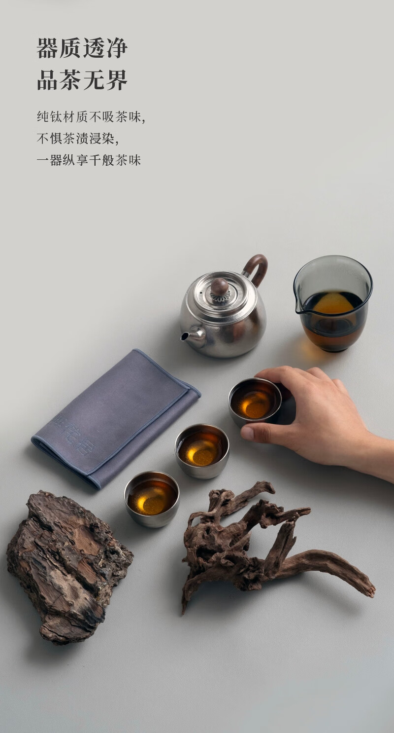 一套成席,随时随地乐享茶事;超轻手感,轻简出行;纯钛材质,喝出茶汤本味