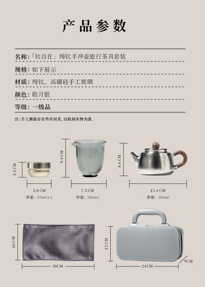 配置容量:钛手冲壶300ml x 1、钛小茶杯35ml x 3、高硼硅玻璃公道杯200 x 1、珊瑚绒鹿皮绒茶巾 x 1、旅行小皮箱 x 1