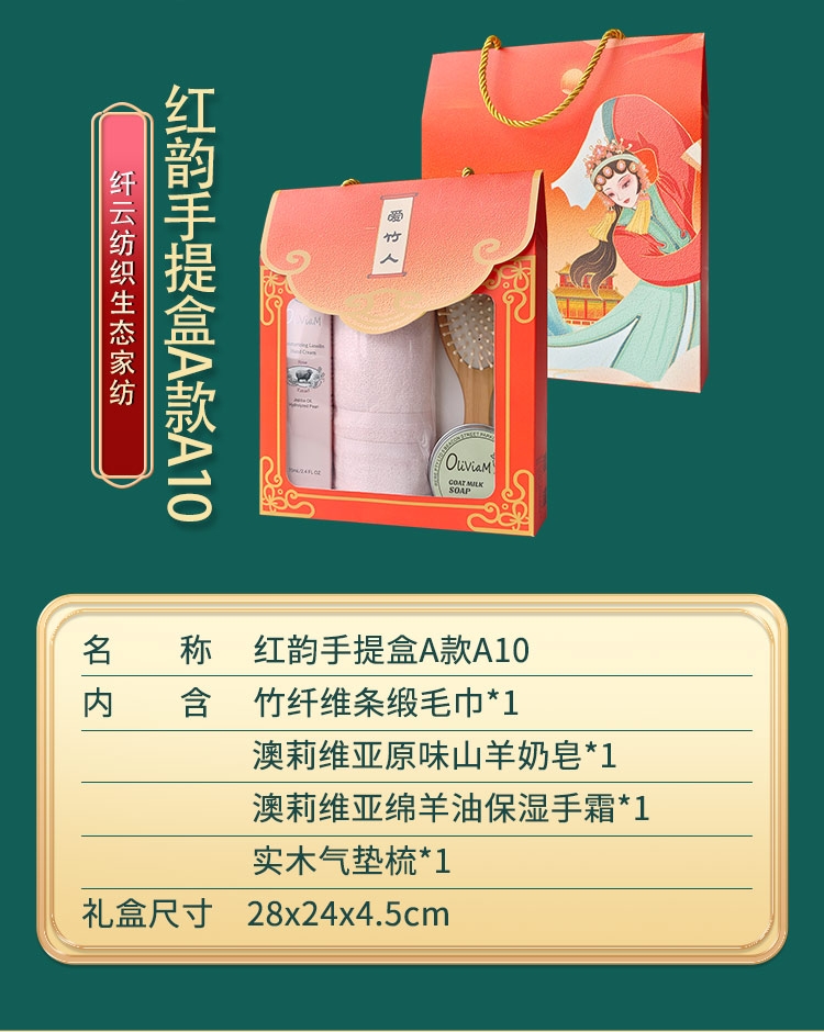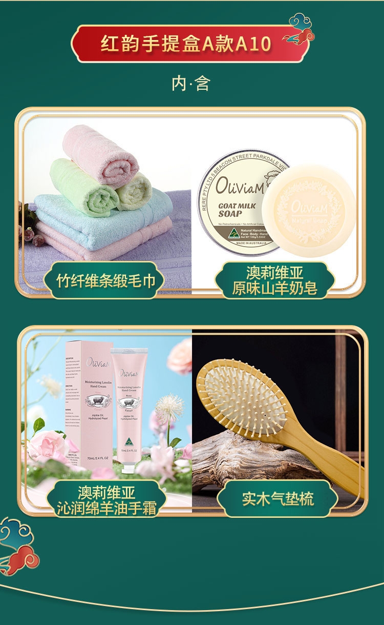 配置清单:澳莉维亚原味山羊奶皂*1 澳莉维亚娇柔绵羊油保湿手霜(玫瑰味)*1 竹纤维条缎毛巾*1 实木气垫梳子*1