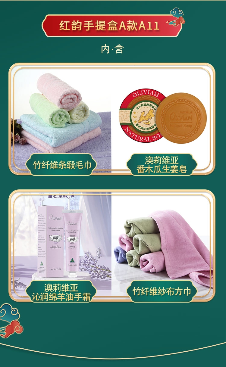 配置清单:澳莉维亚番木瓜生姜皂*1 澳莉维亚沁润绵羊油手霜(薰衣草味)*1 竹纤维条缎毛巾*1 竹纤维纱布方巾*1