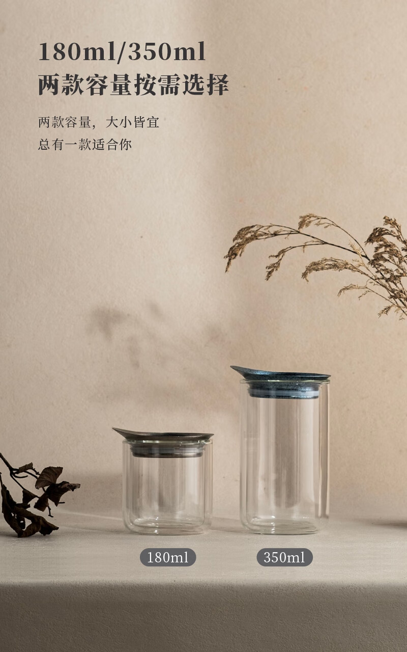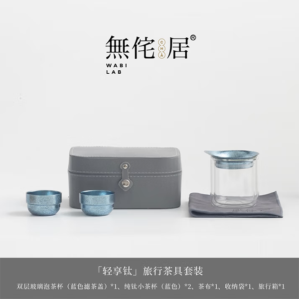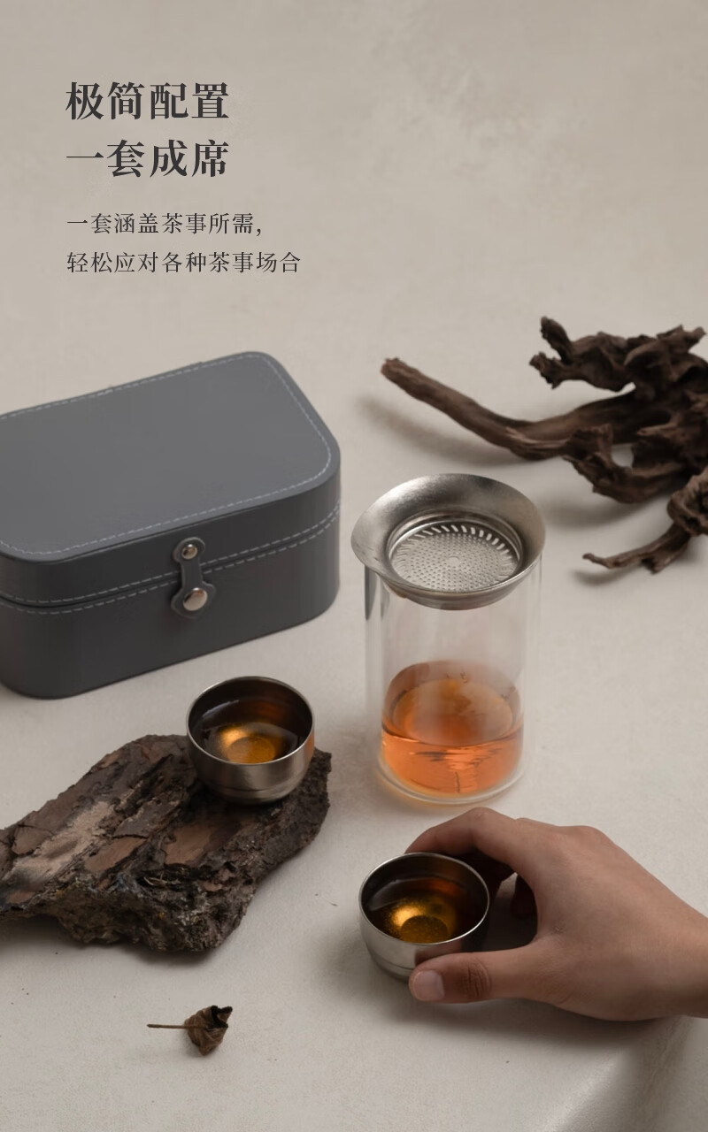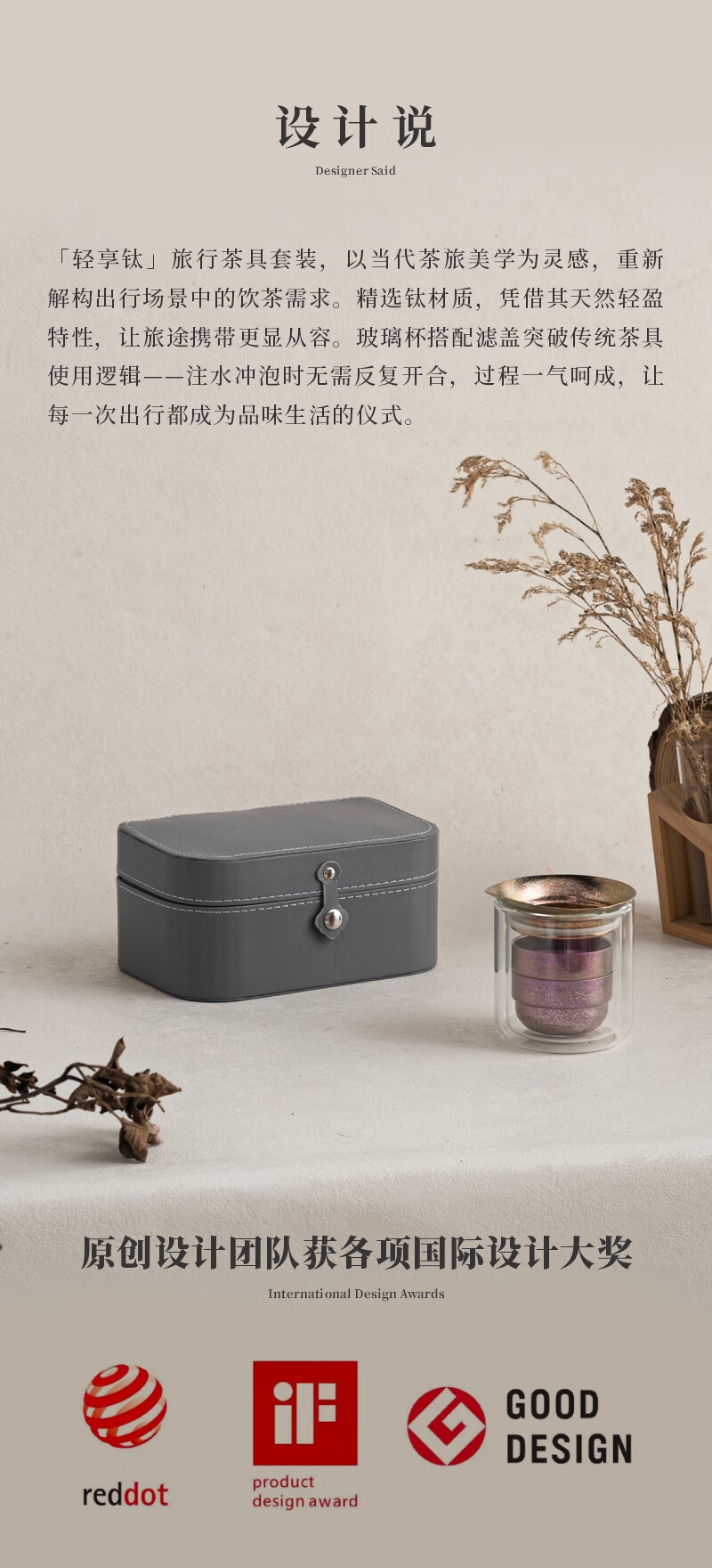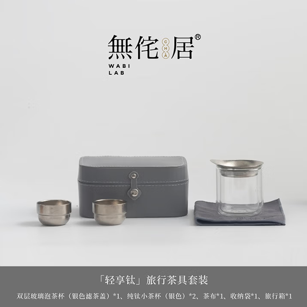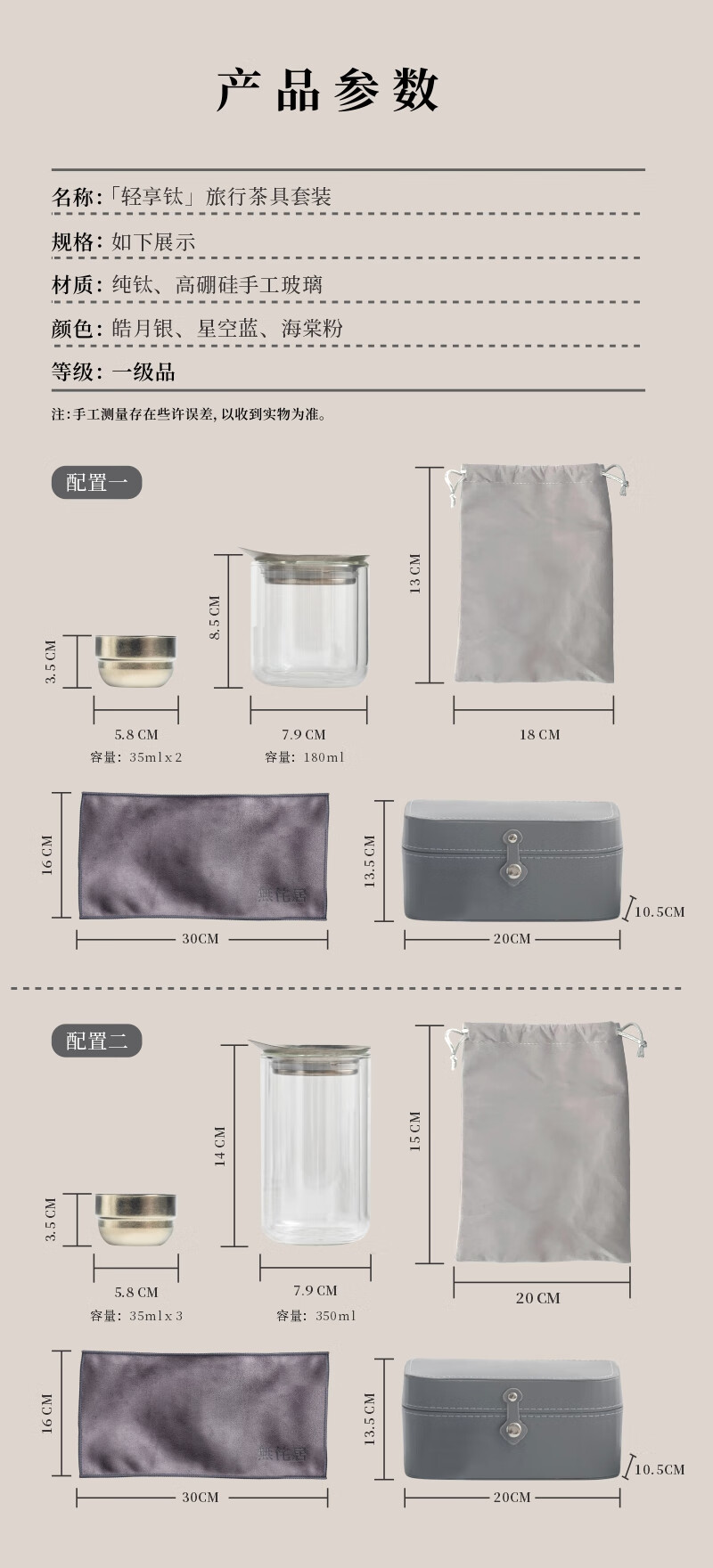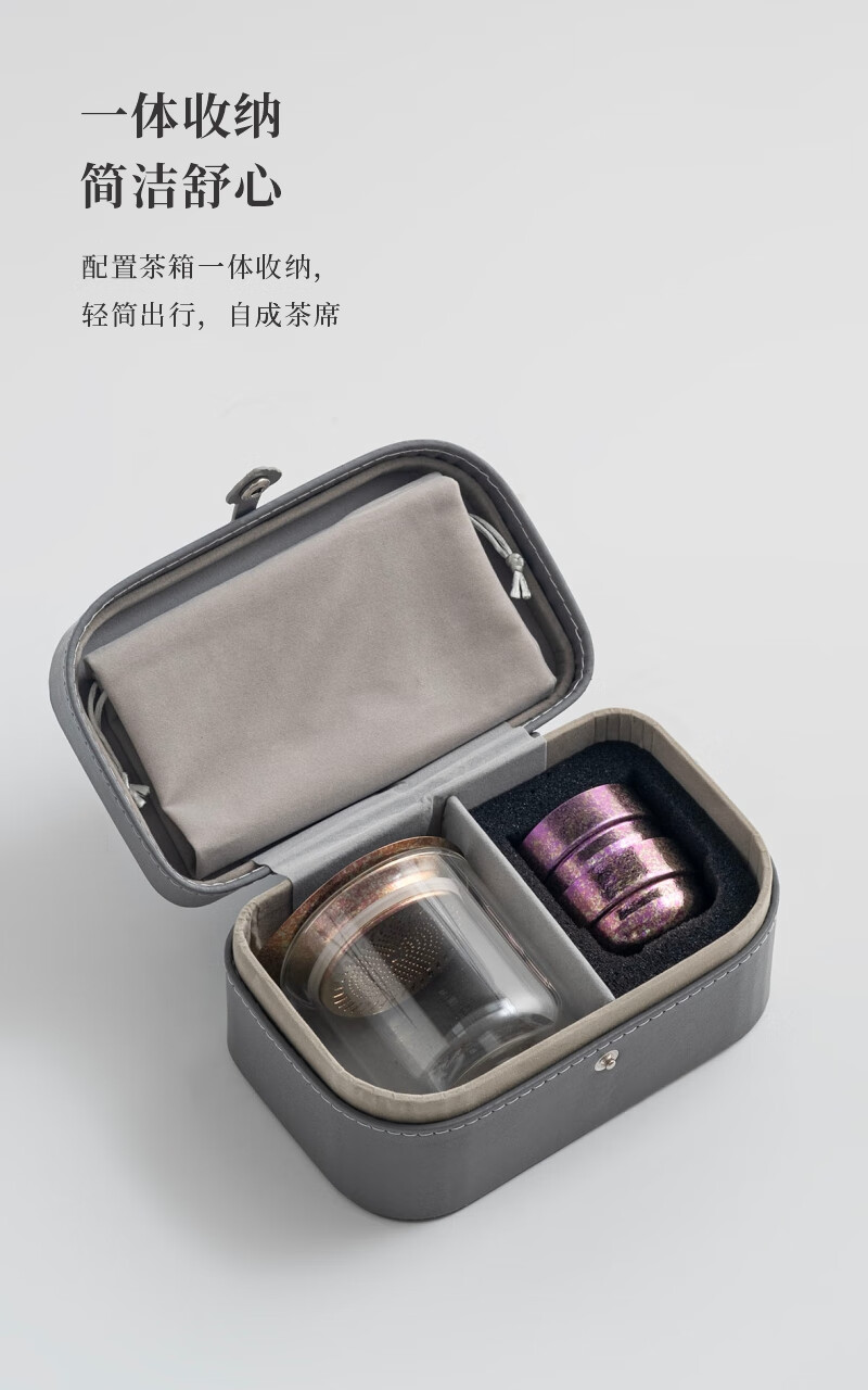 配置容量:高硼硅双层玻璃泡茶杯(钛滤网盖)180ml x 1、钛小茶杯35ml x 2、 绒布袋 x 1、珊瑚绒鹿皮绒茶巾 x 1、旅行小皮箱 x 1