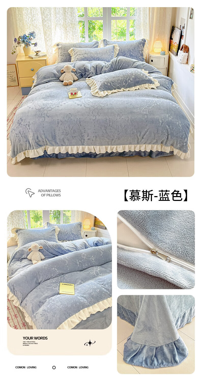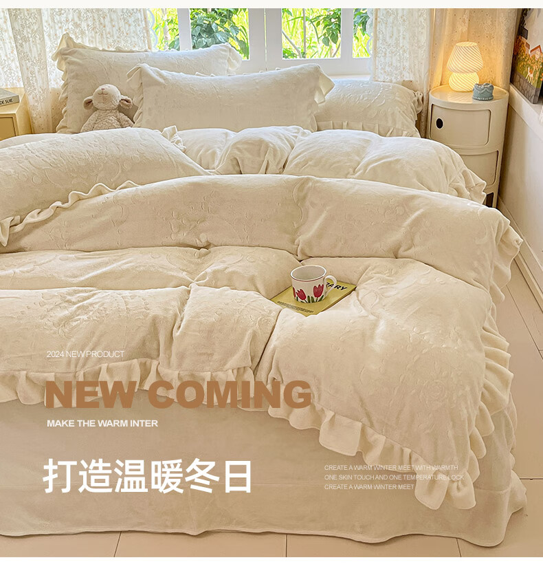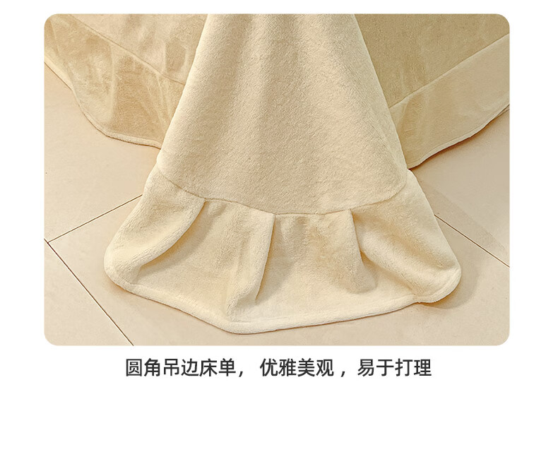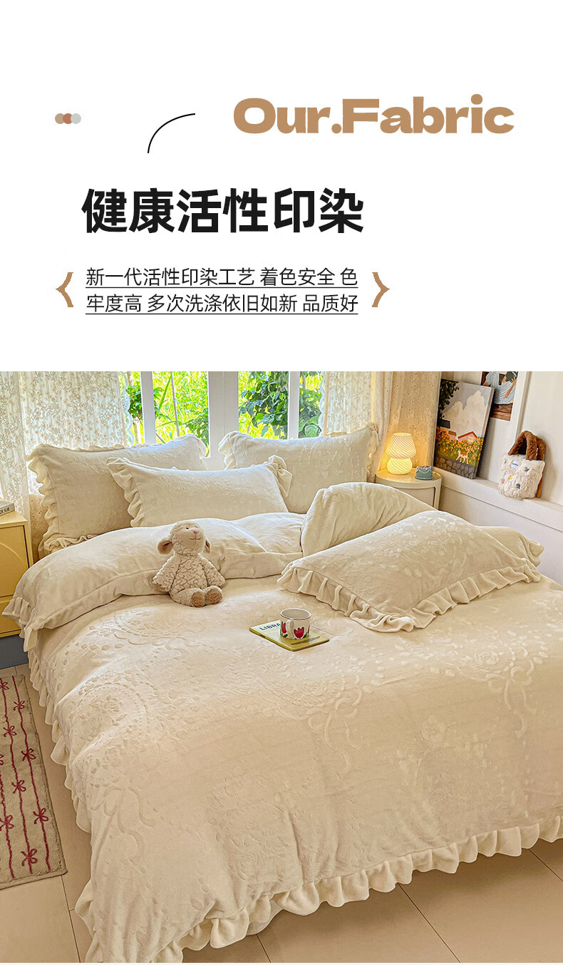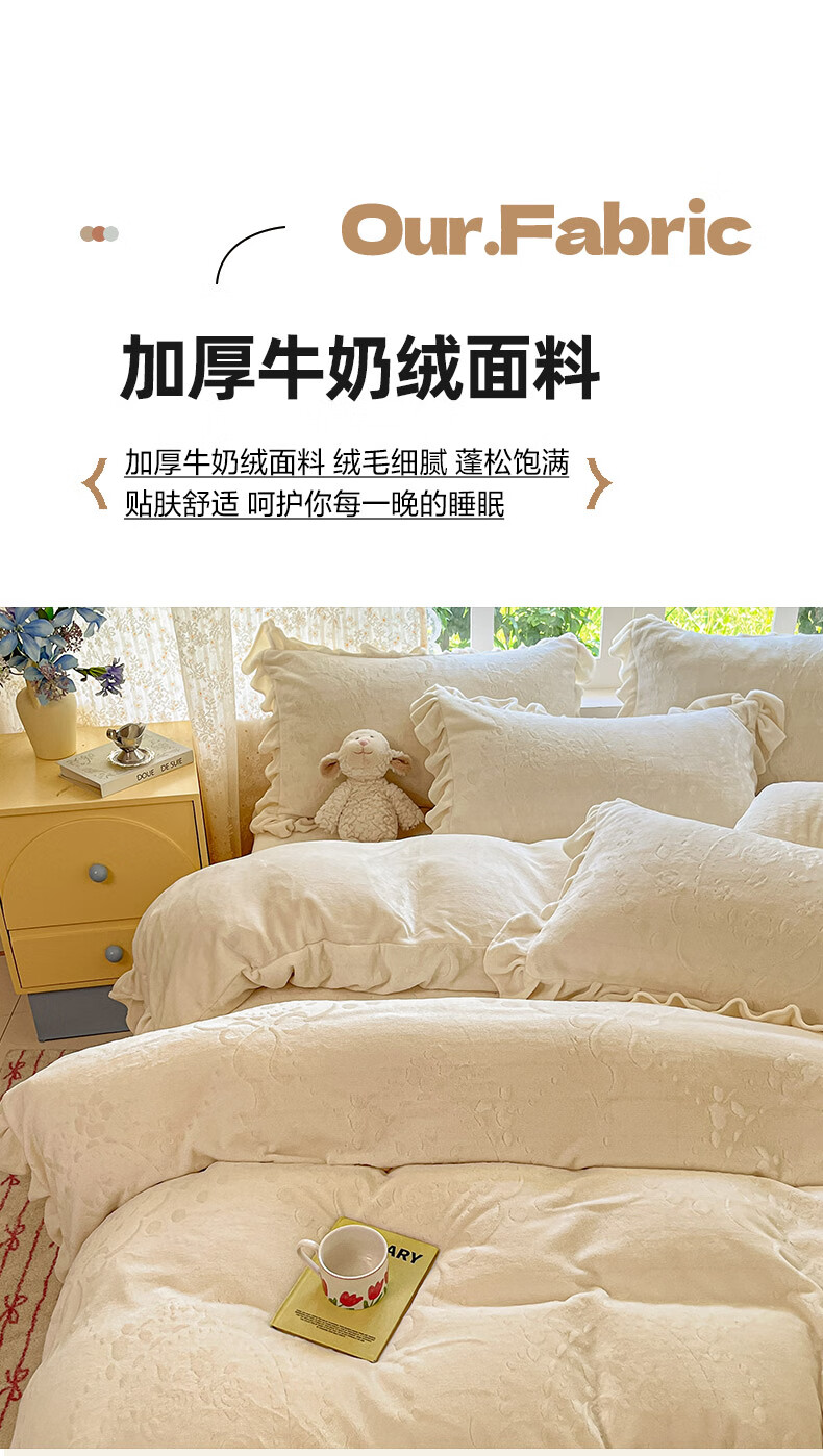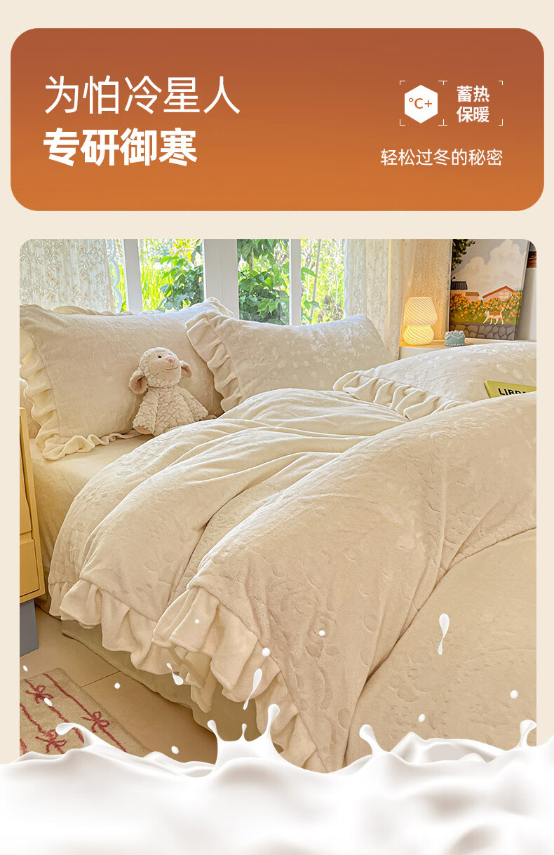 牛奶绒床单款花边款四件套,热情与温暖的综合体;牛奶绒面料 让保暖持续更久些 ;绒底厚实牢固 舒适保暖